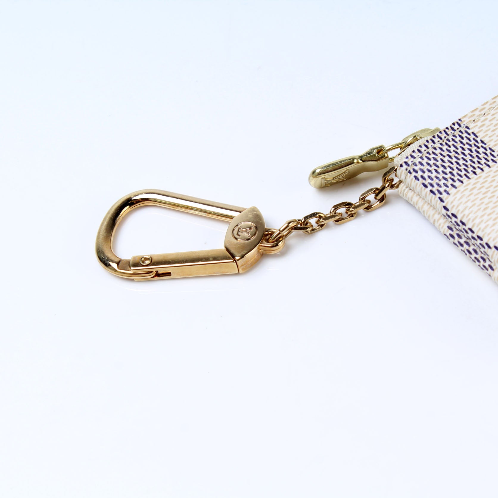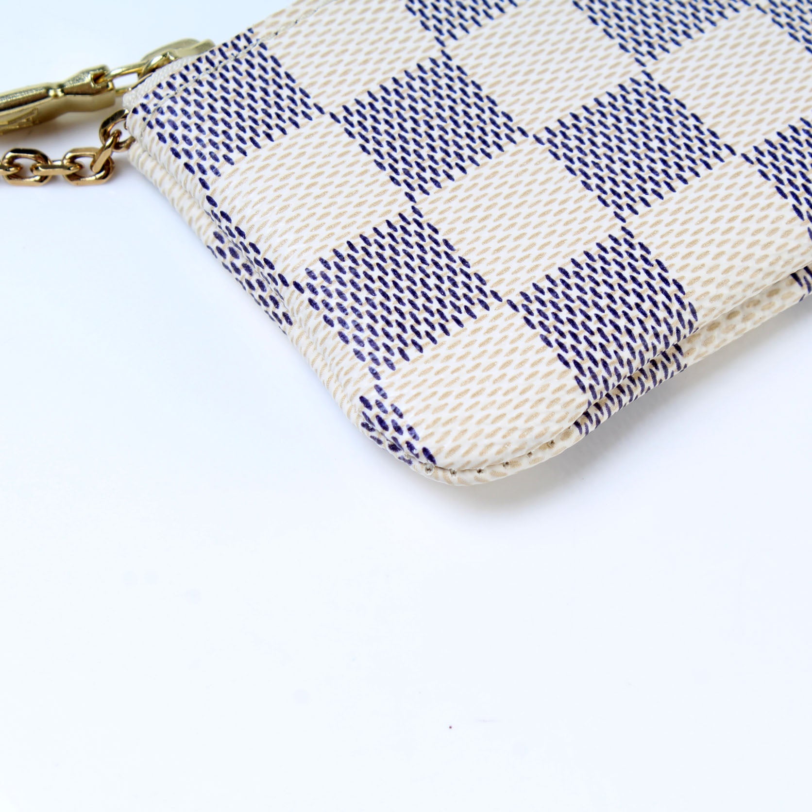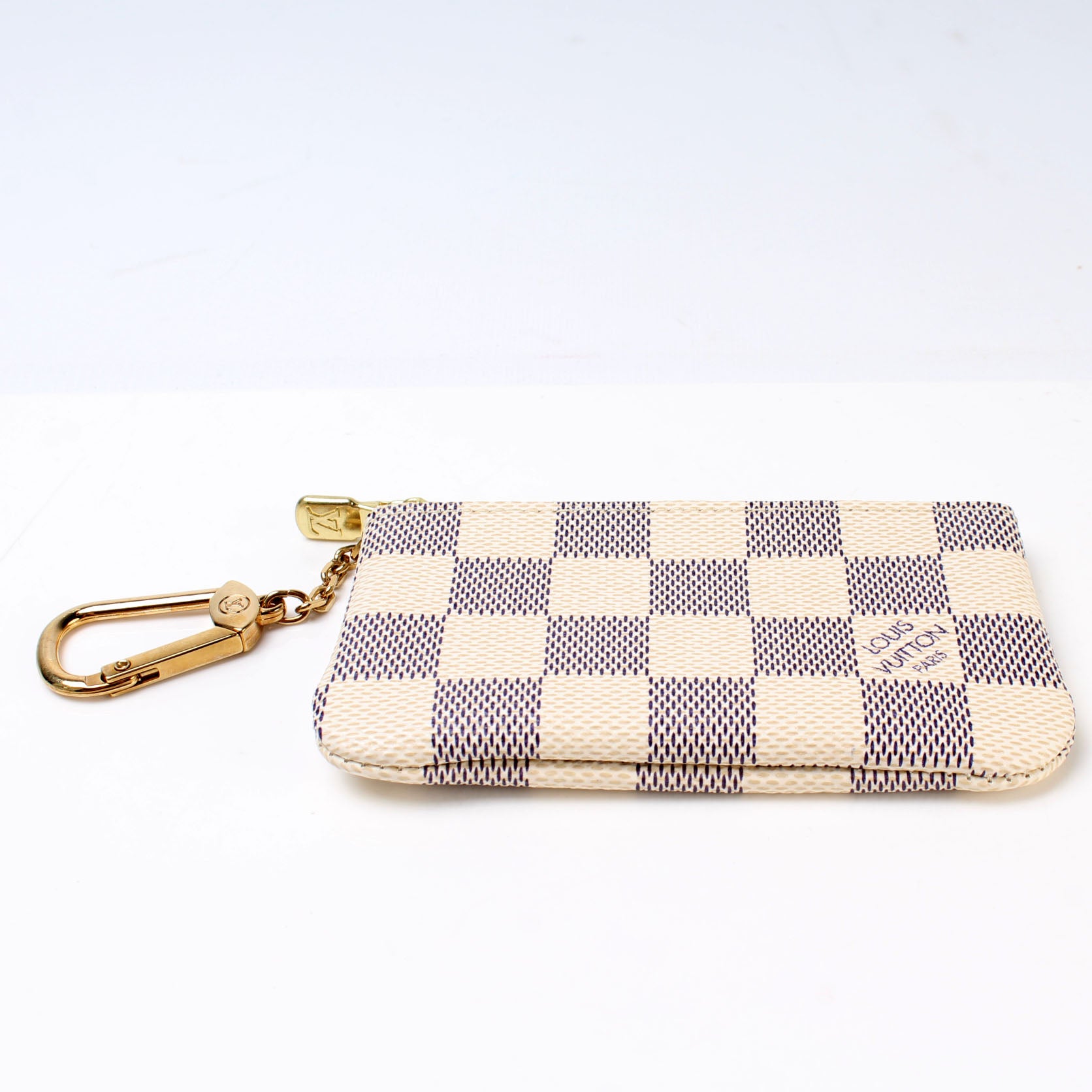 This pre-owned Louis Vuitton Pochette Cles is guaranteed 100% authentic. The exterior is in the classic Louis Vuitton Damier Azur coated canvas.