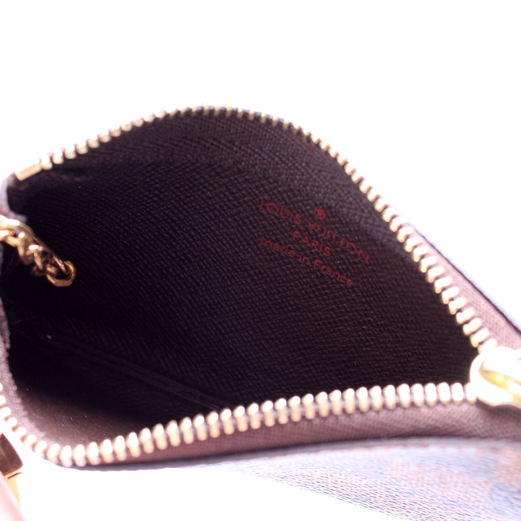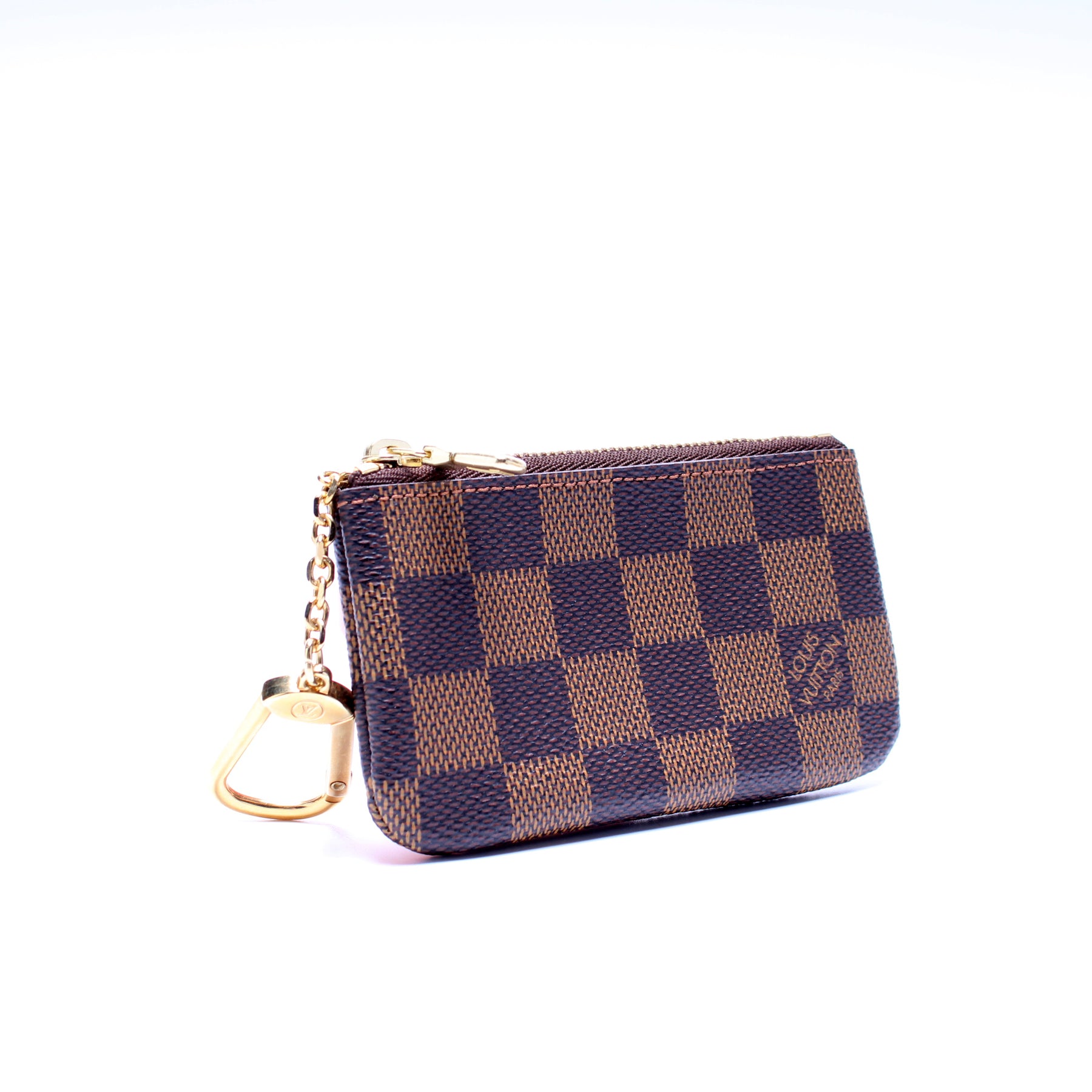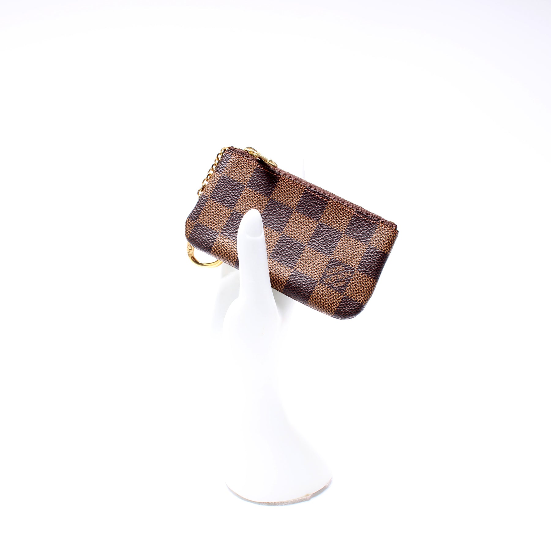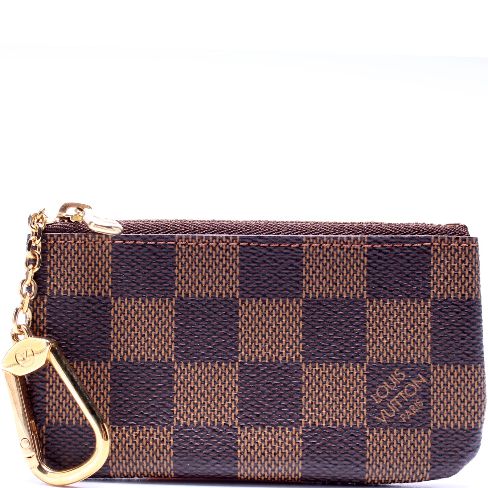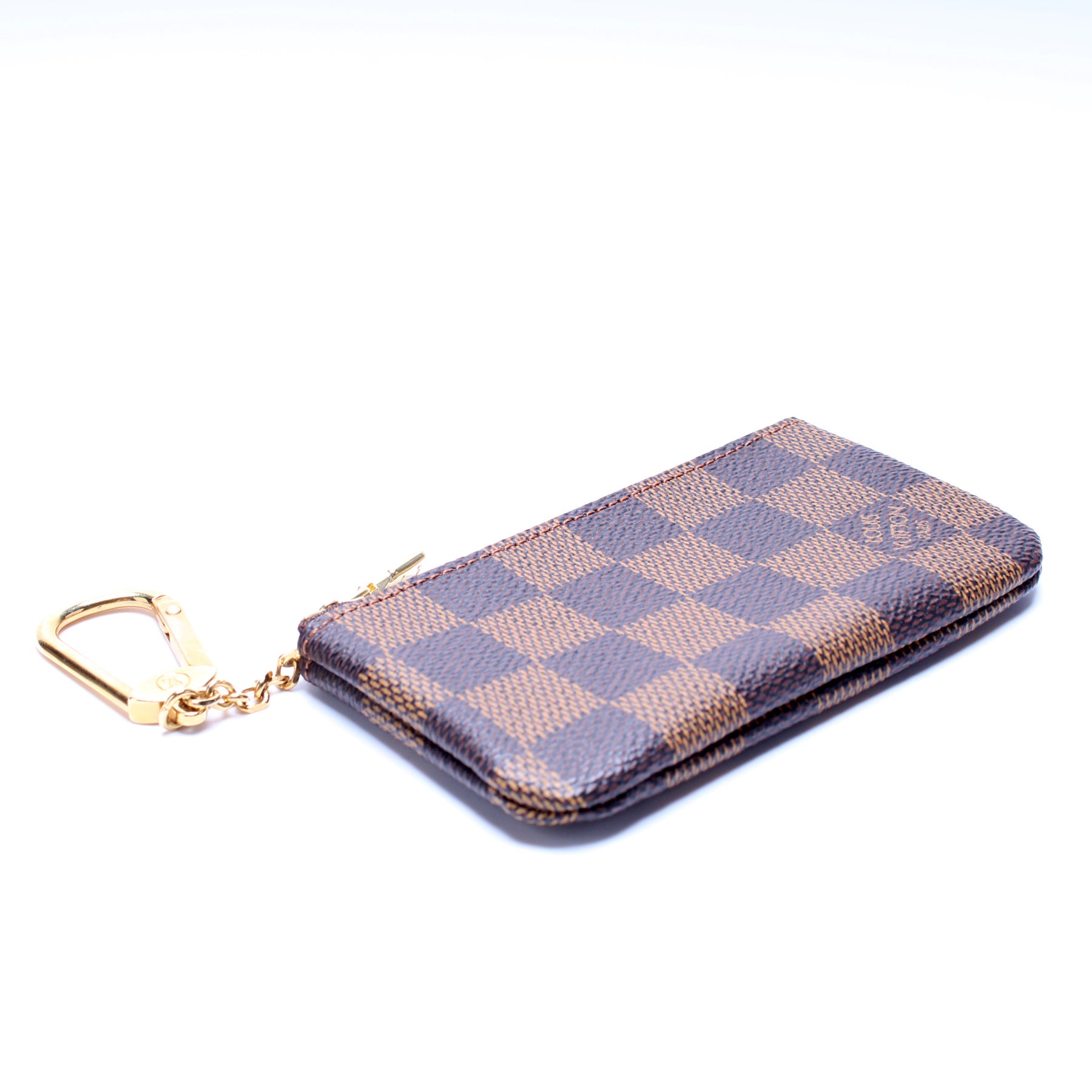 This pre-owned Louis Vuitton Pochette Cles is guaranteed 100% authentic. The exterior is in the classic Louis Vuitton Damier Ebene coated canvas.