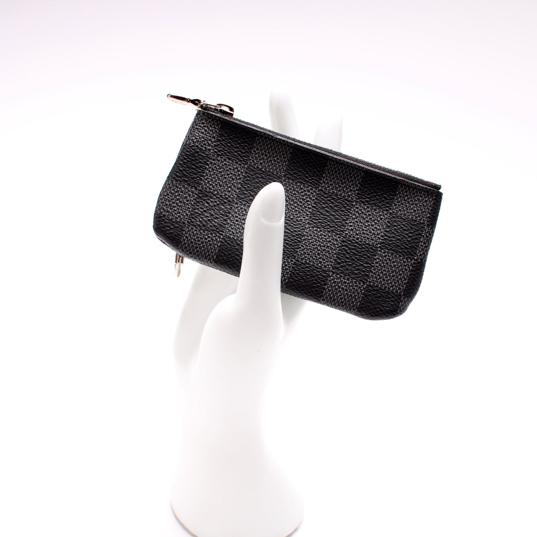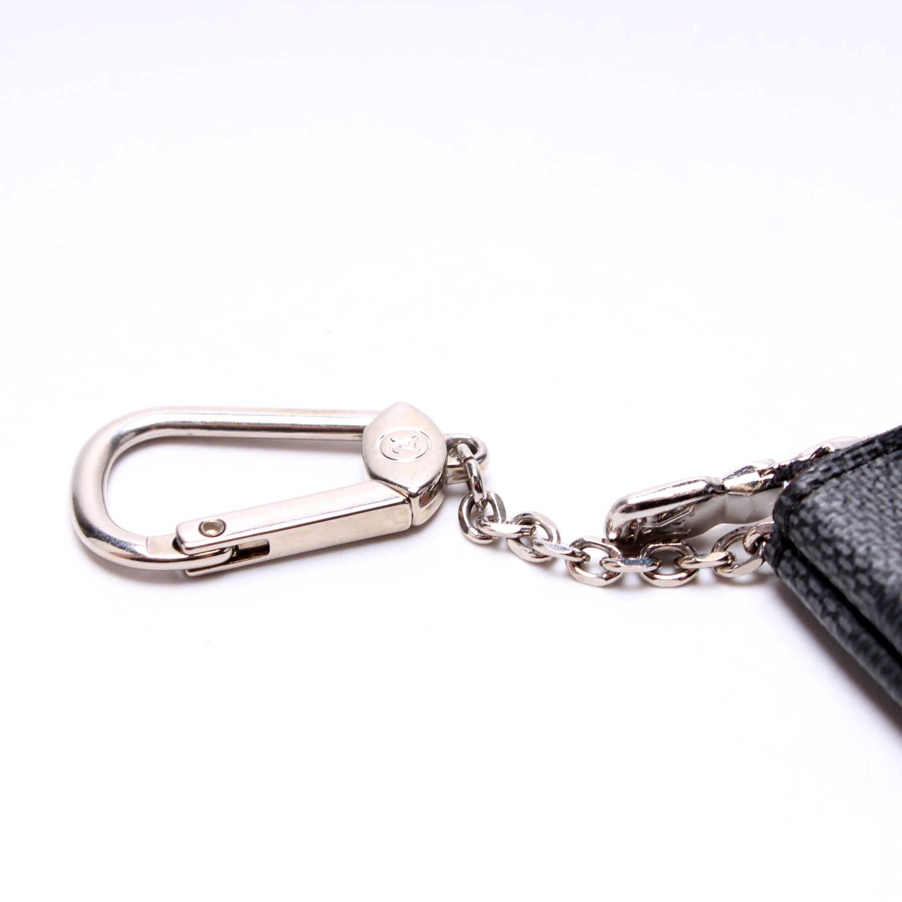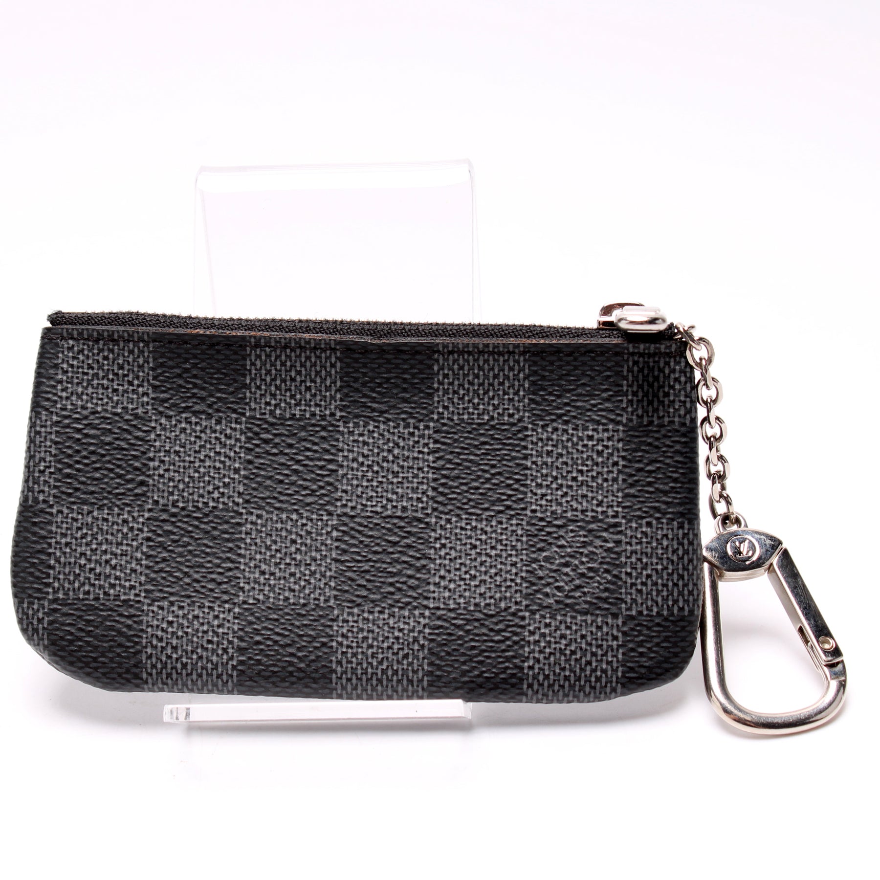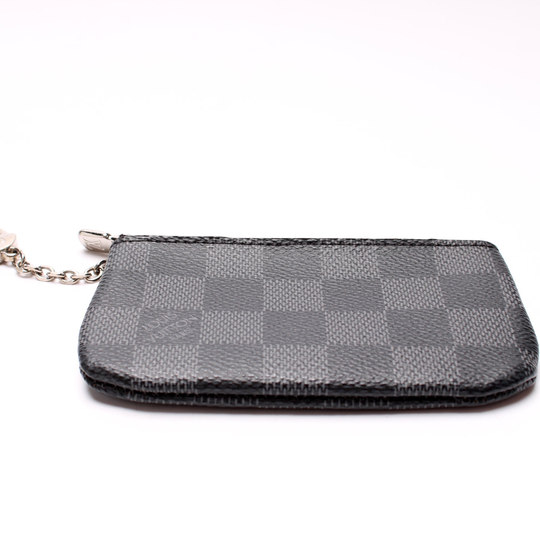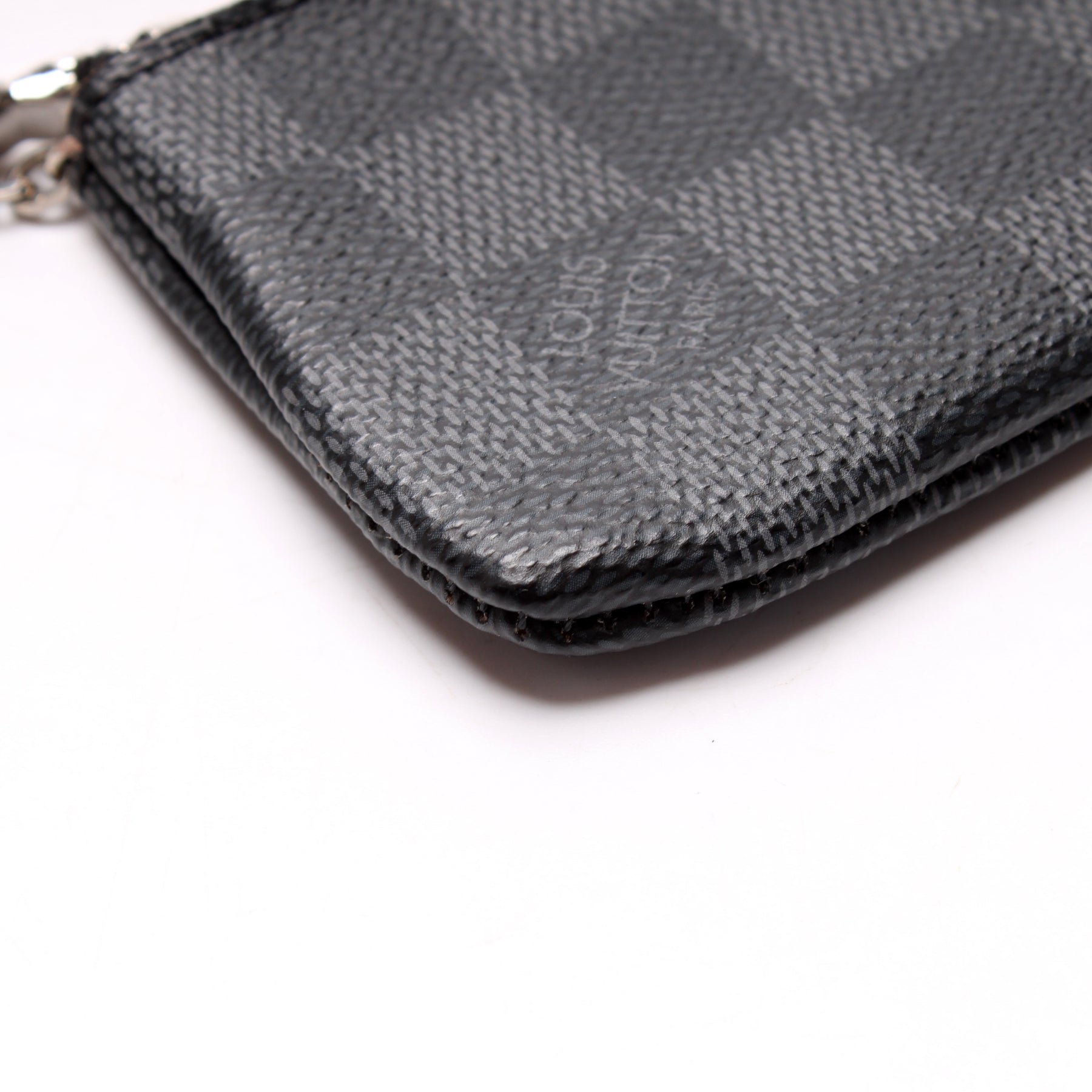 This pre-owned Louis Vuitton Pochette Cles is guaranteed 100% authentic. The exterior is in the classic Louis Vuitton Damier Graphite coated canvas.
