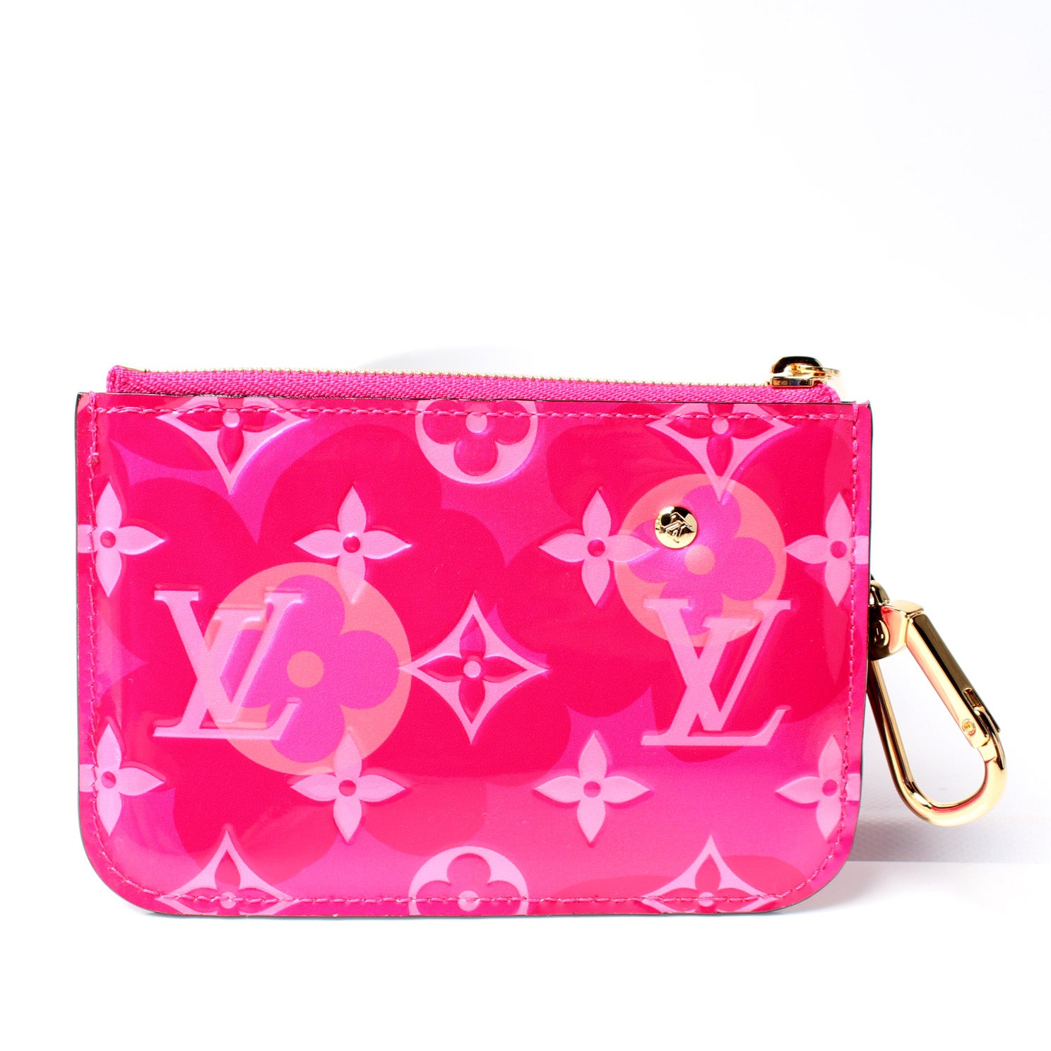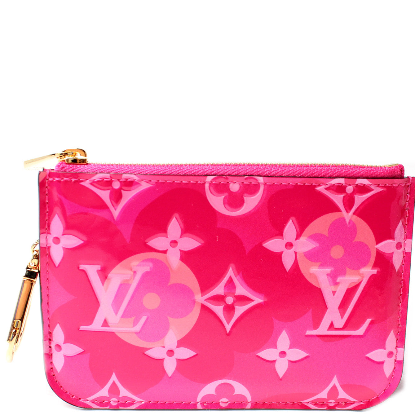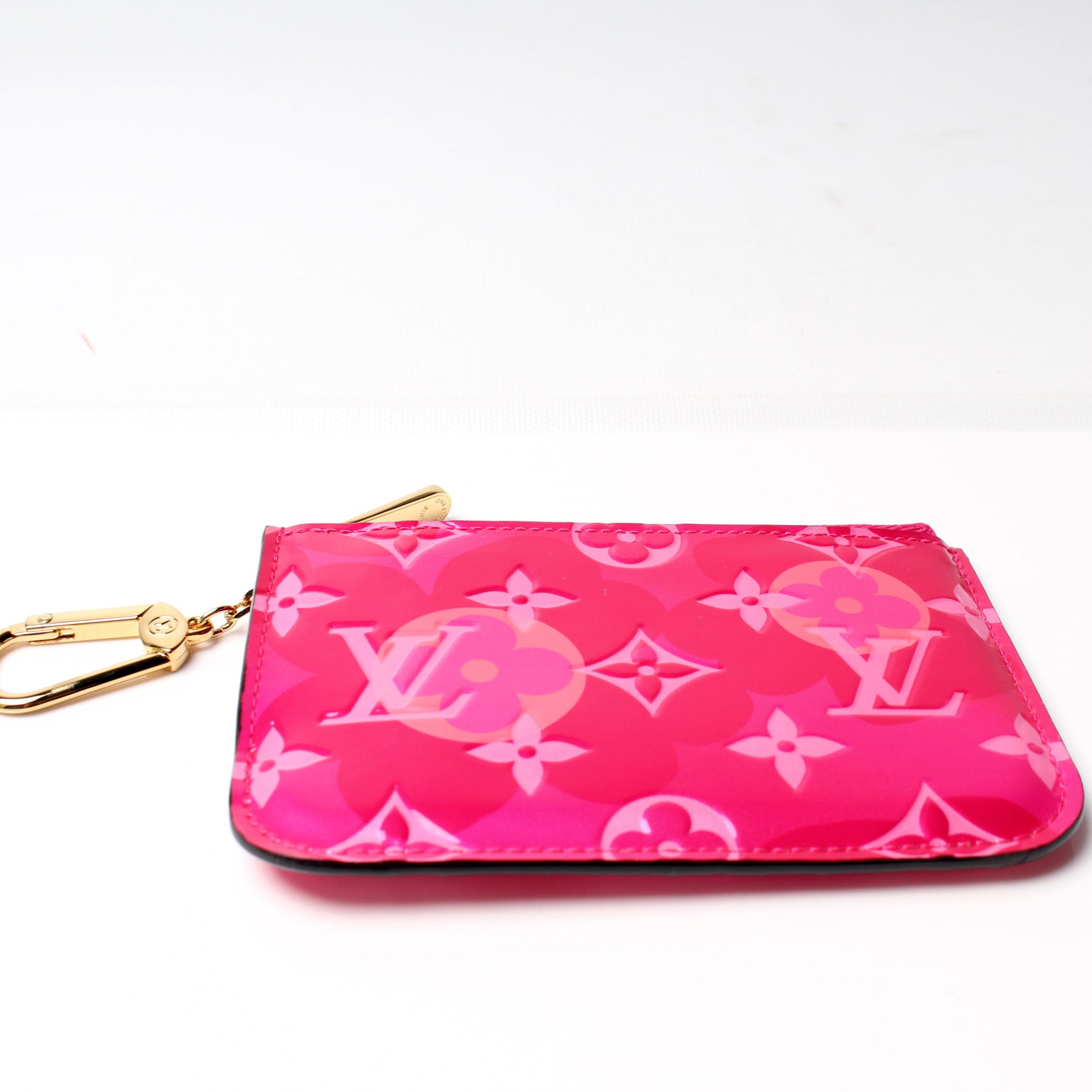 This pre-owned Louis Vuitton Pochette Cles Valentine is guaranteed 100% authentic. The exterior is in the classic Louis Vuitton Valentine print Vernis leather.