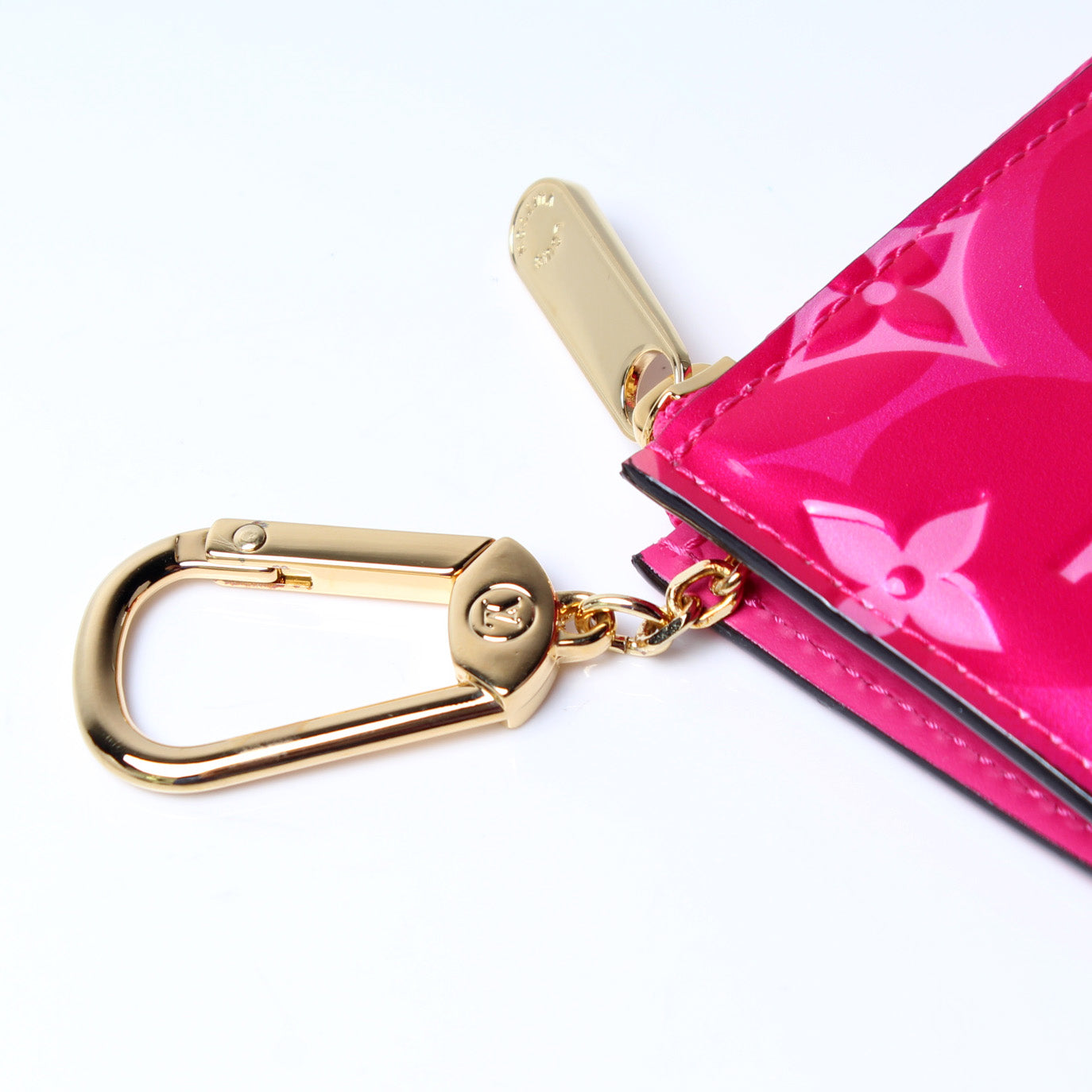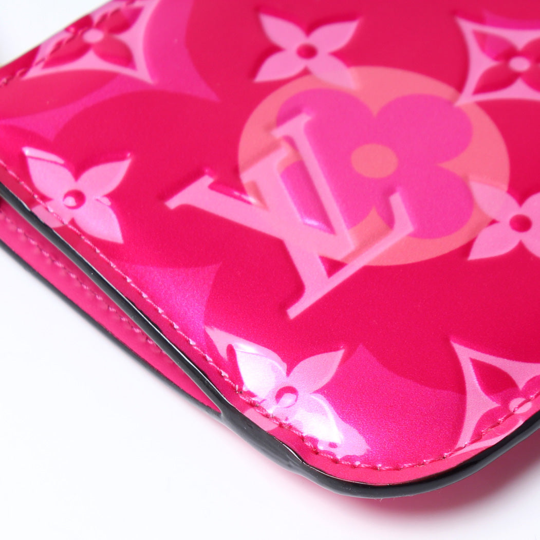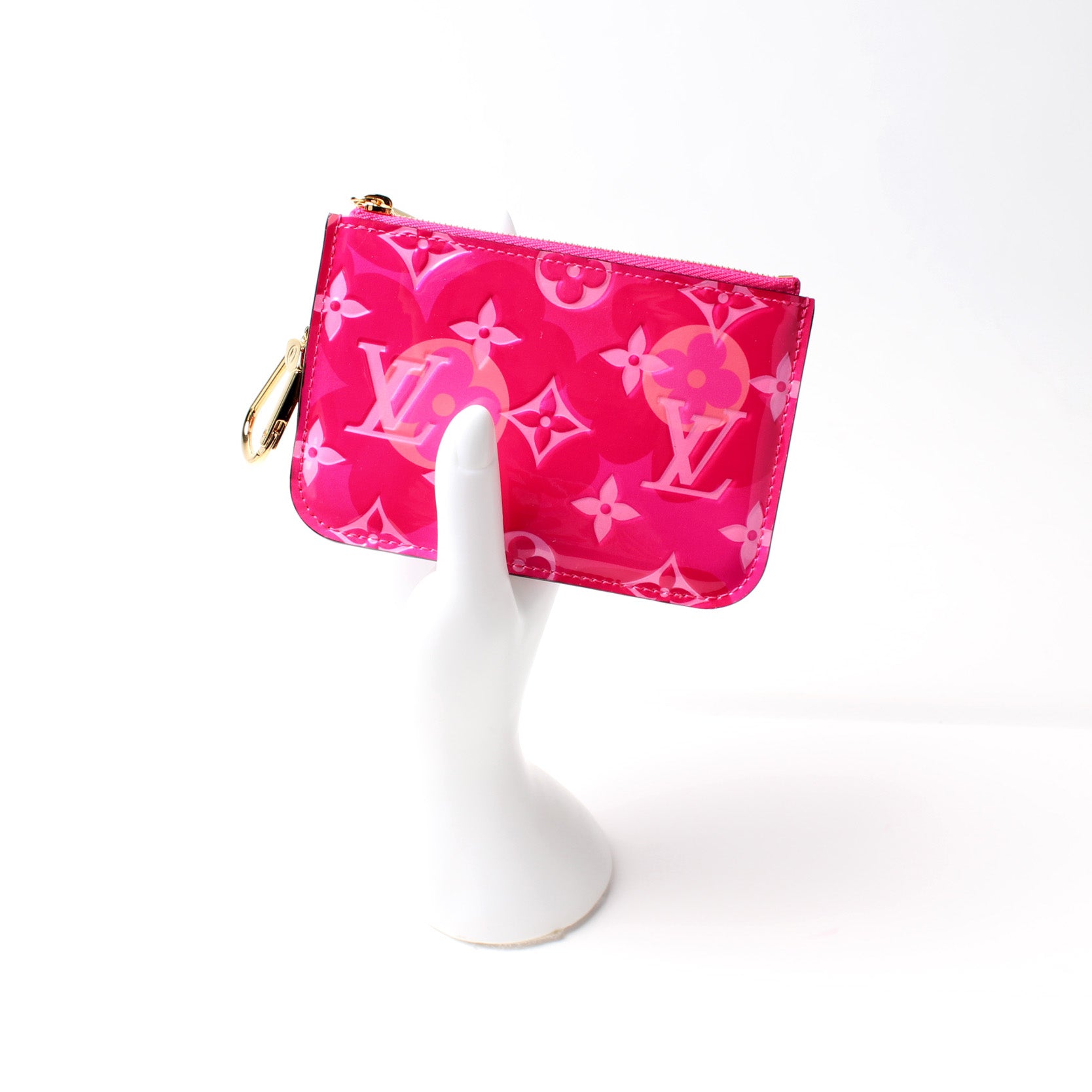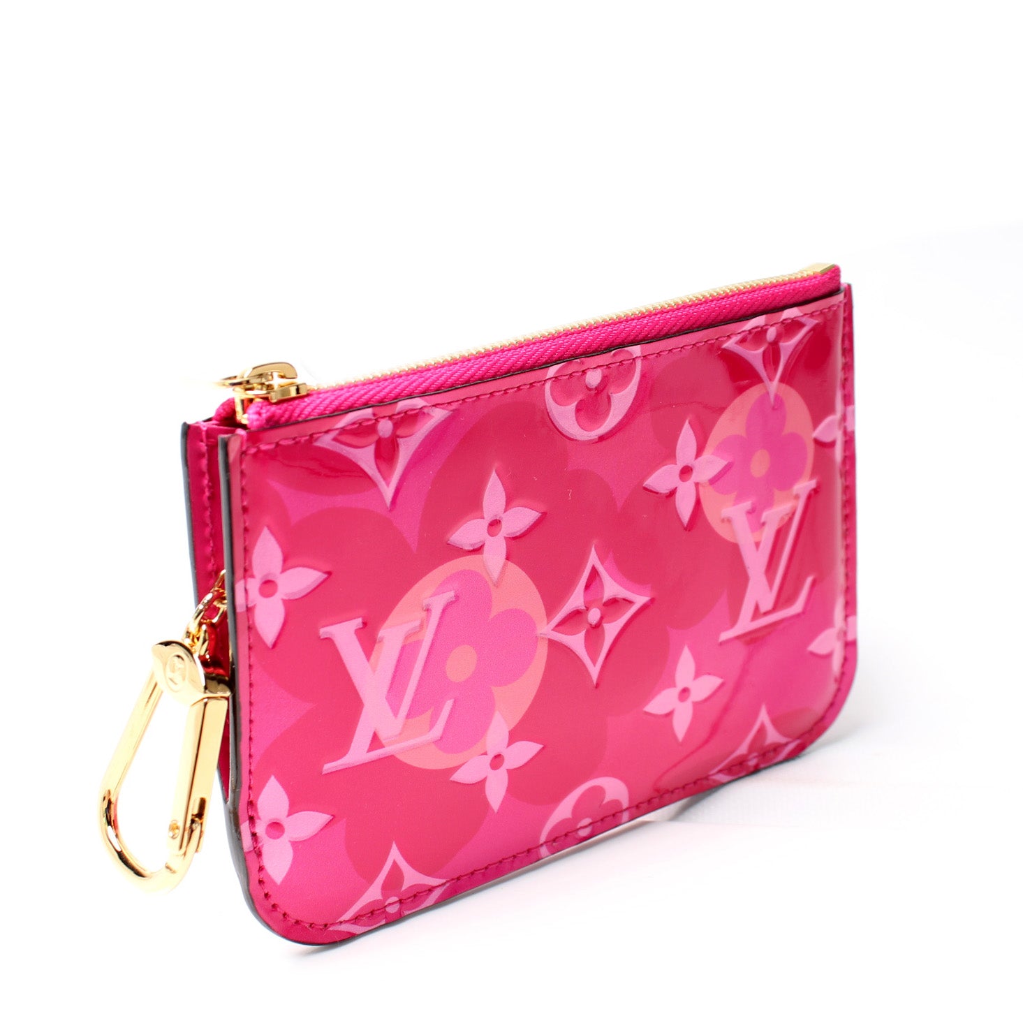 This pre-owned Louis Vuitton Pochette Cles Valentine is guaranteed 100% authentic. The exterior is in the classic Louis Vuitton Valentine print Vernis leather.
