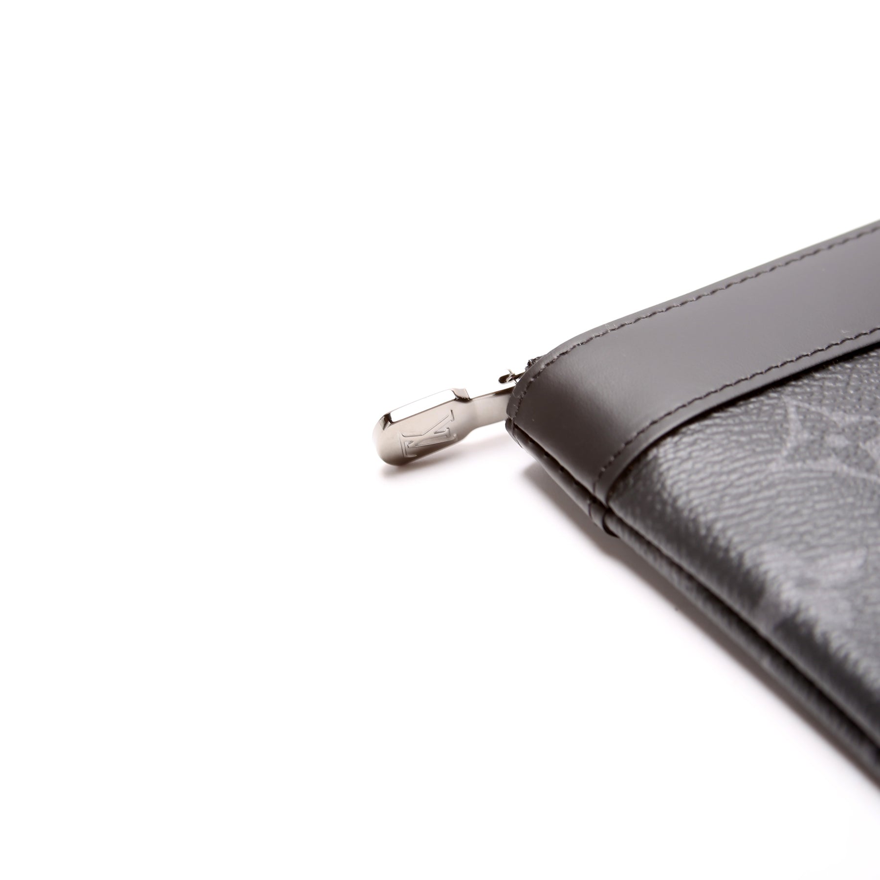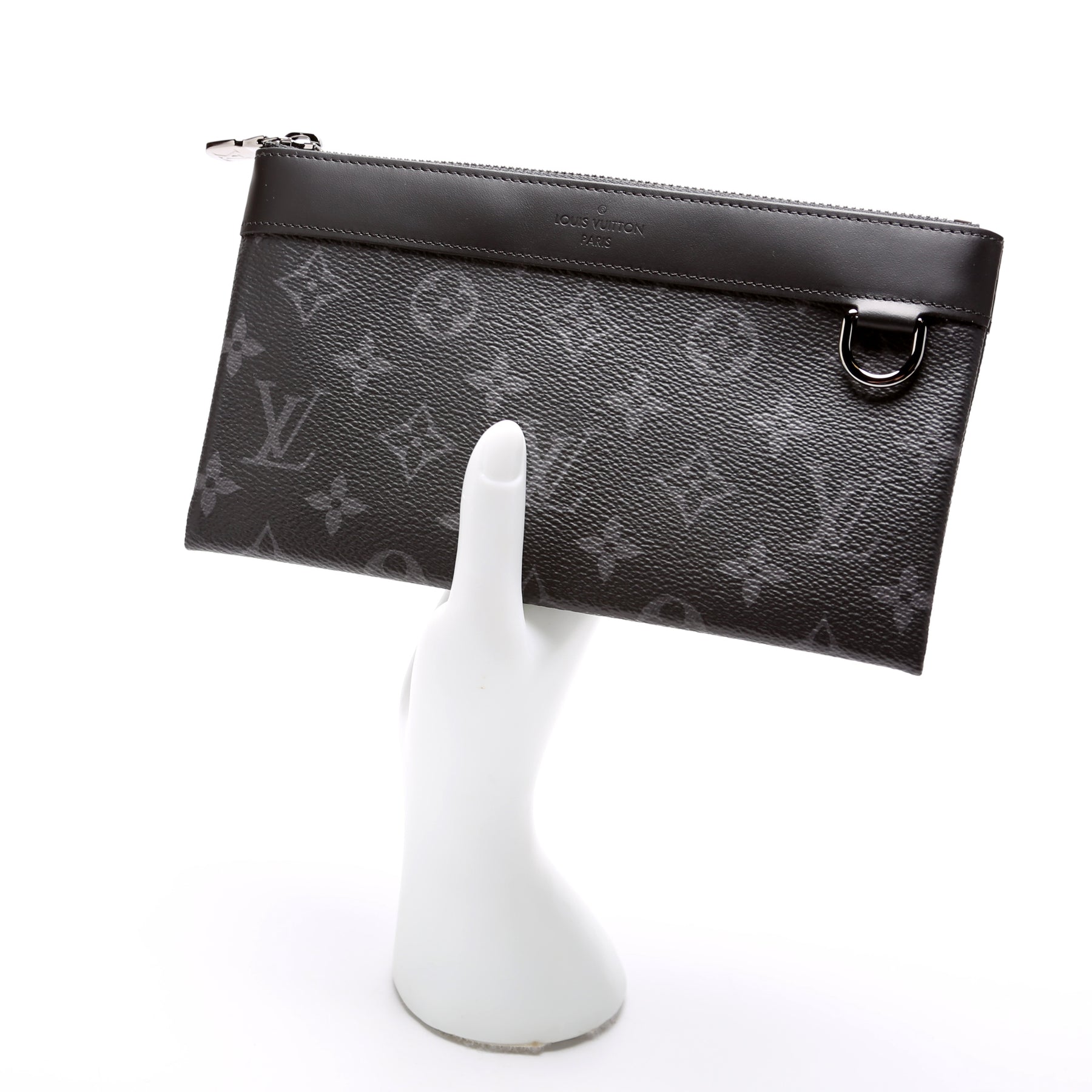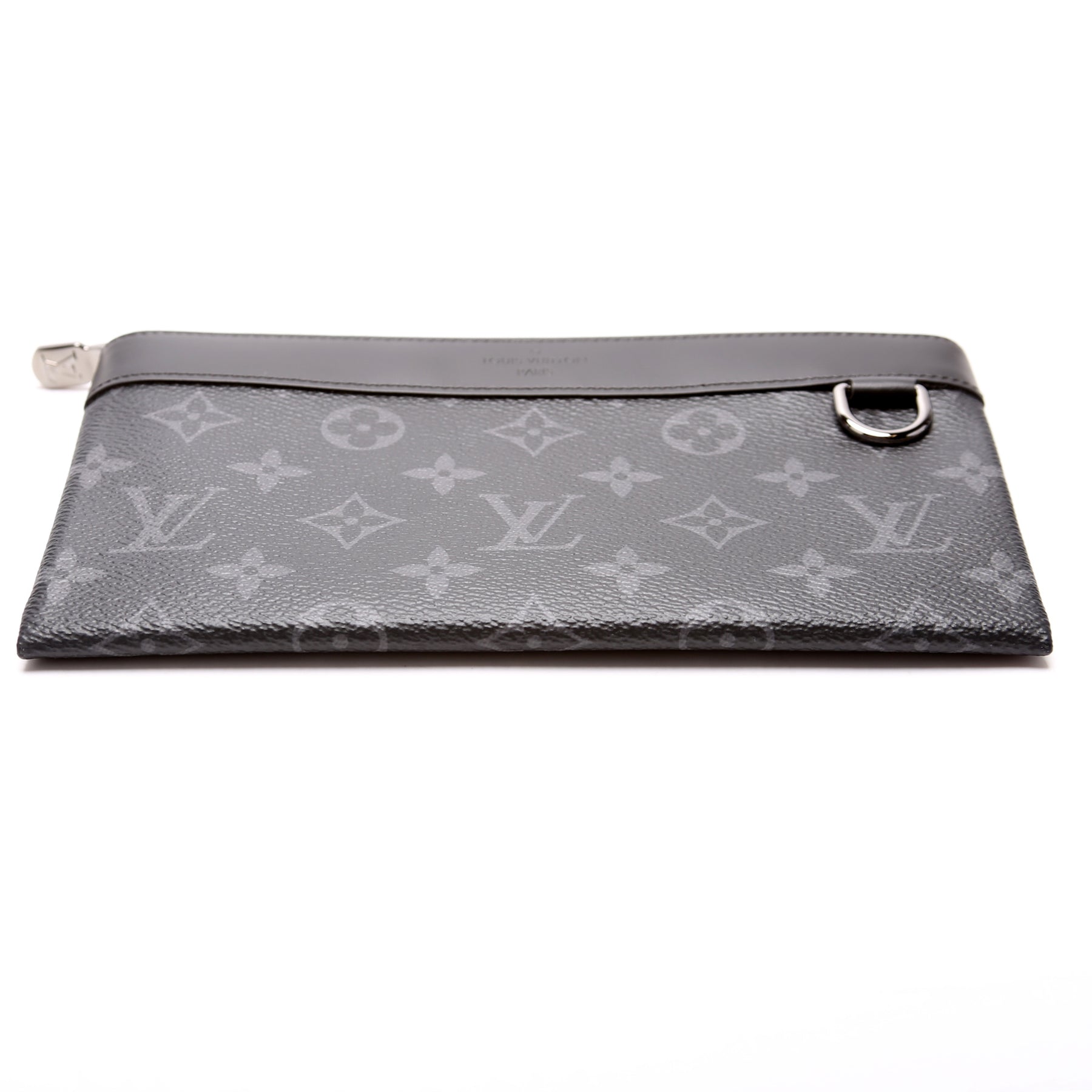 This pre-owned Louis Vuitton Pochette Discovery PM is guaranteed 100% authentic. The exterior is in the classic Louis Vuitton Eclipse Monogram coated canvas.