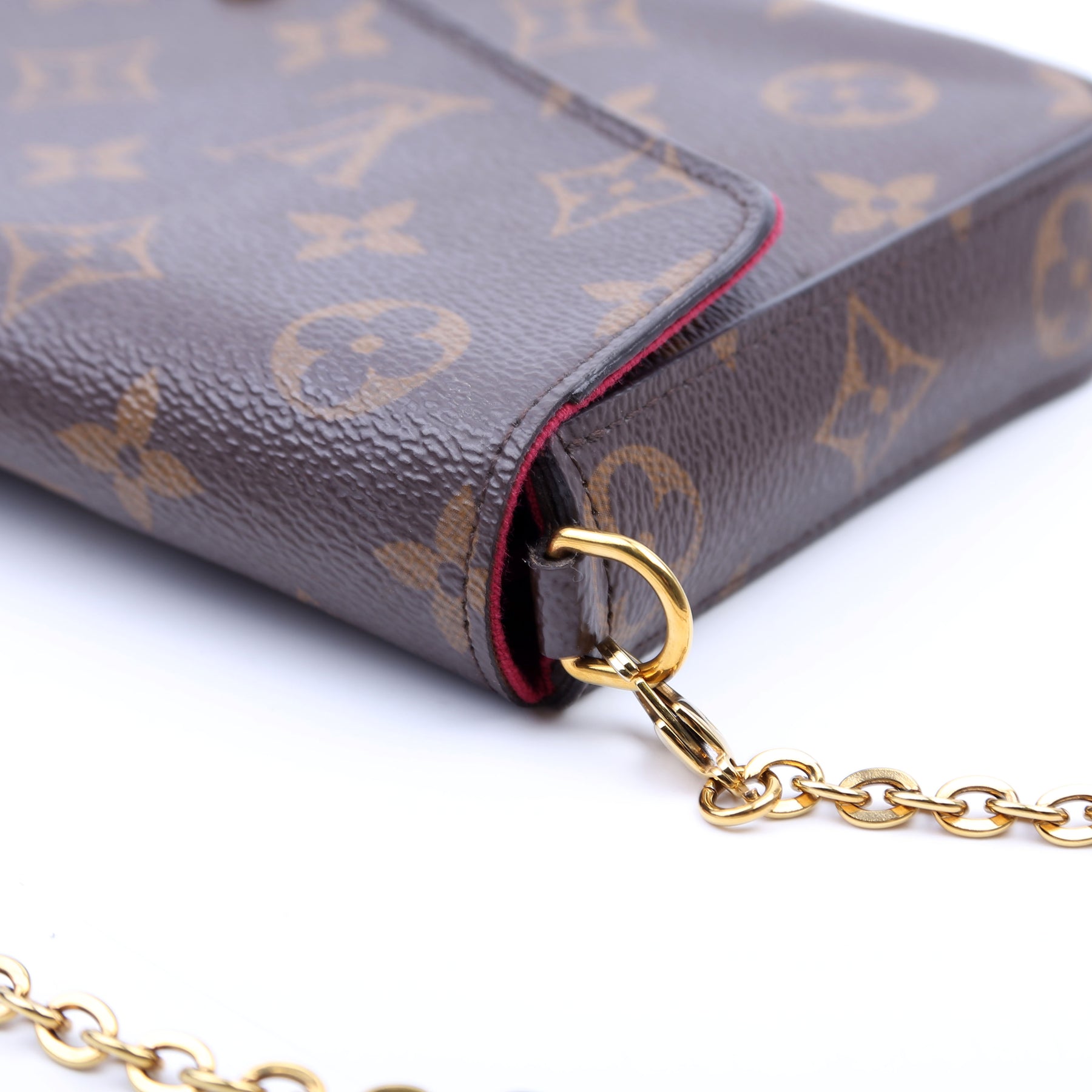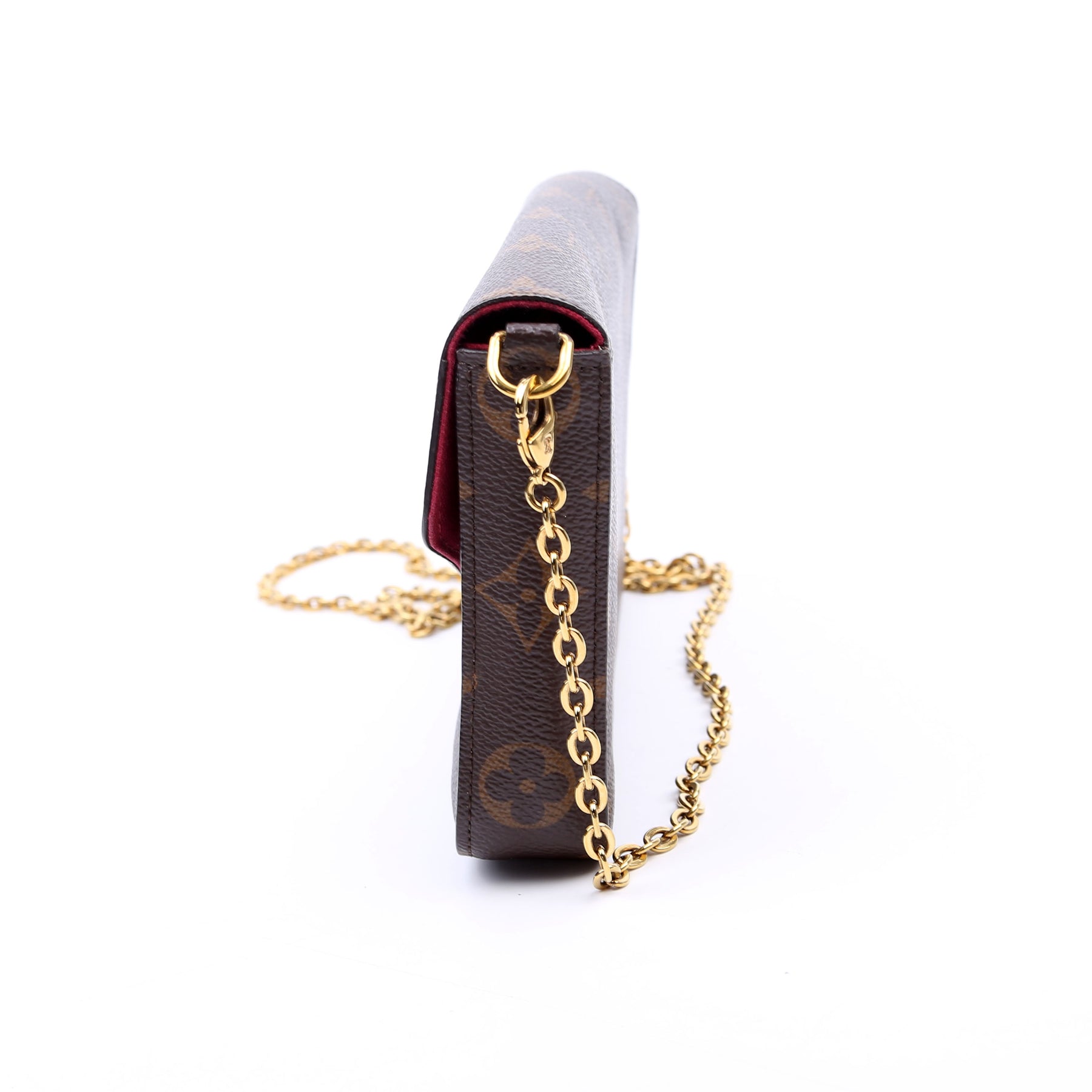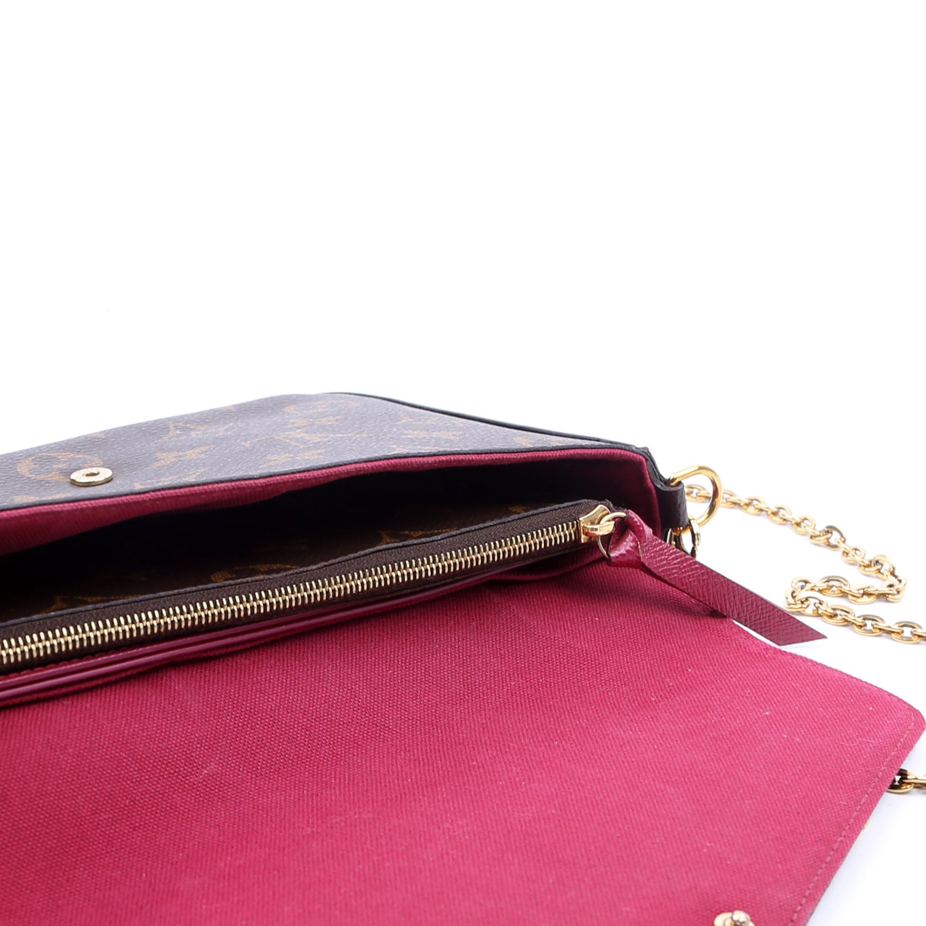 This pre-owned Louis Vuitton Pochette Felicie is guaranteed 100% authentic. The exterior is in the classic Louis Vuitton Monogram coated canvas