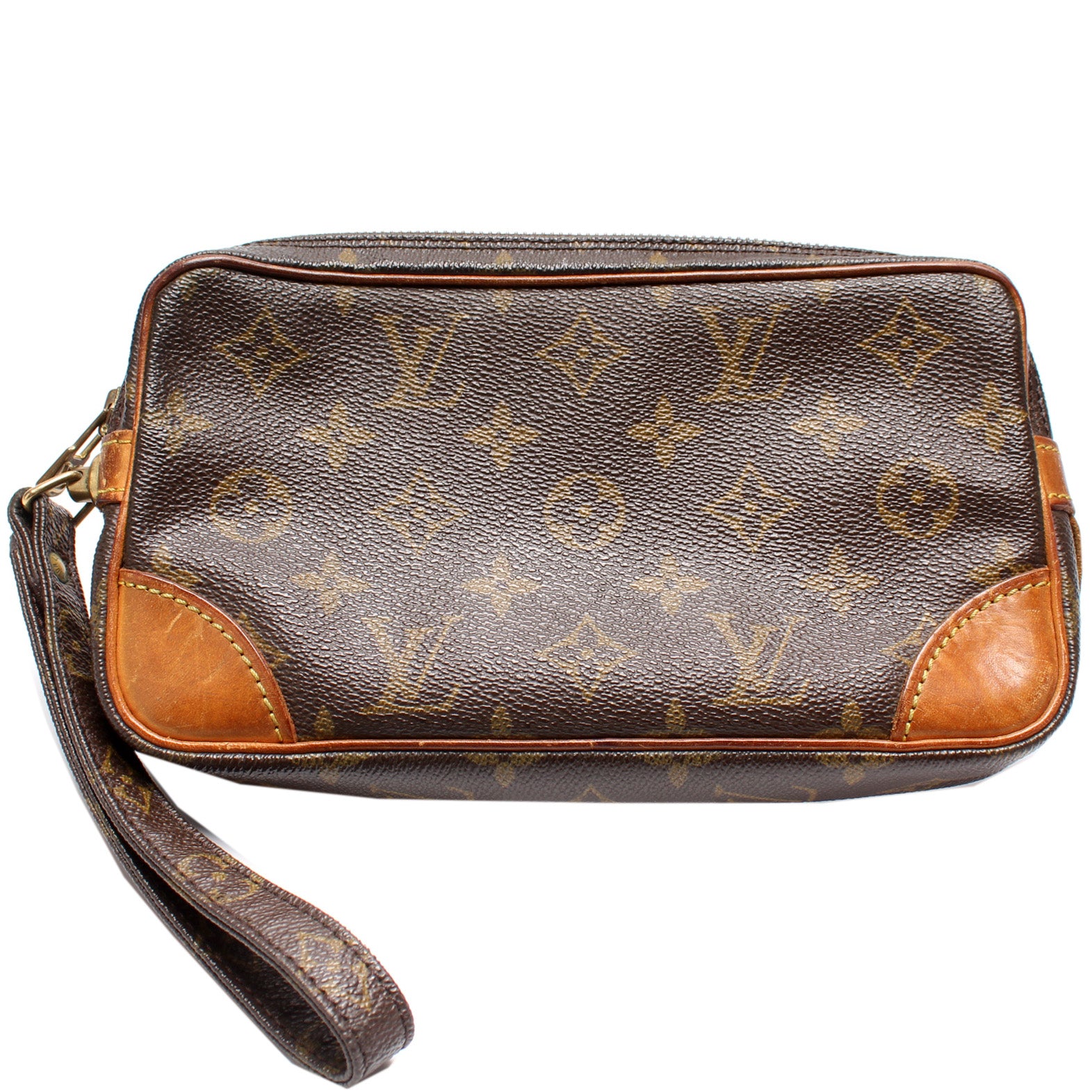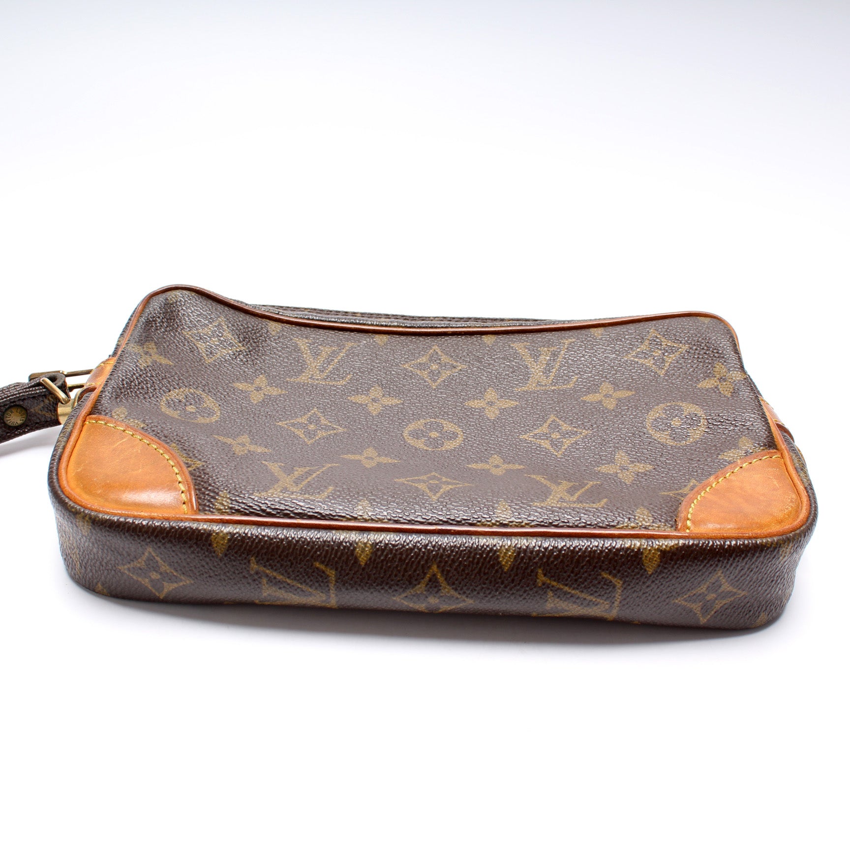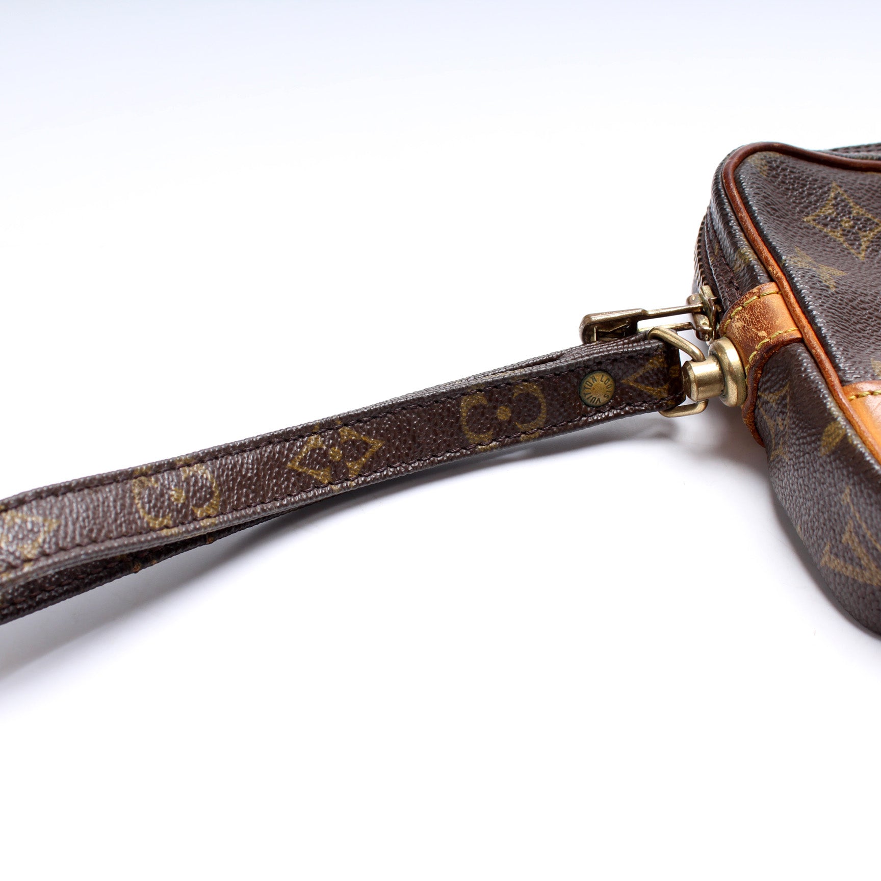 This pre-owned Louis Vuitton Pochette Marly Dragonne PM is guaranteed 100% authentic. The exterior is in the classic Louis Vuitton Monogram coated canvas.