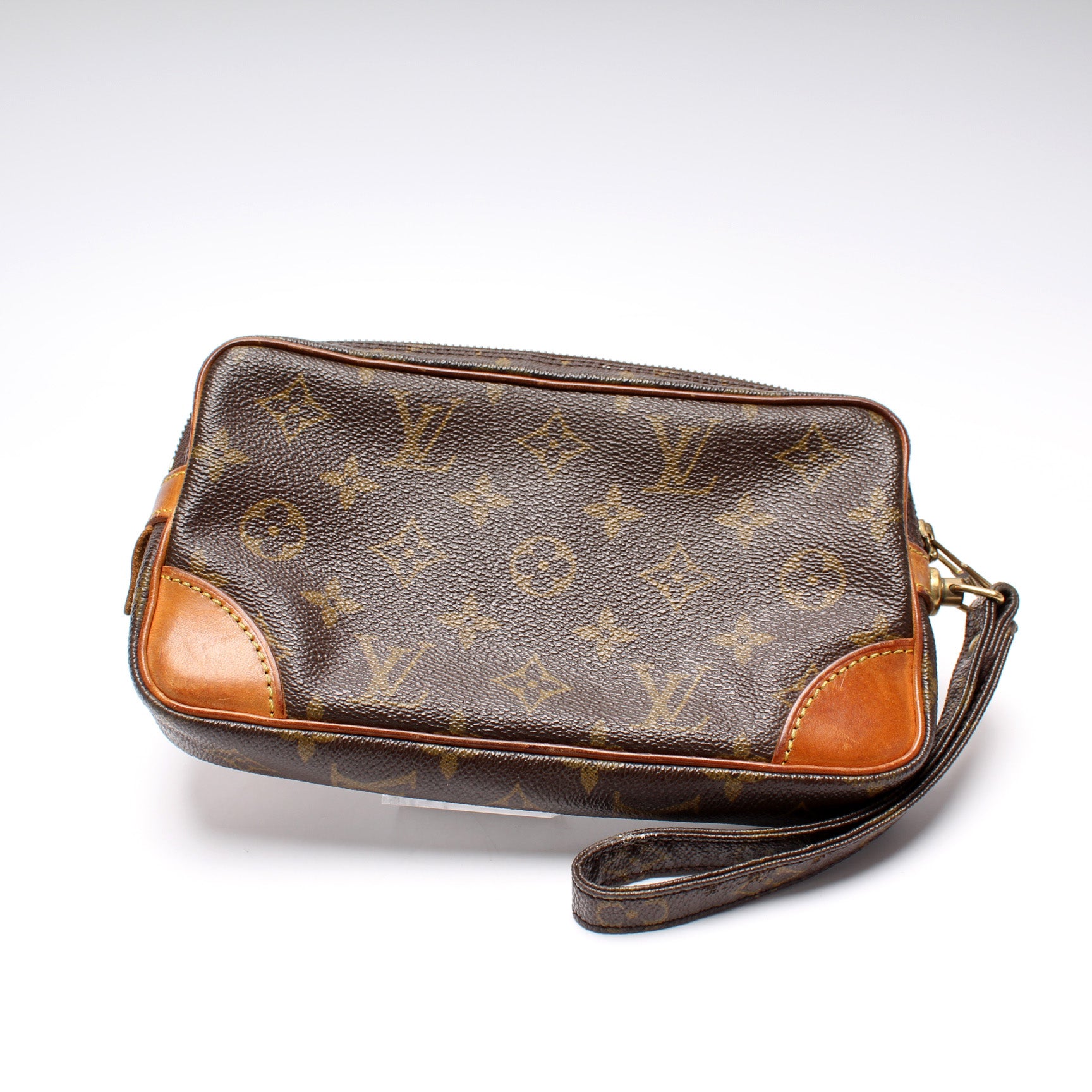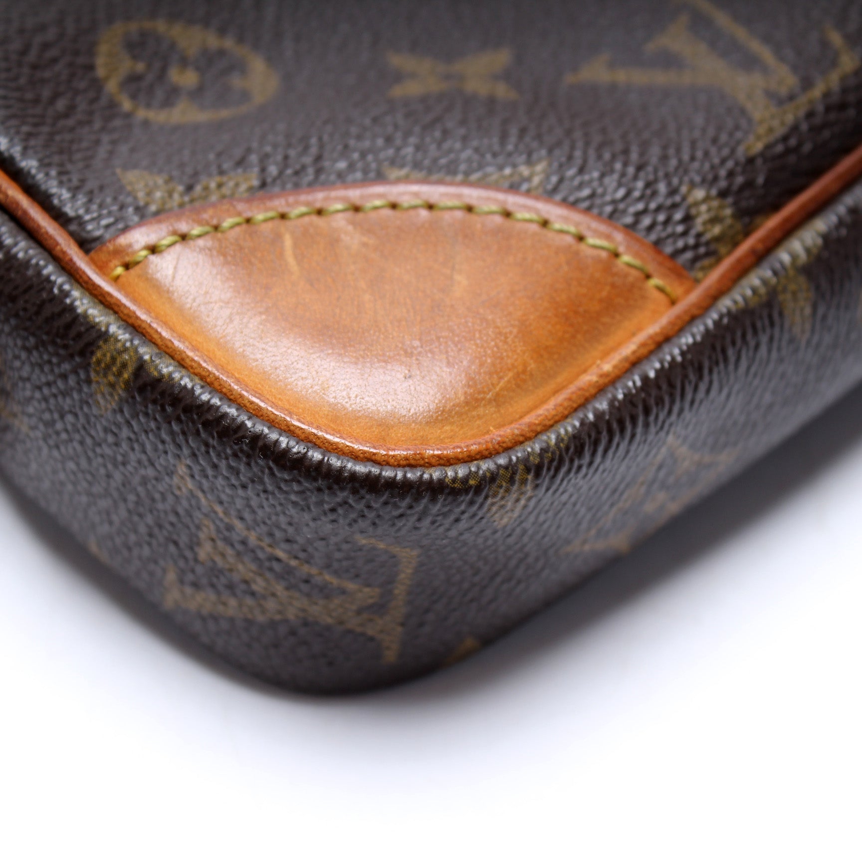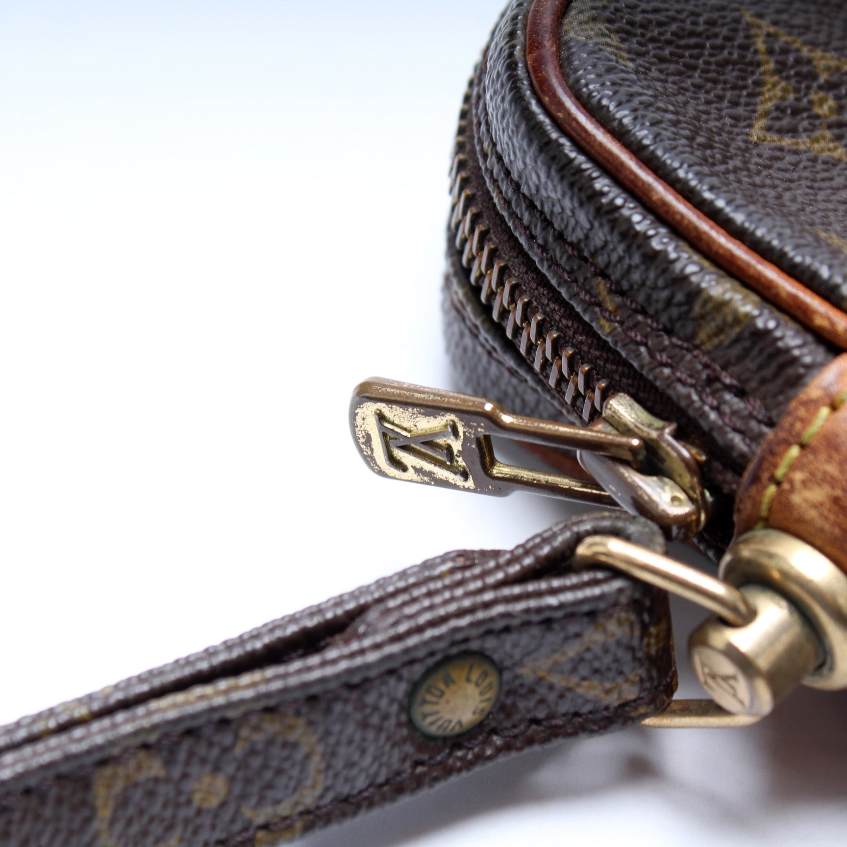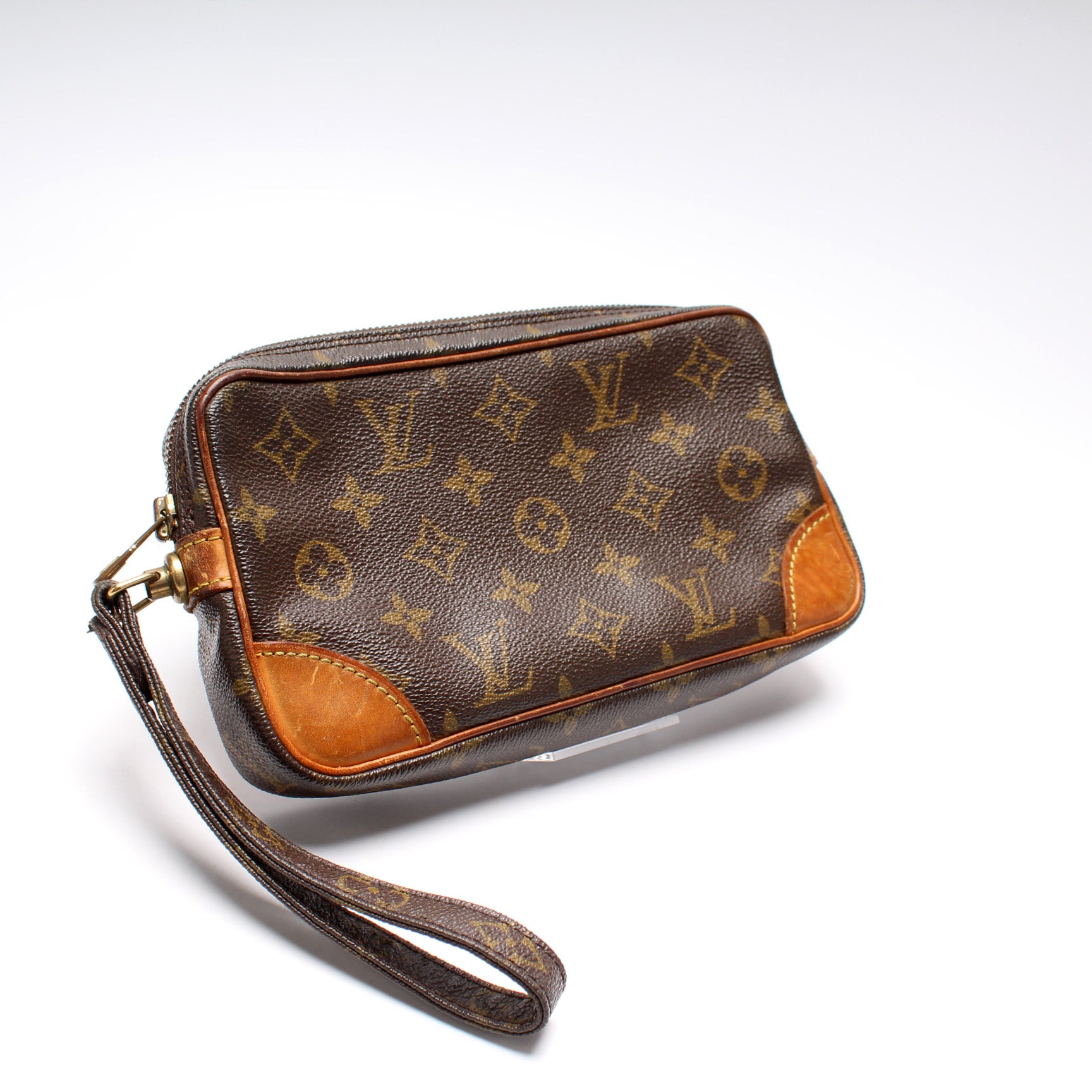 This pre-owned Louis Vuitton Pochette Marly Dragonne PM is guaranteed 100% authentic. The exterior is in the classic Louis Vuitton Monogram coated canvas.