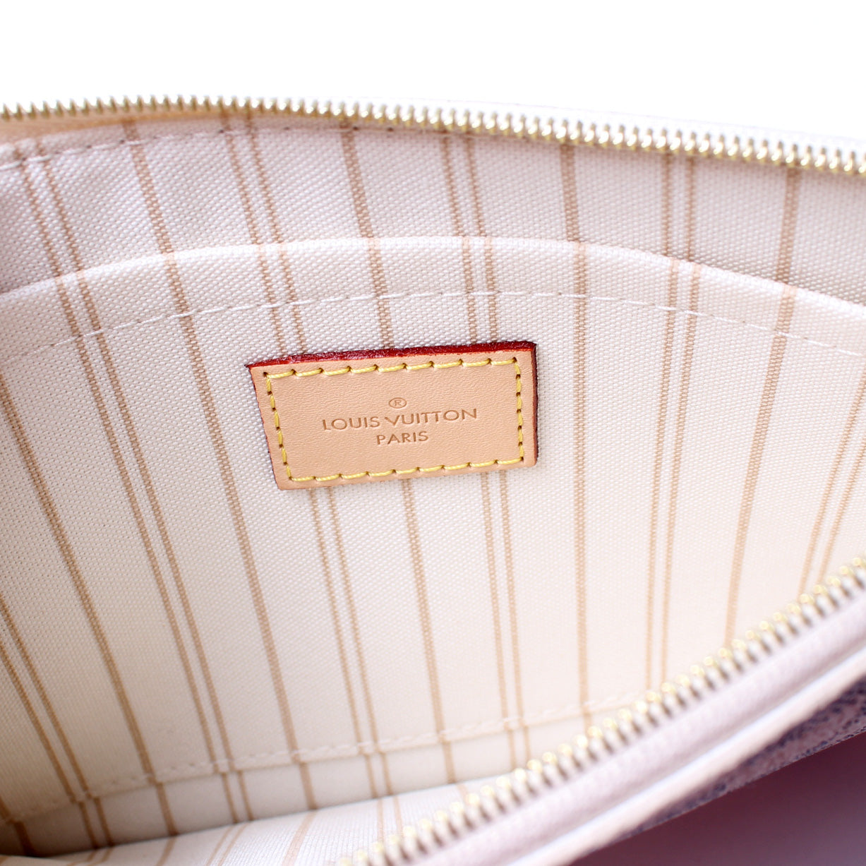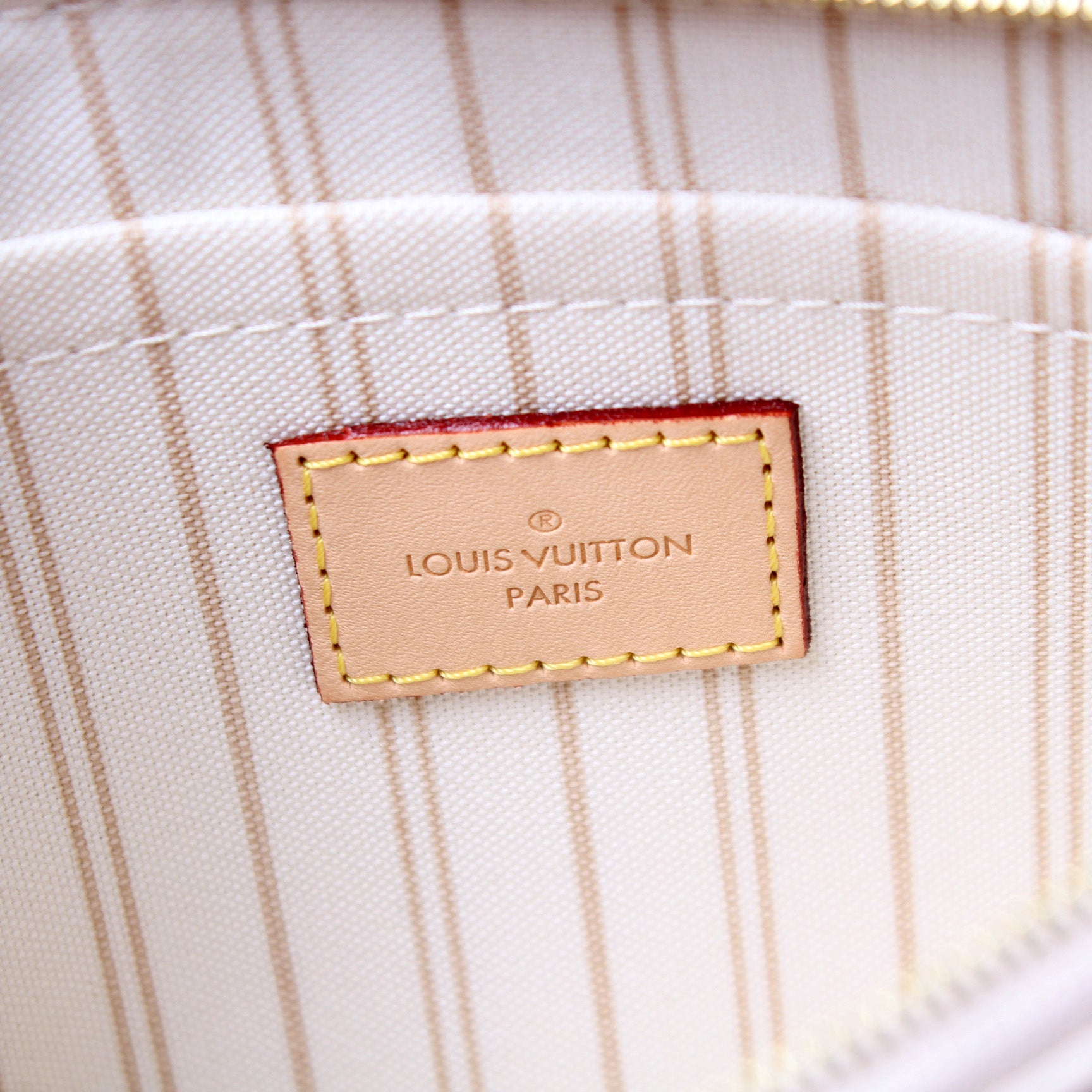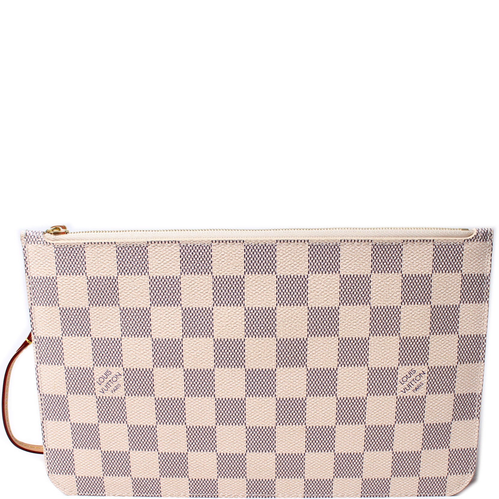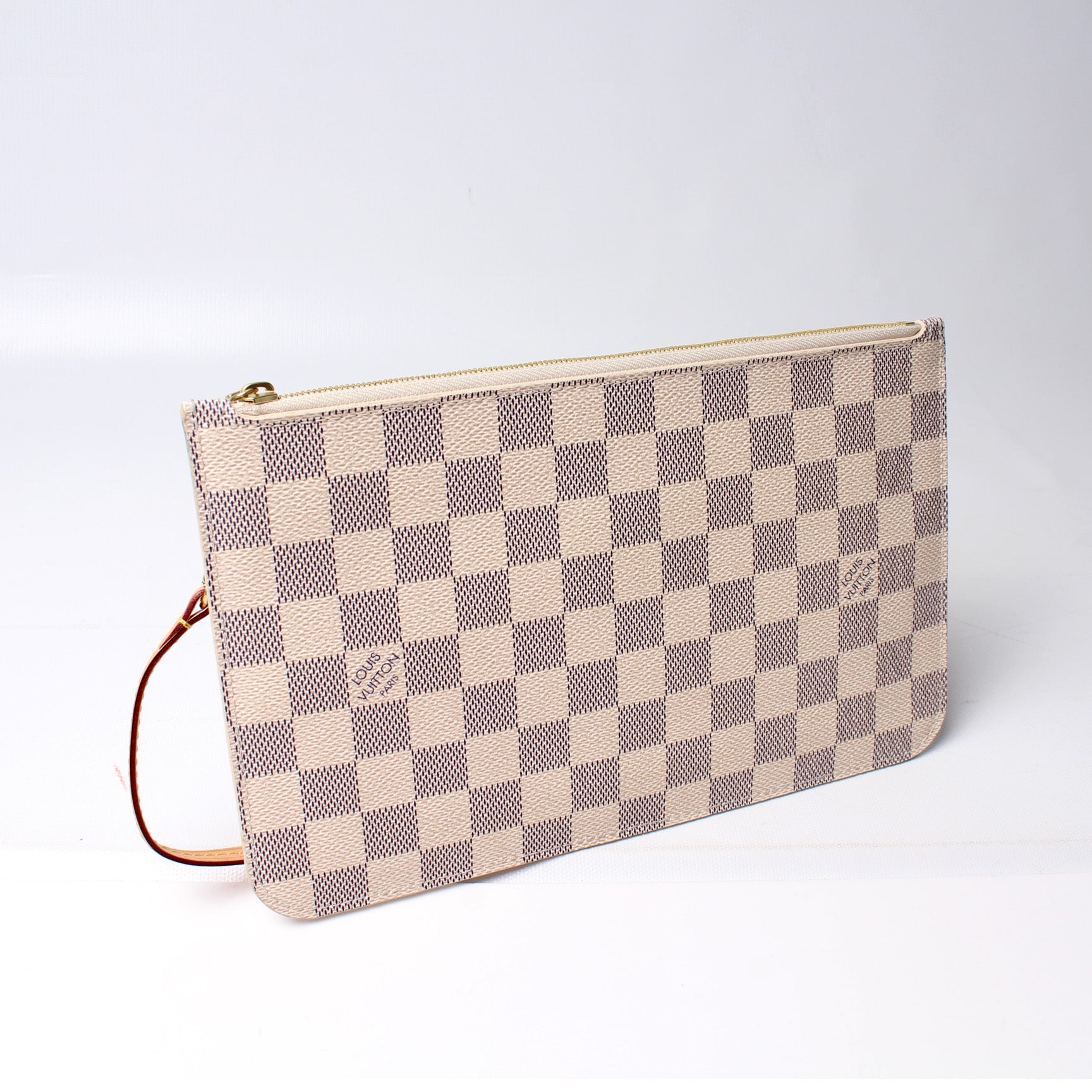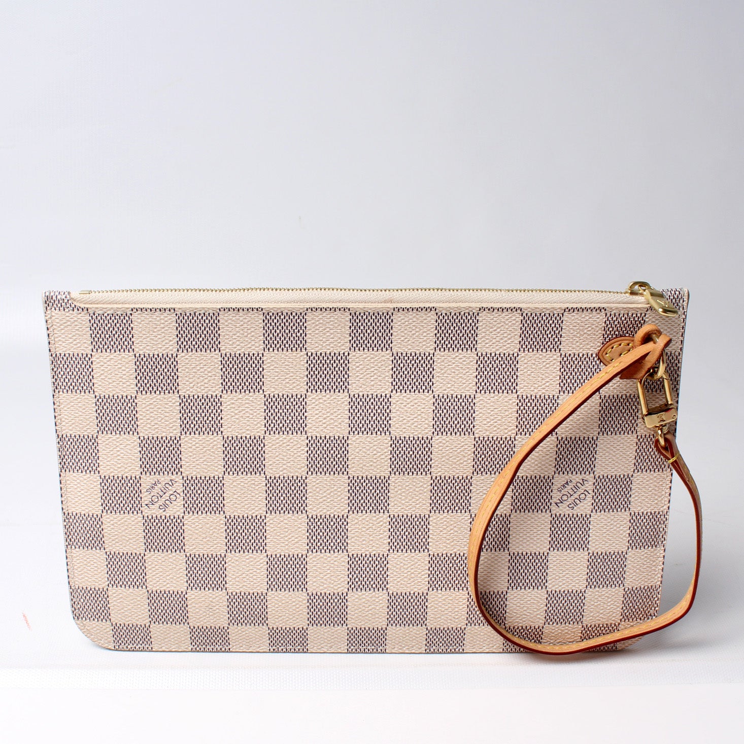 This pre-owned Louis Vuitton Pochette Only Neverfull is guaranteed 100% authentic. The exterior is in the classic Louis Vuitton Damier Azur coated canvas.