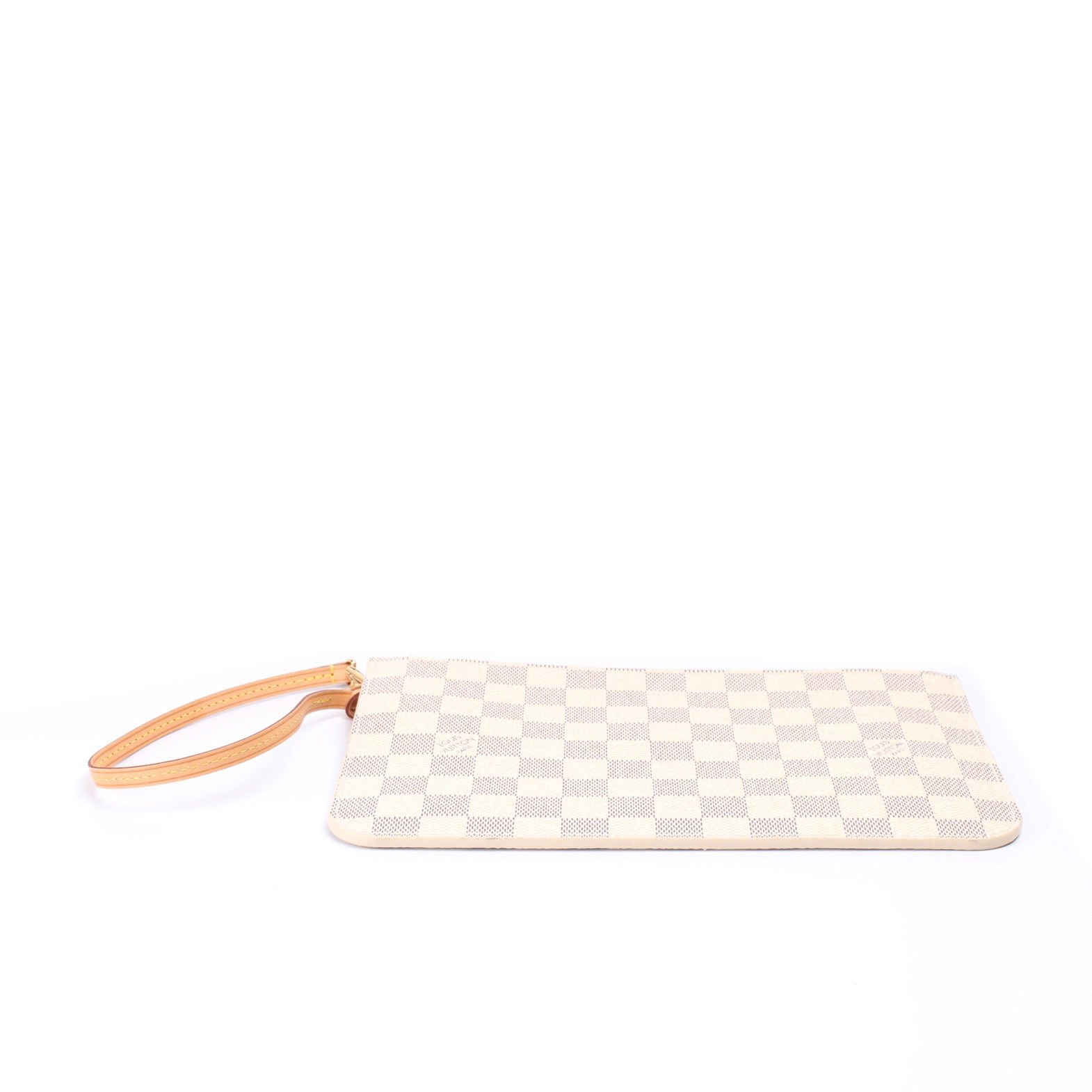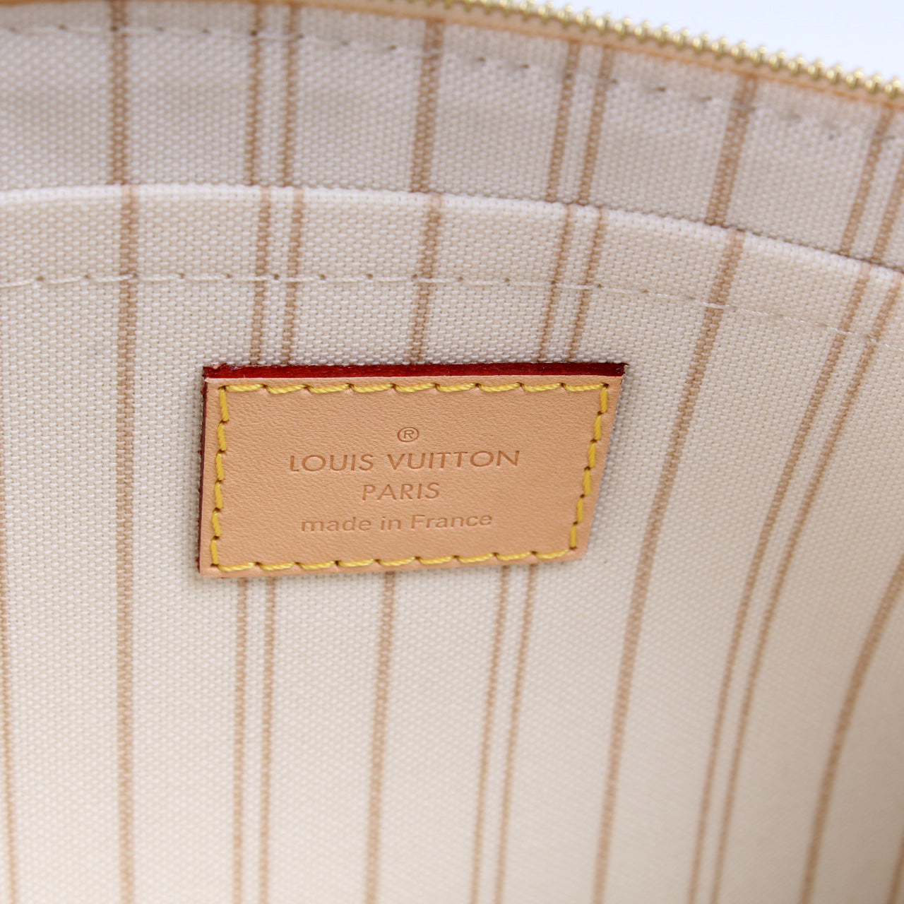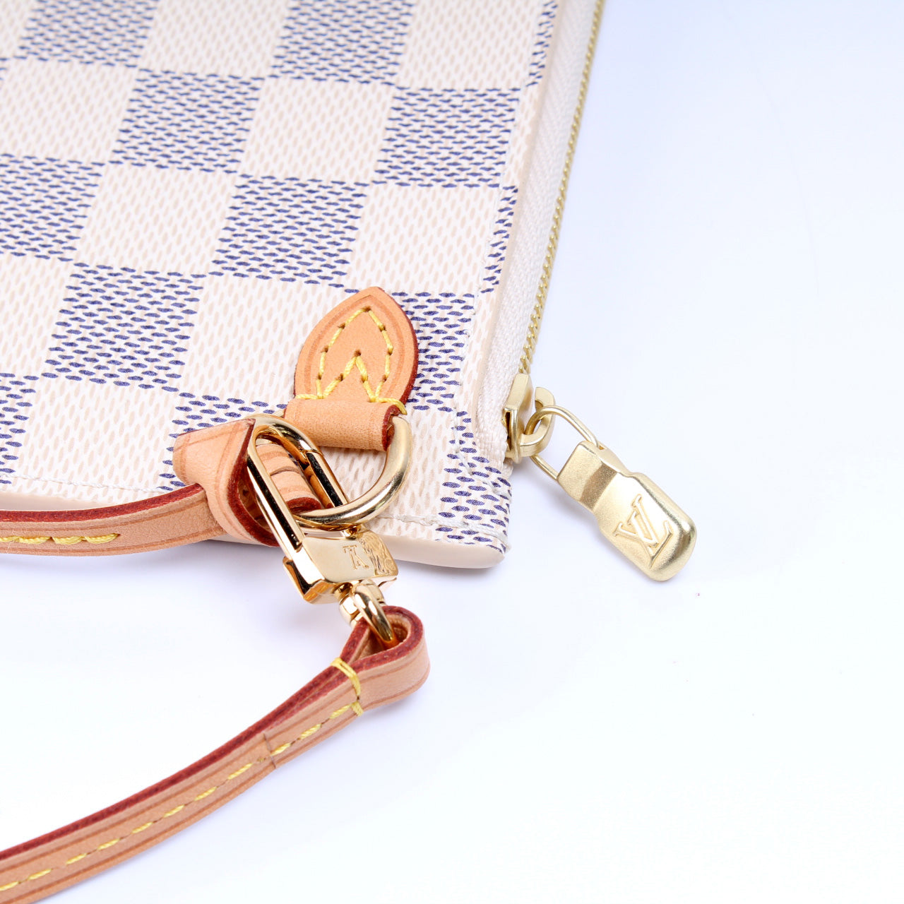 This pre-owned Louis Vuitton Pochette Only Neverfull is guaranteed 100% authentic. The exterior is in the classic Louis Vuitton Damier Azur coated canvas.