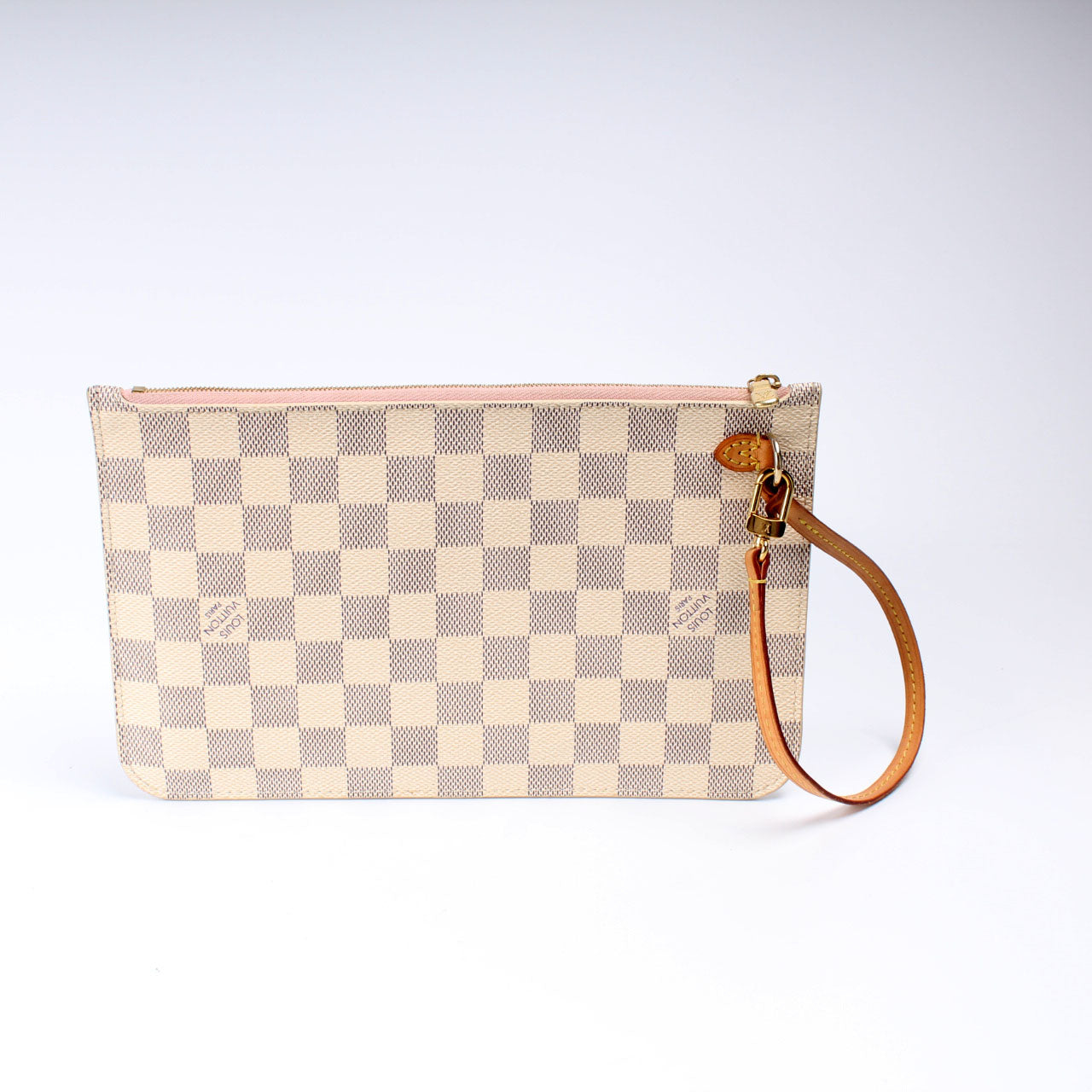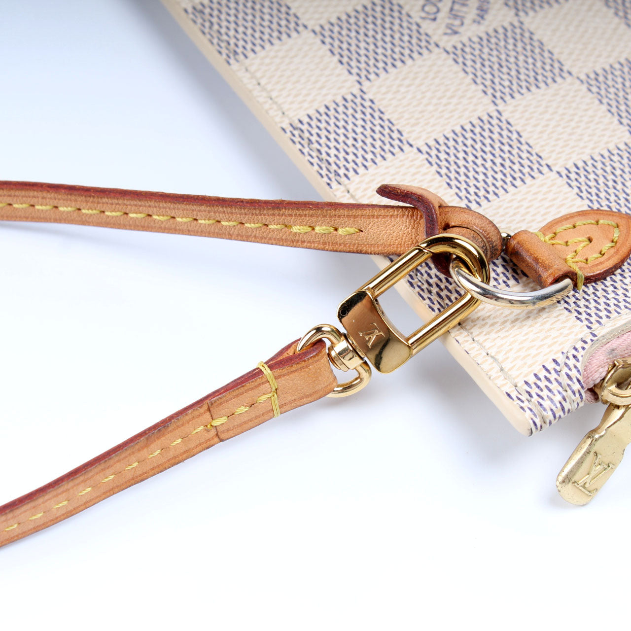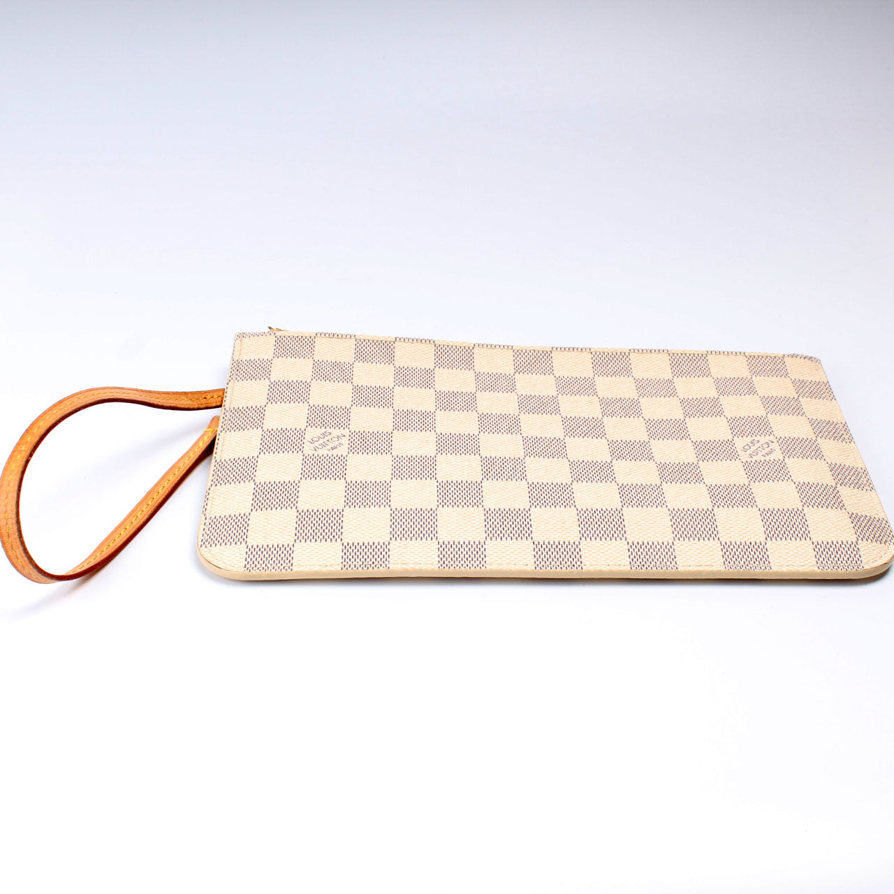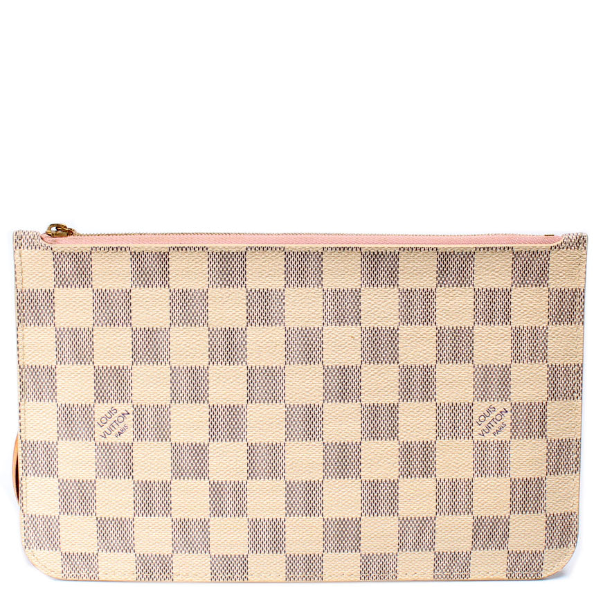 This pre-owned Louis Vuitton Pochette Only Neverfull is guaranteed 100% authentic. The exterior is in the classic Louis Vuitton Damier Azur coated canvas.