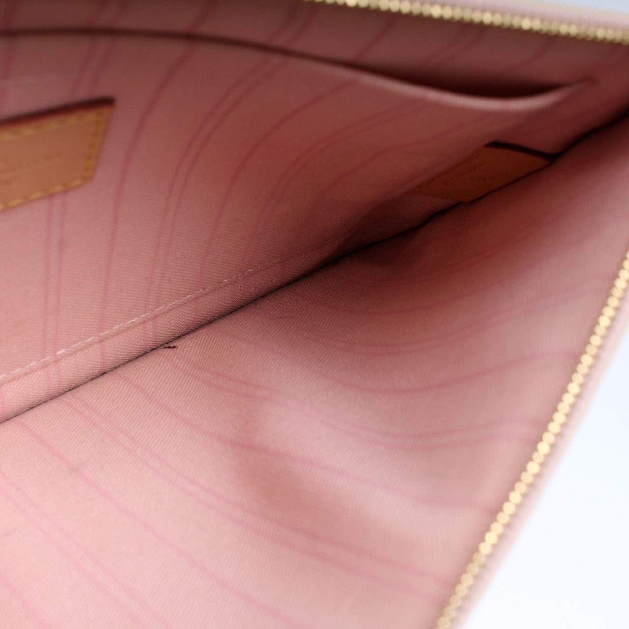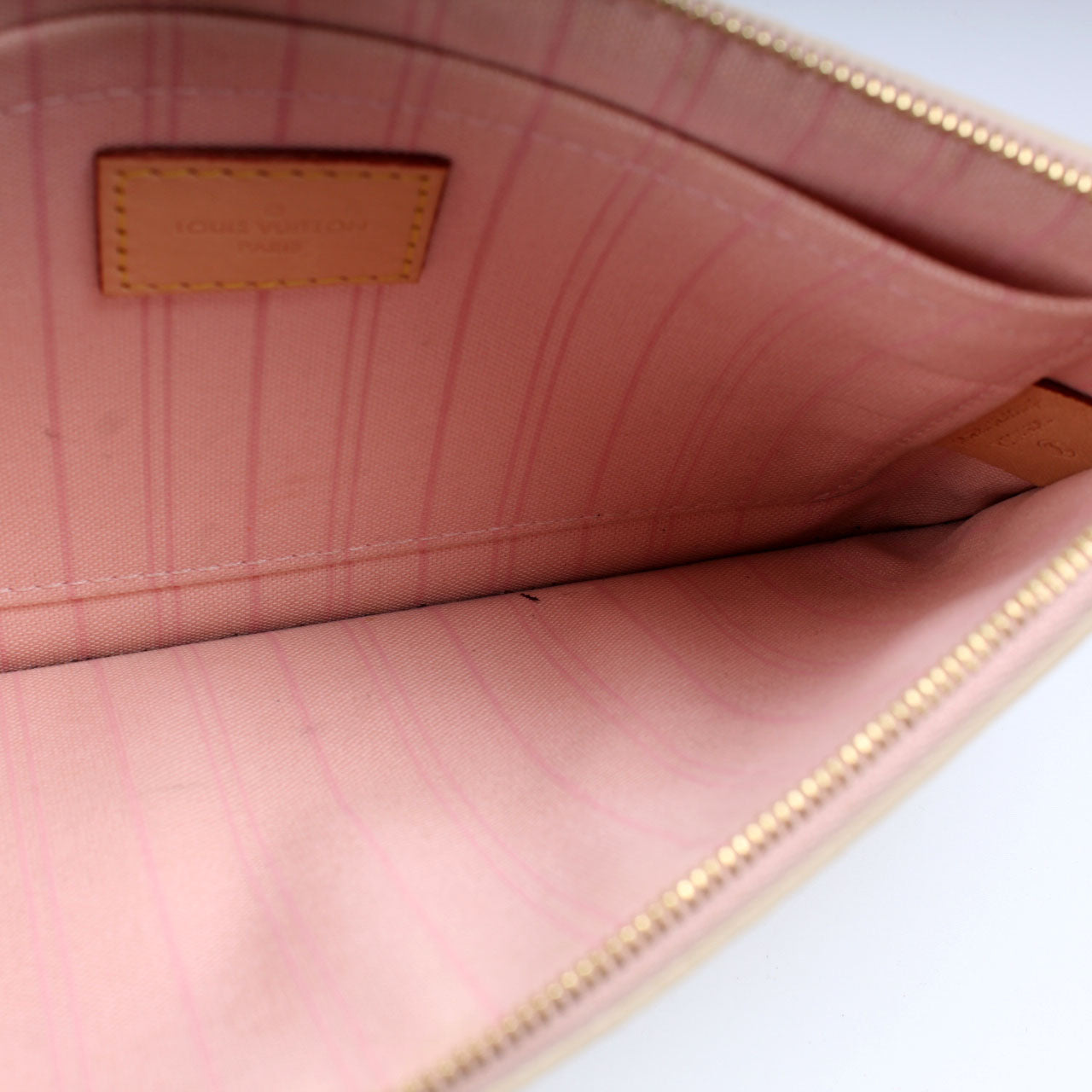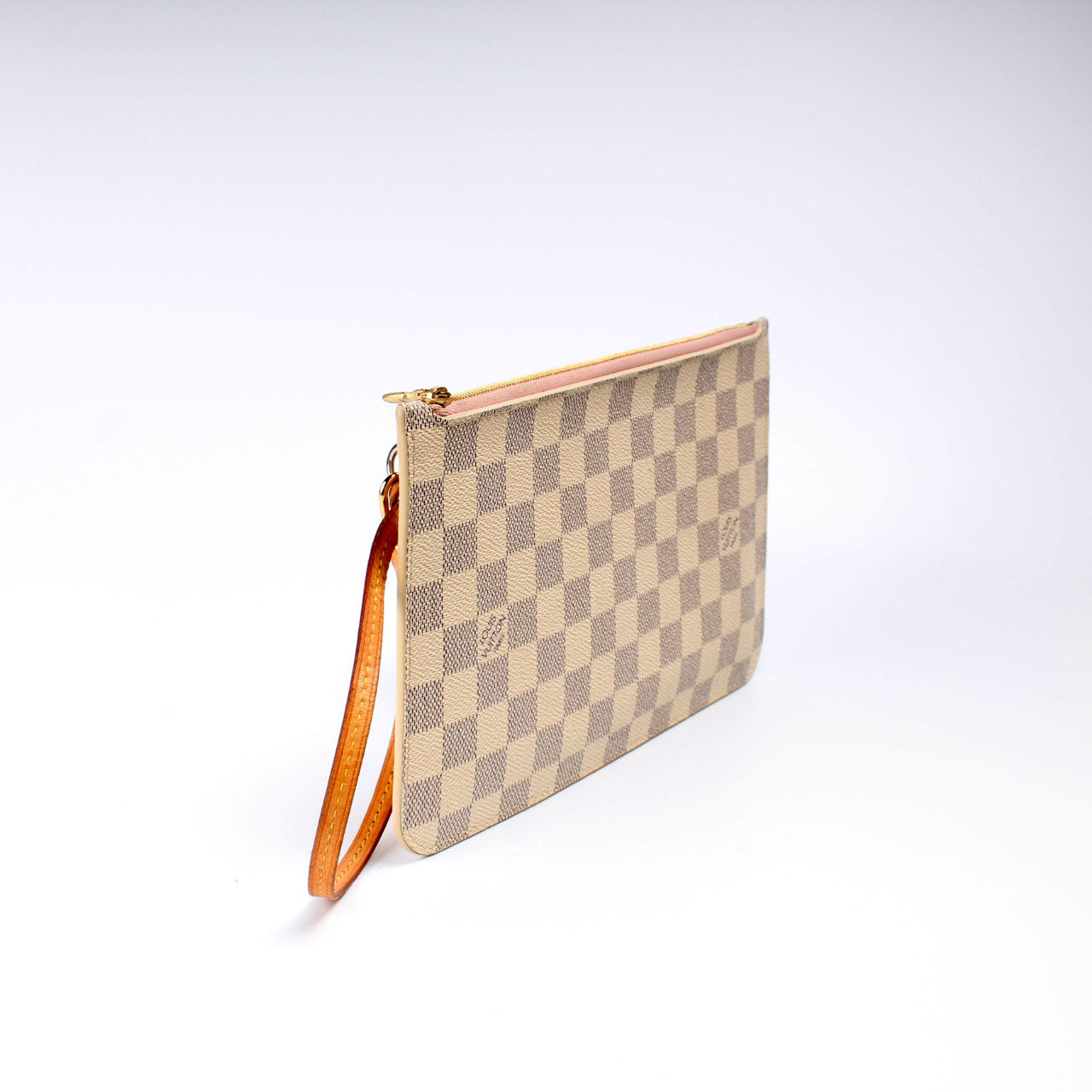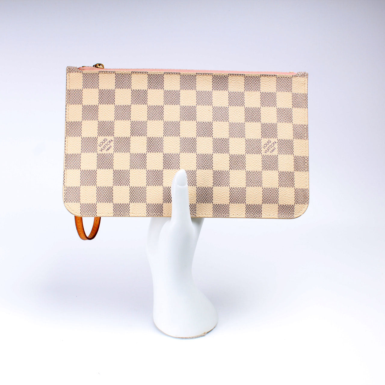 This pre-owned Louis Vuitton Pochette Only Neverfull is guaranteed 100% authentic. The exterior is in the classic Louis Vuitton Damier Azur coated canvas.