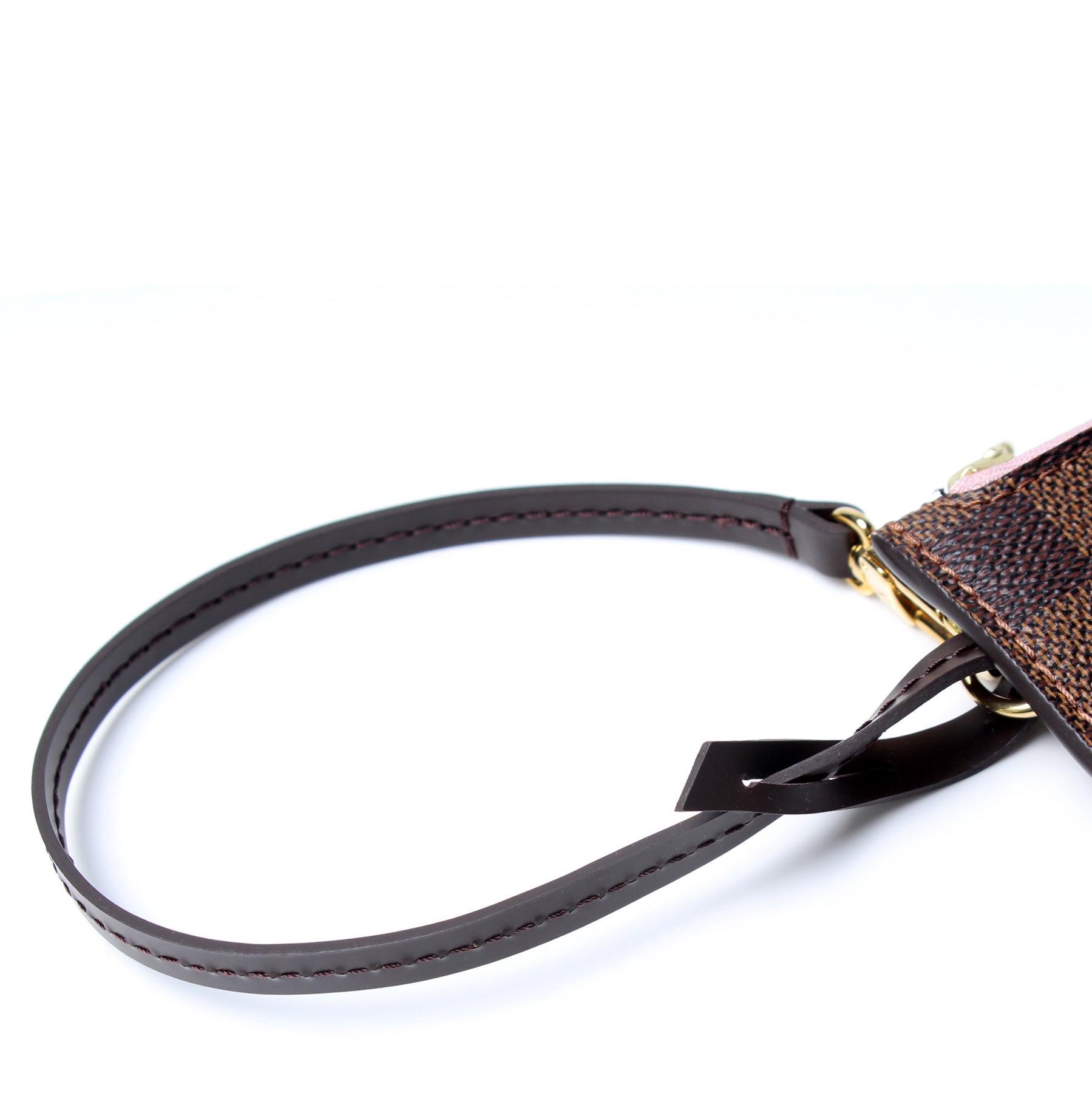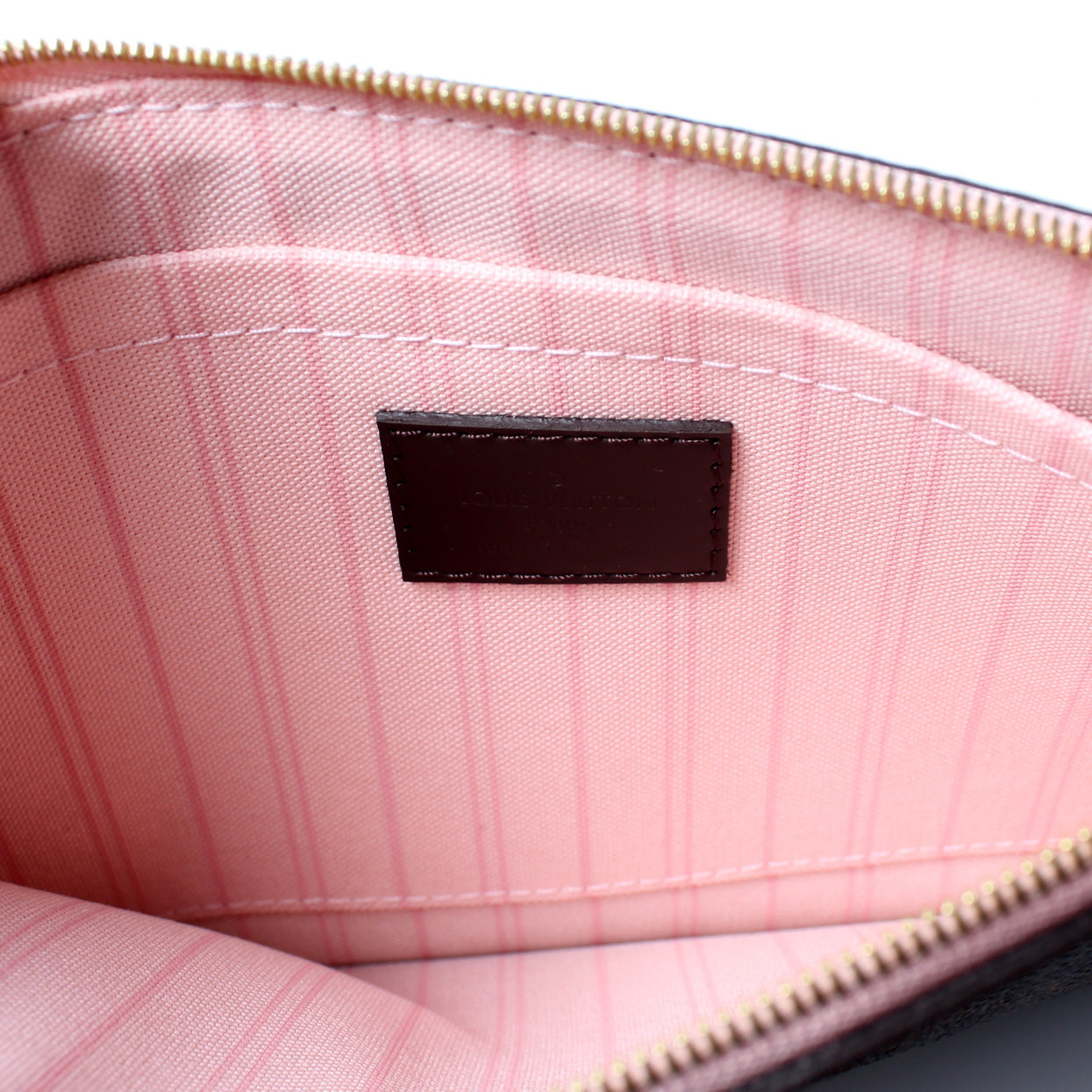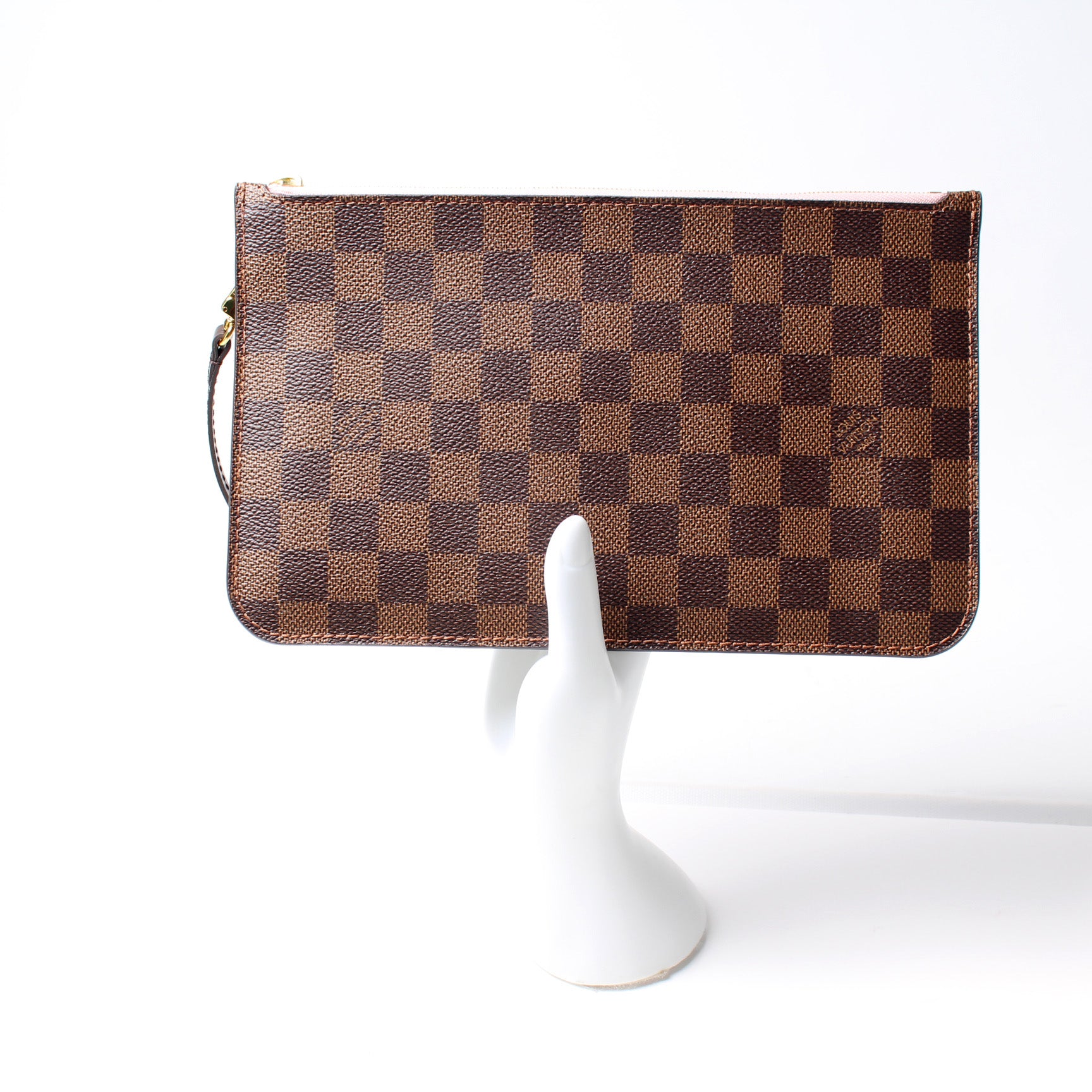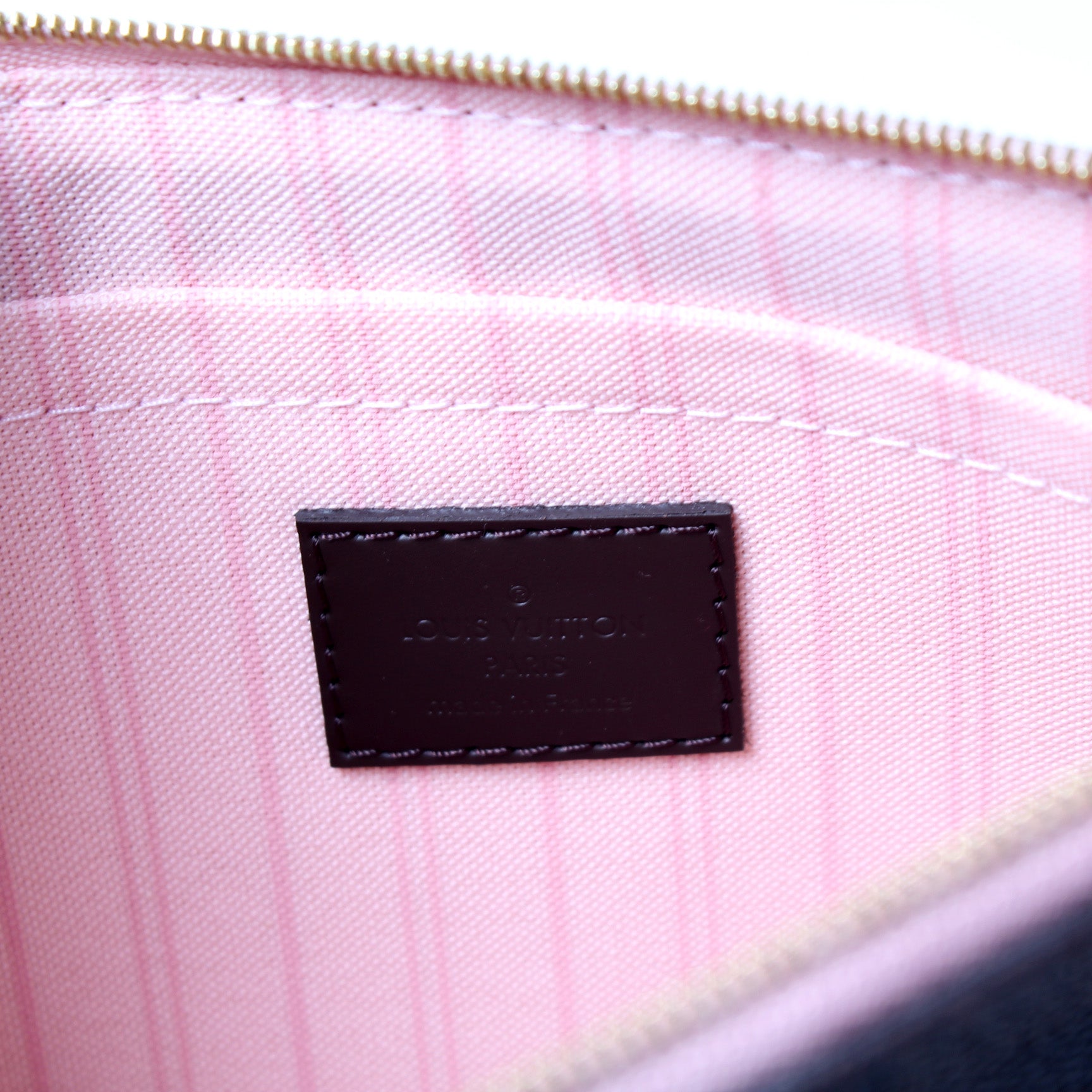This pre-owned Louis Vuitton Pochette Only Neverfull is guaranteed 100% authentic. The exterior is in the classic Louis Vuitton Damier Ebene coated canvas.