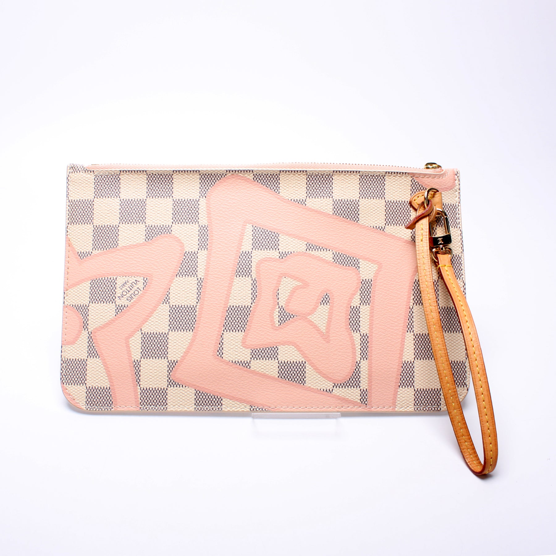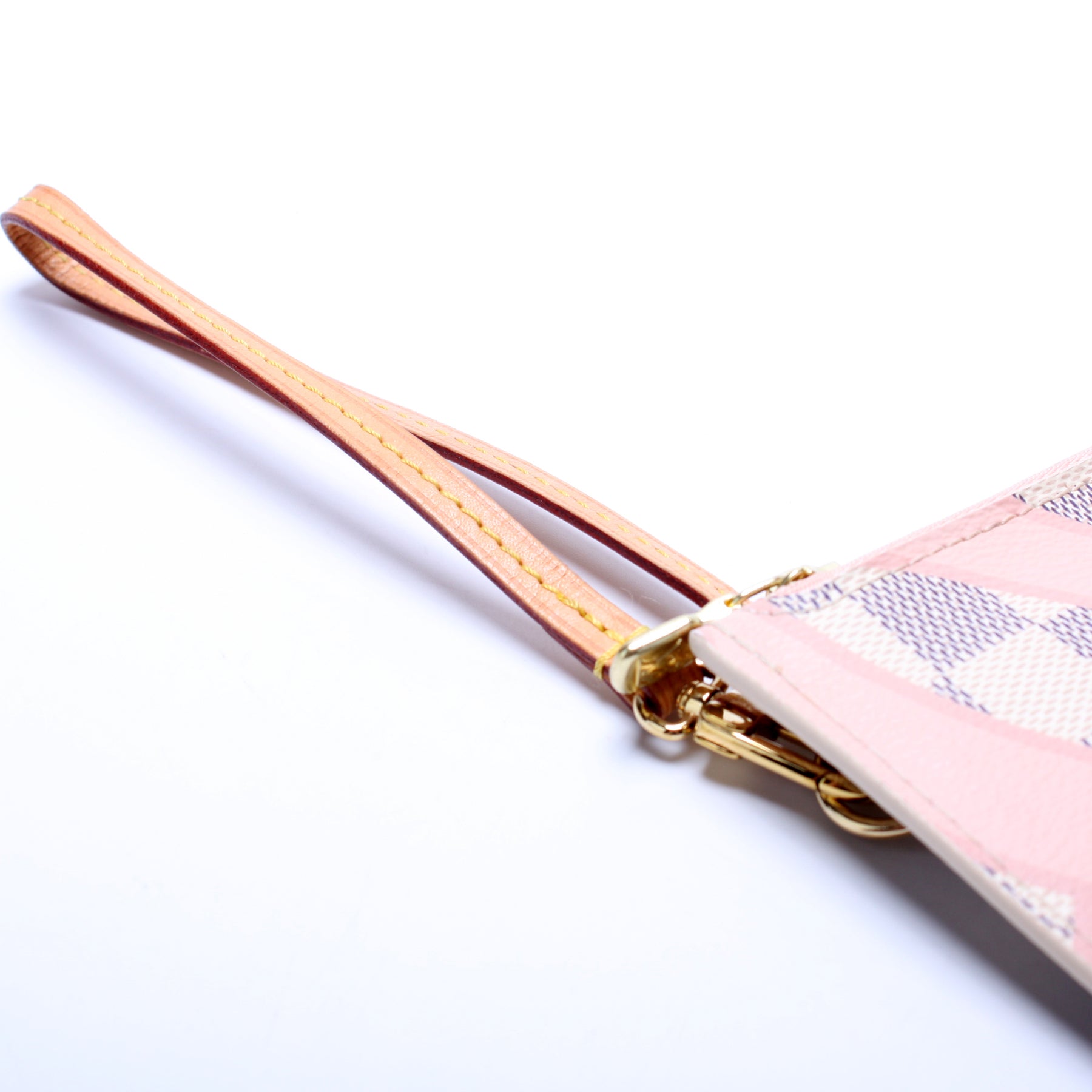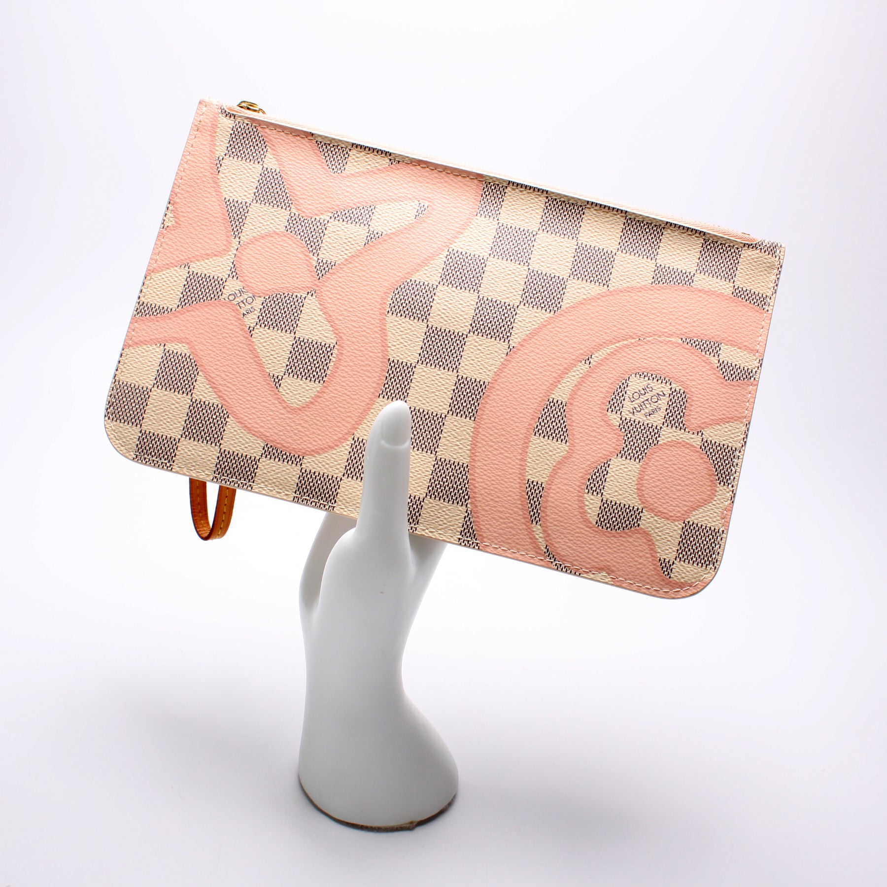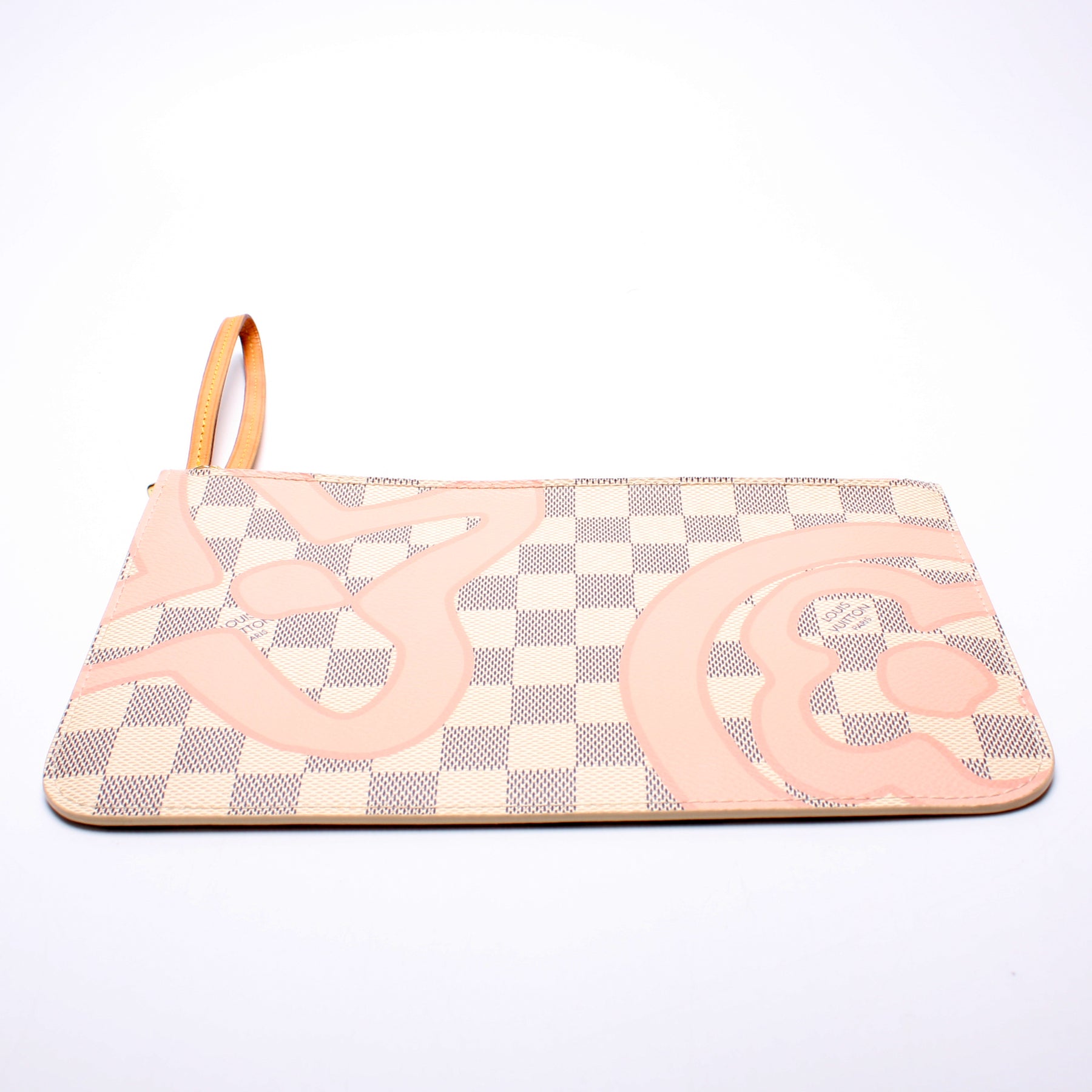 This pre-owned Louis Vuitton Pochette Only Neverfull Tahitienne is guaranteed 100% authentic. The exterior is in the classic Louis Vuitton Damier Azur coated canvas.