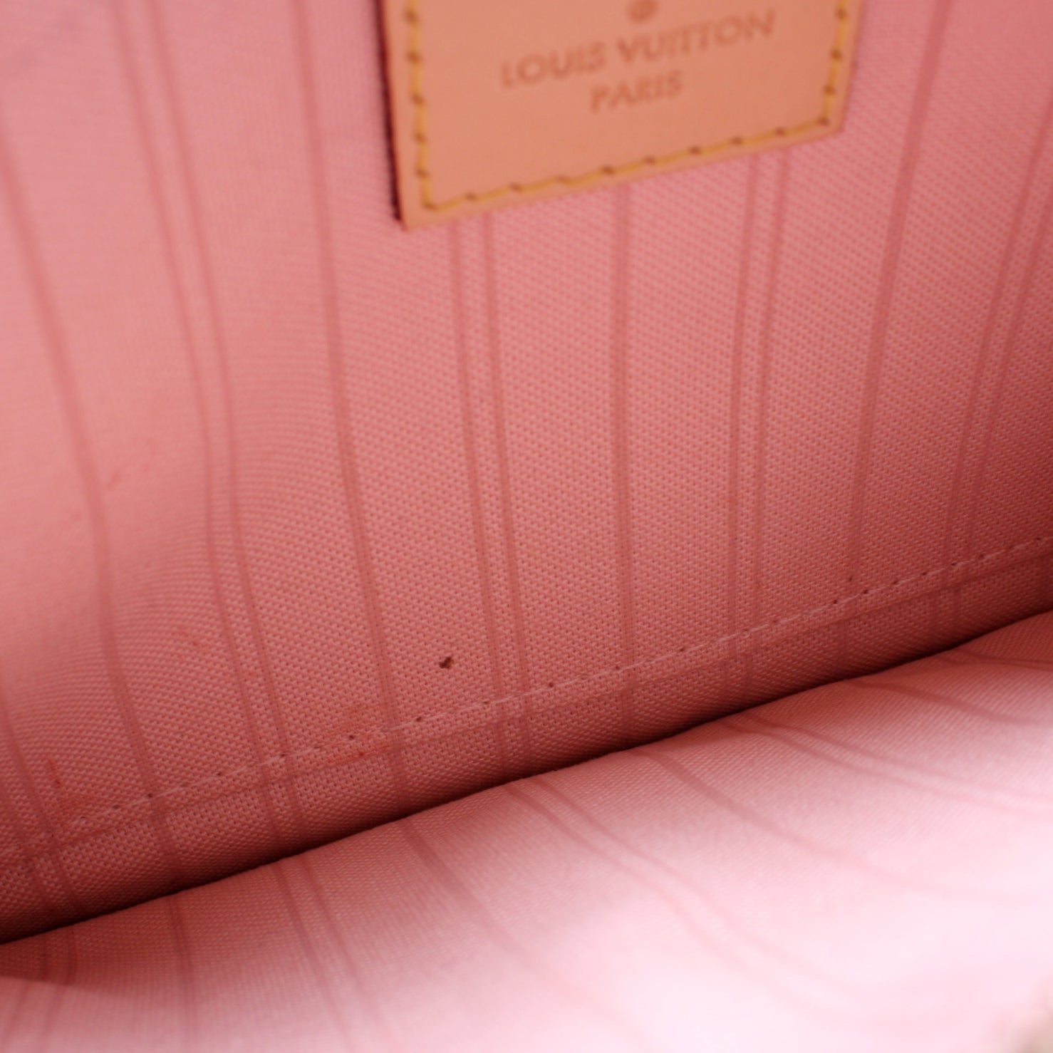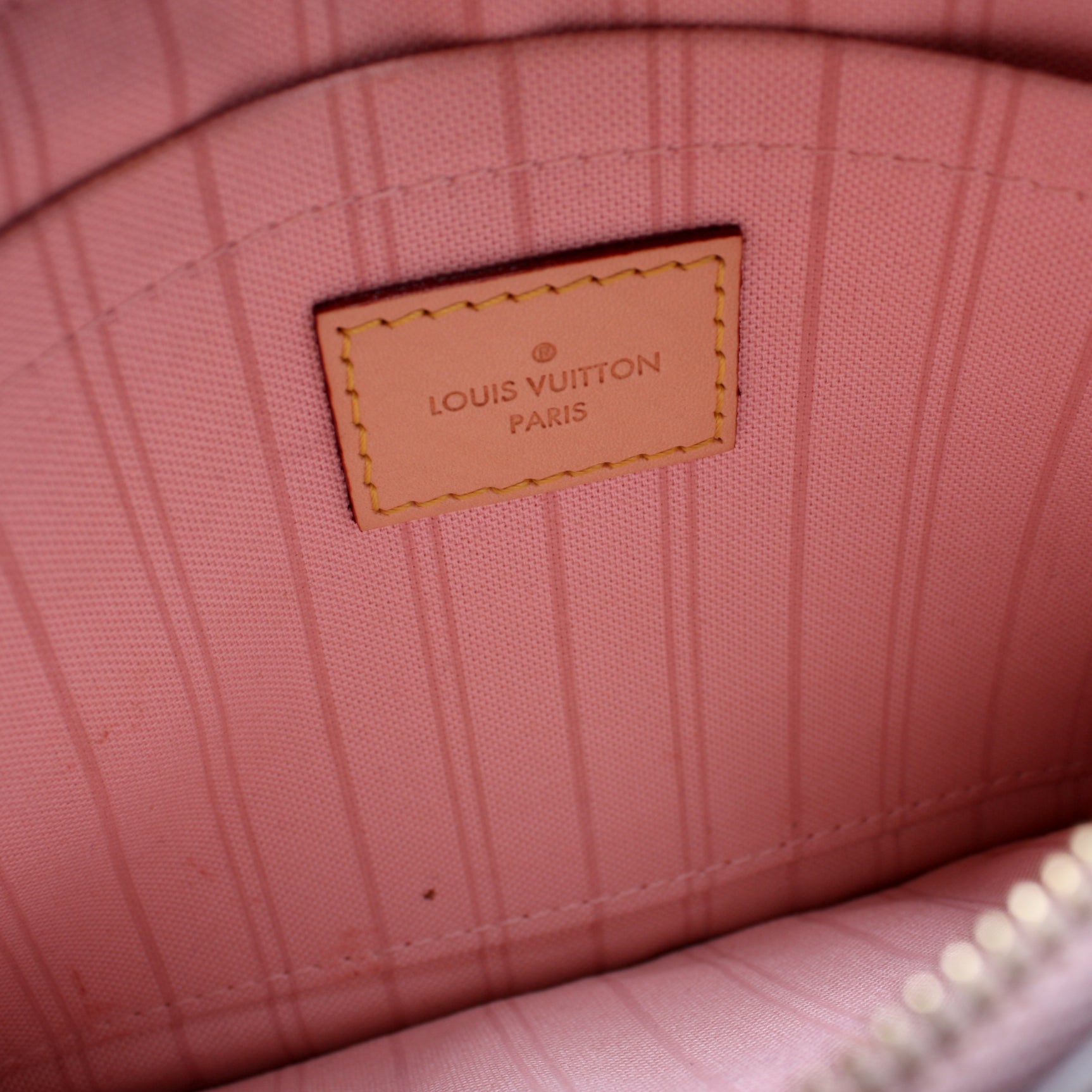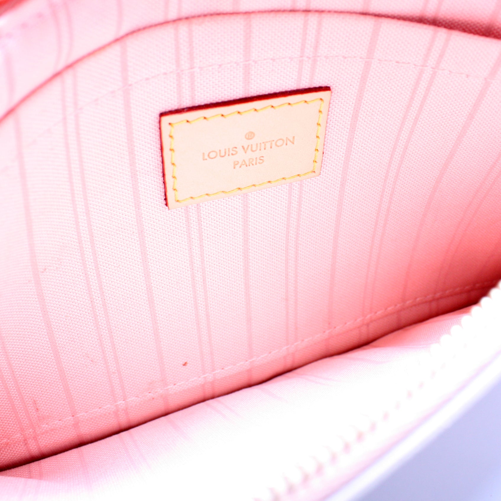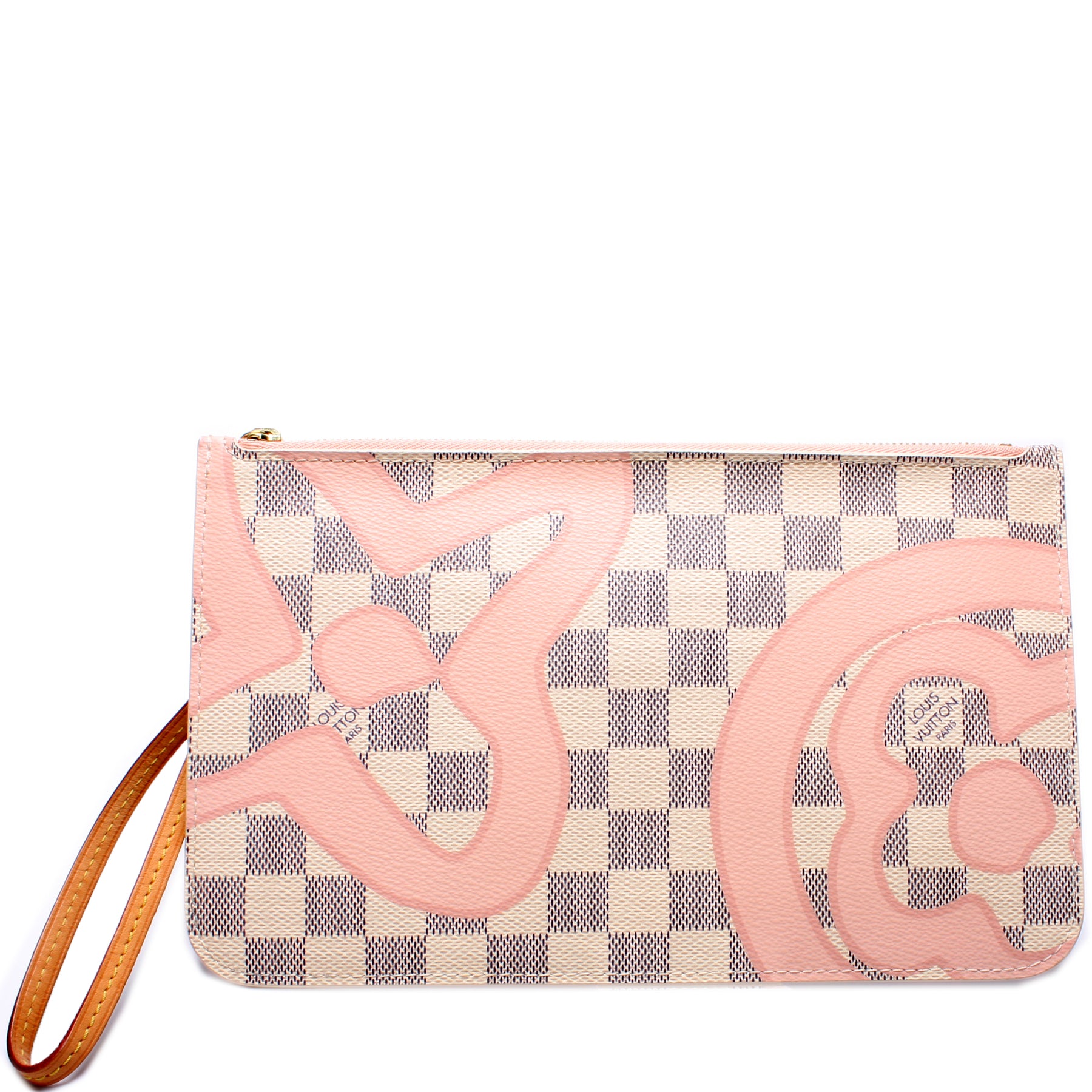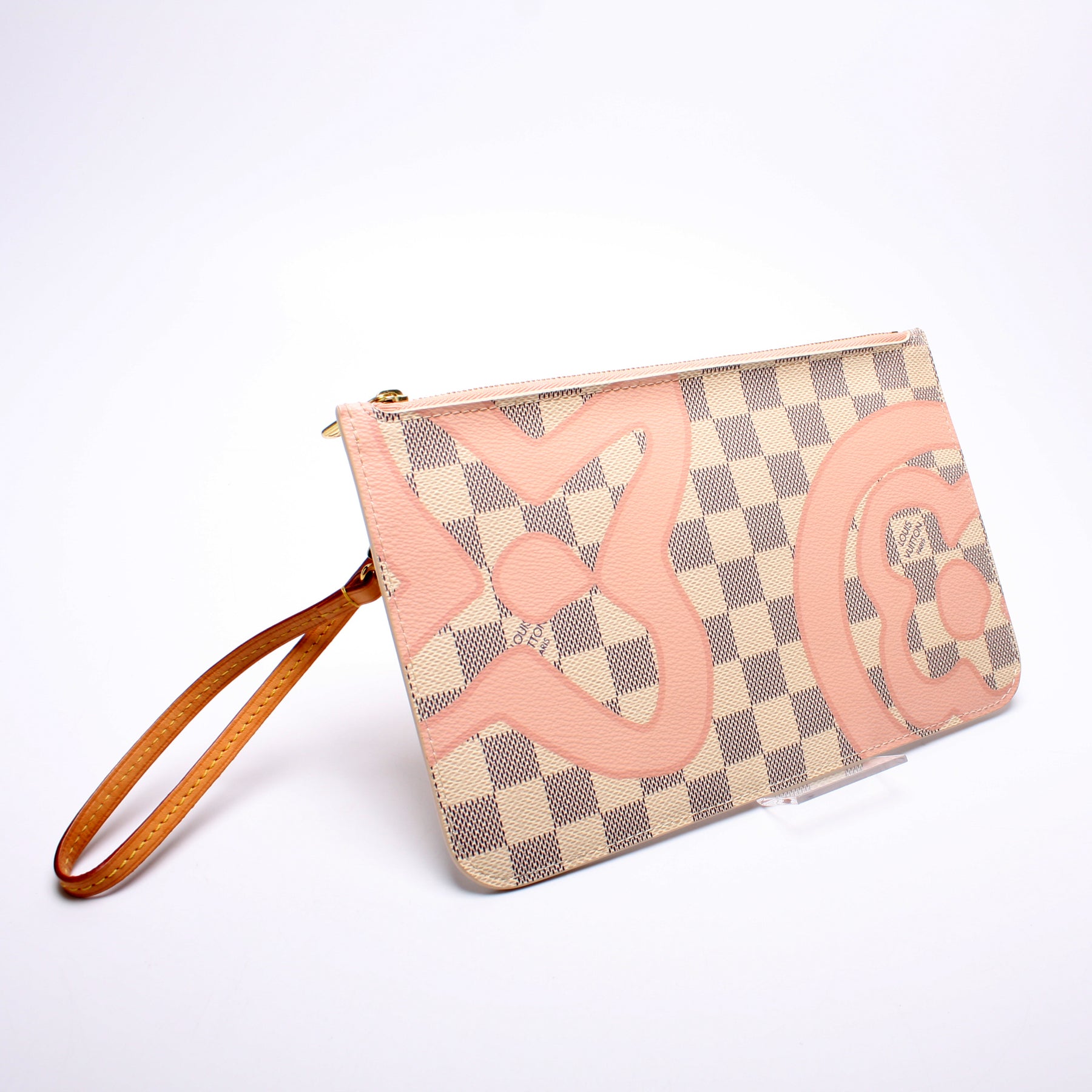 This pre-owned Louis Vuitton Pochette Only Neverfull Tahitienne is guaranteed 100% authentic. The exterior is in the classic Louis Vuitton Damier Azur coated canvas.
