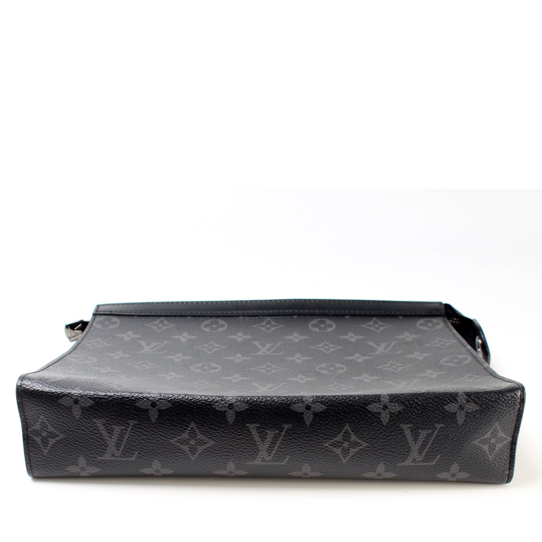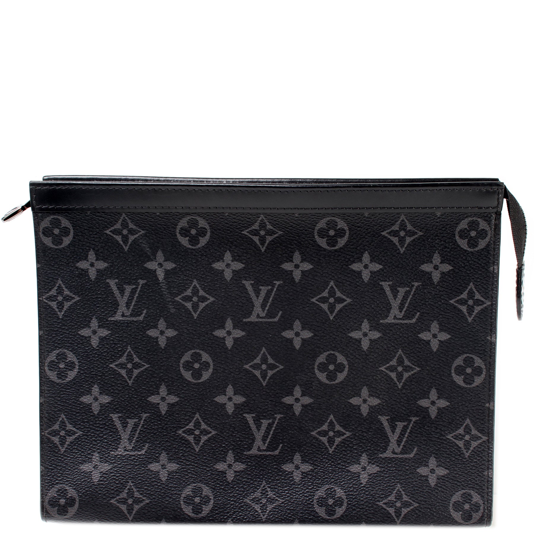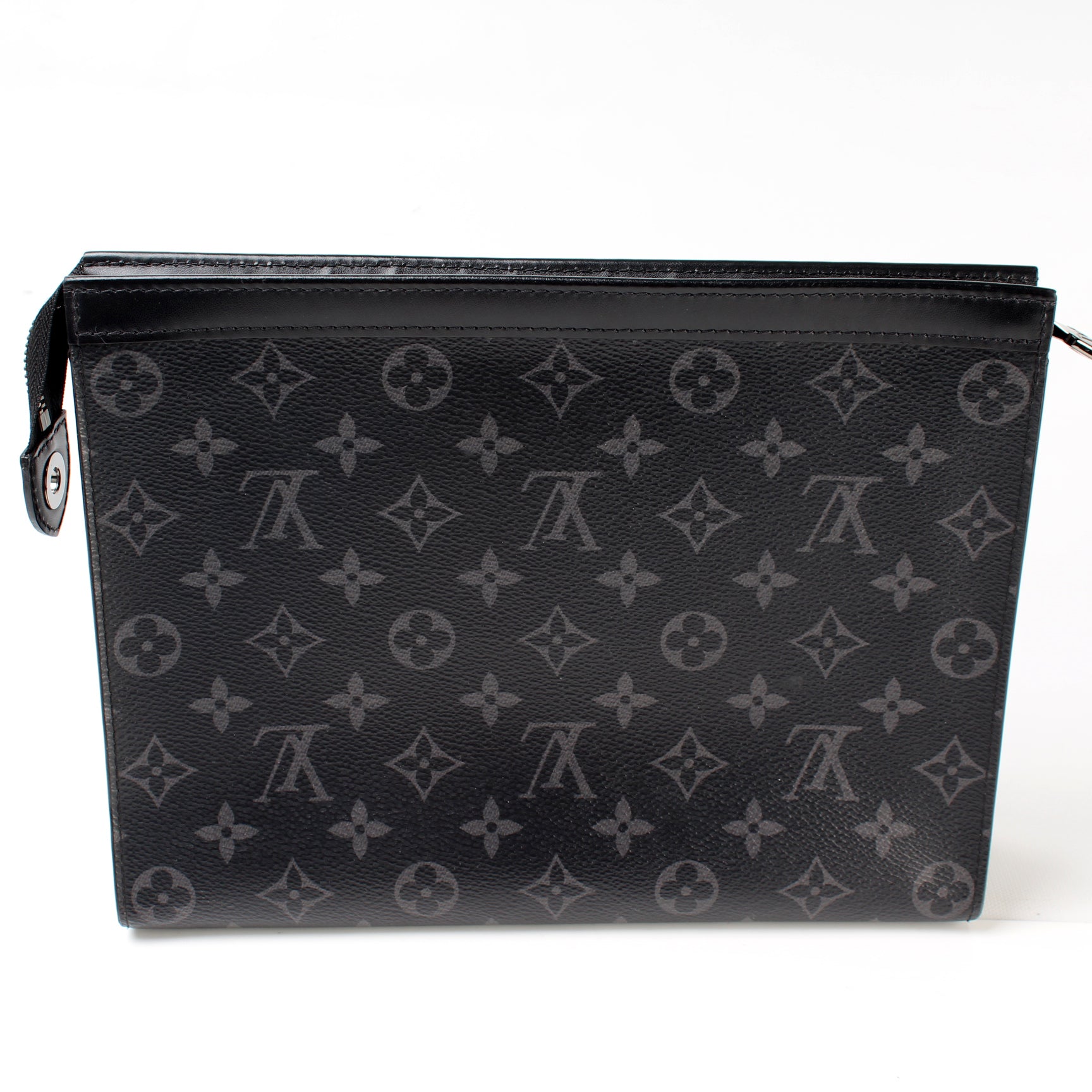 This pre-owned Louis Vuitton Pochette Voyage MM is guaranteed 100% authentic. The exterior is in the classic Louis Vuitton Monogram Eclipse coated canvas.