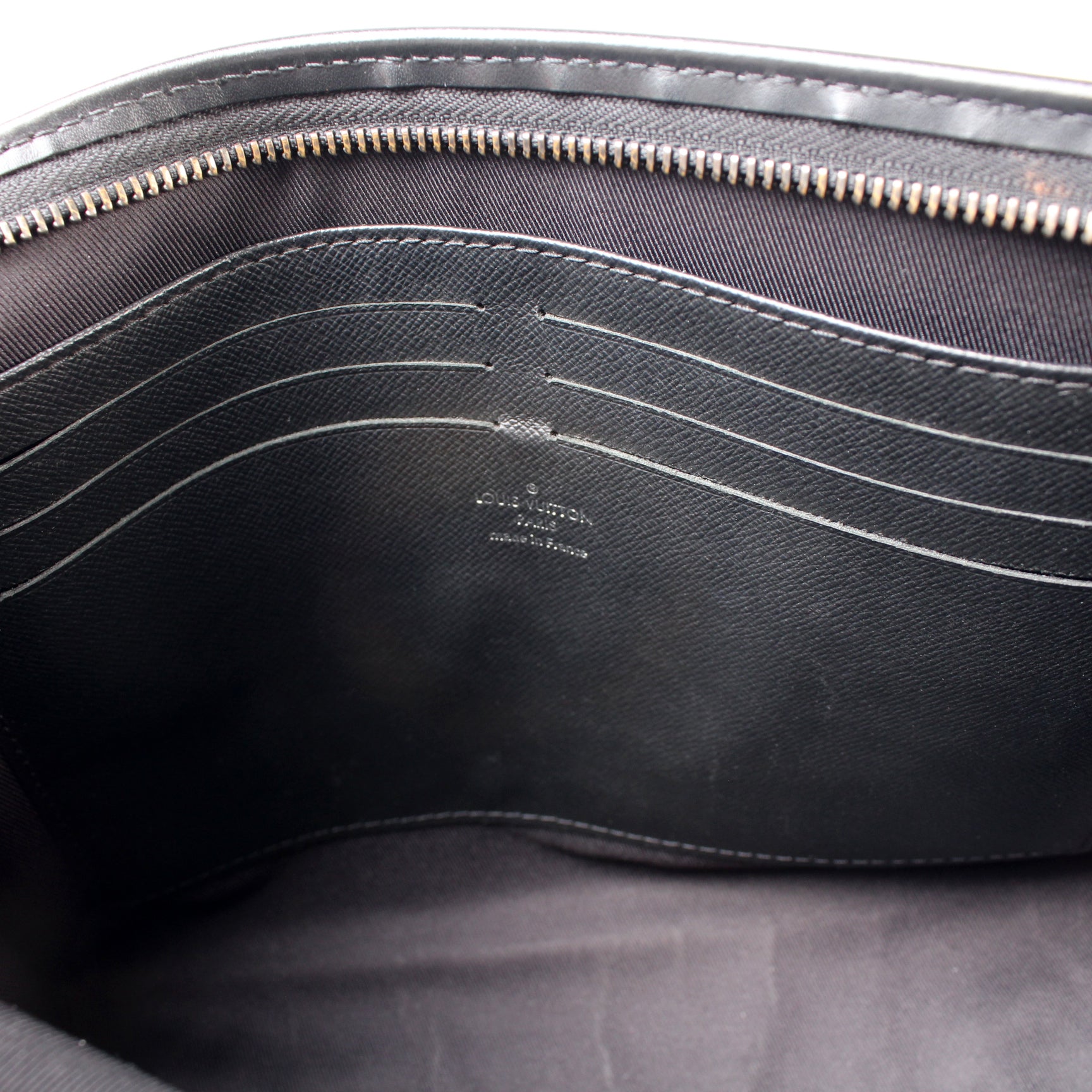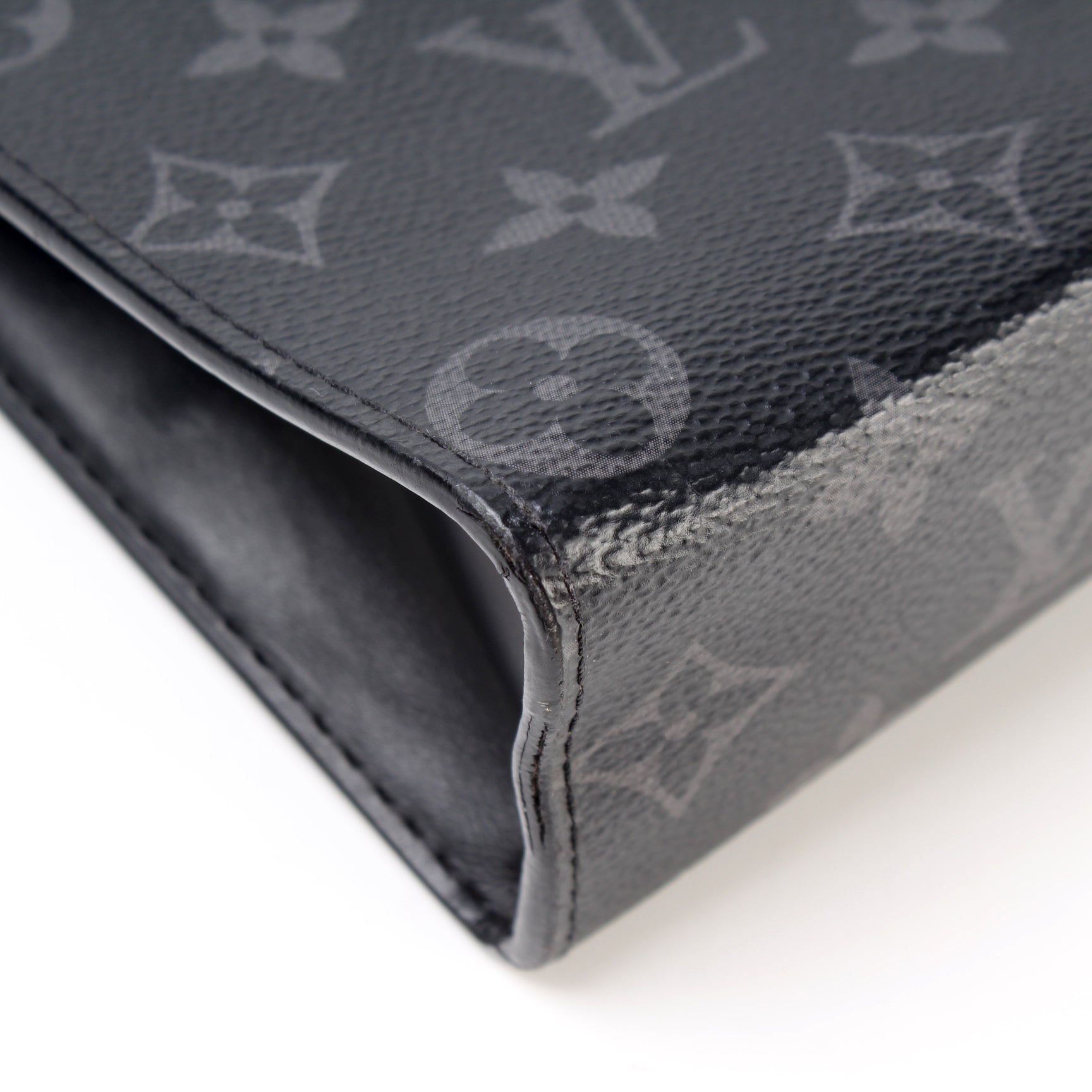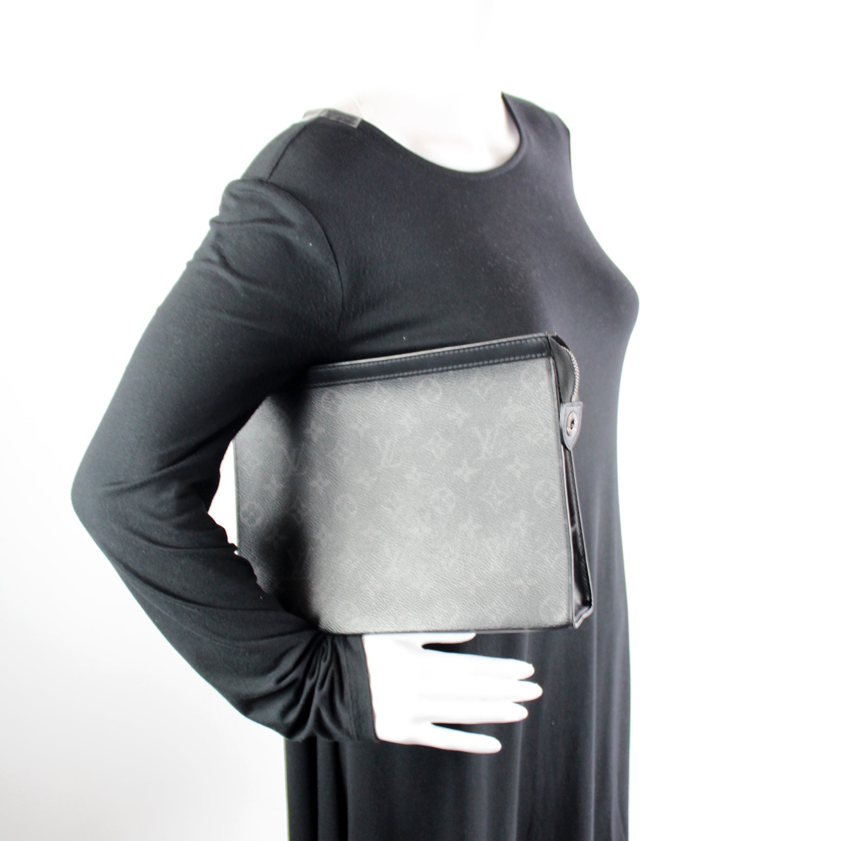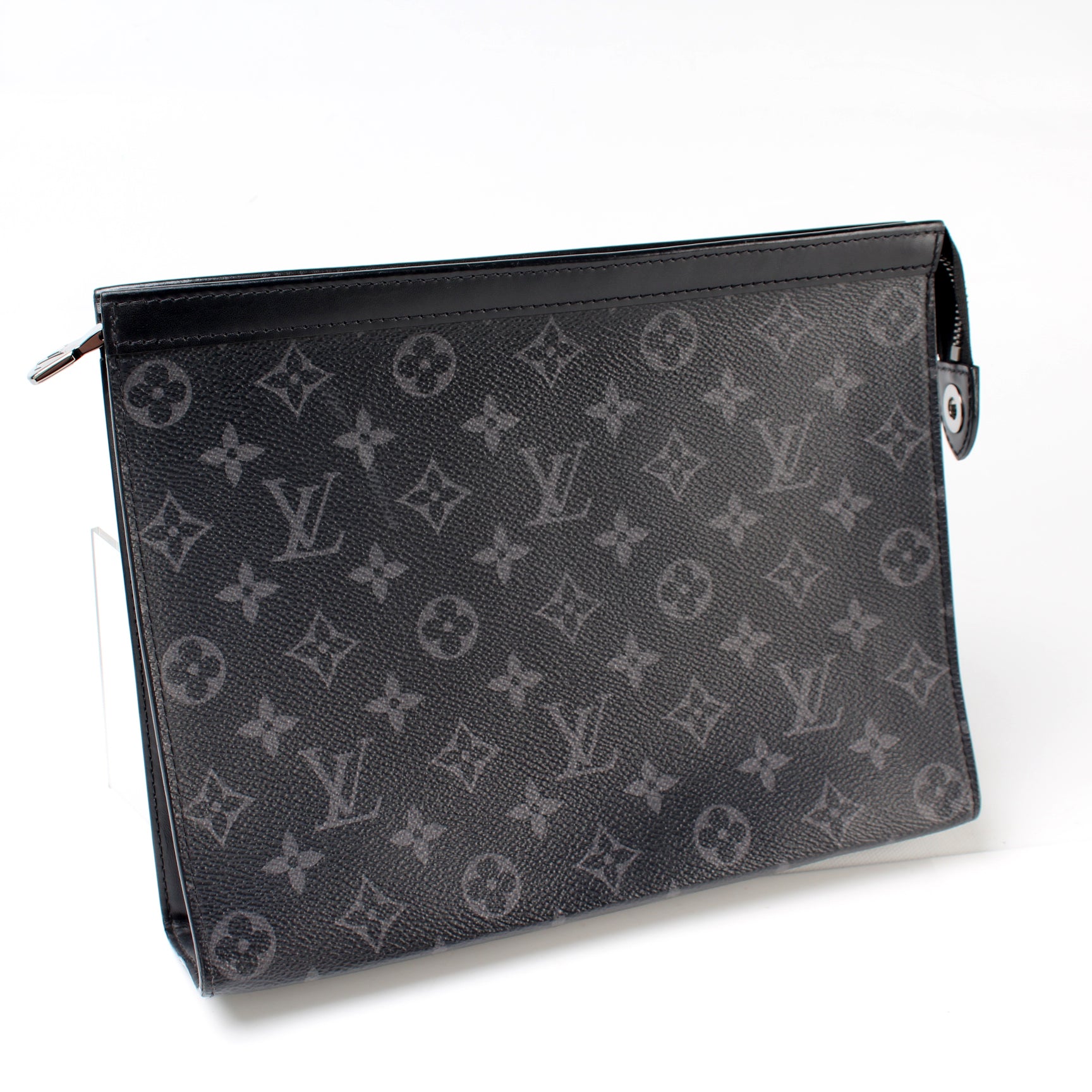 This pre-owned Louis Vuitton Pochette Voyage MM is guaranteed 100% authentic. The exterior is in the classic Louis Vuitton Monogram Eclipse coated canvas.