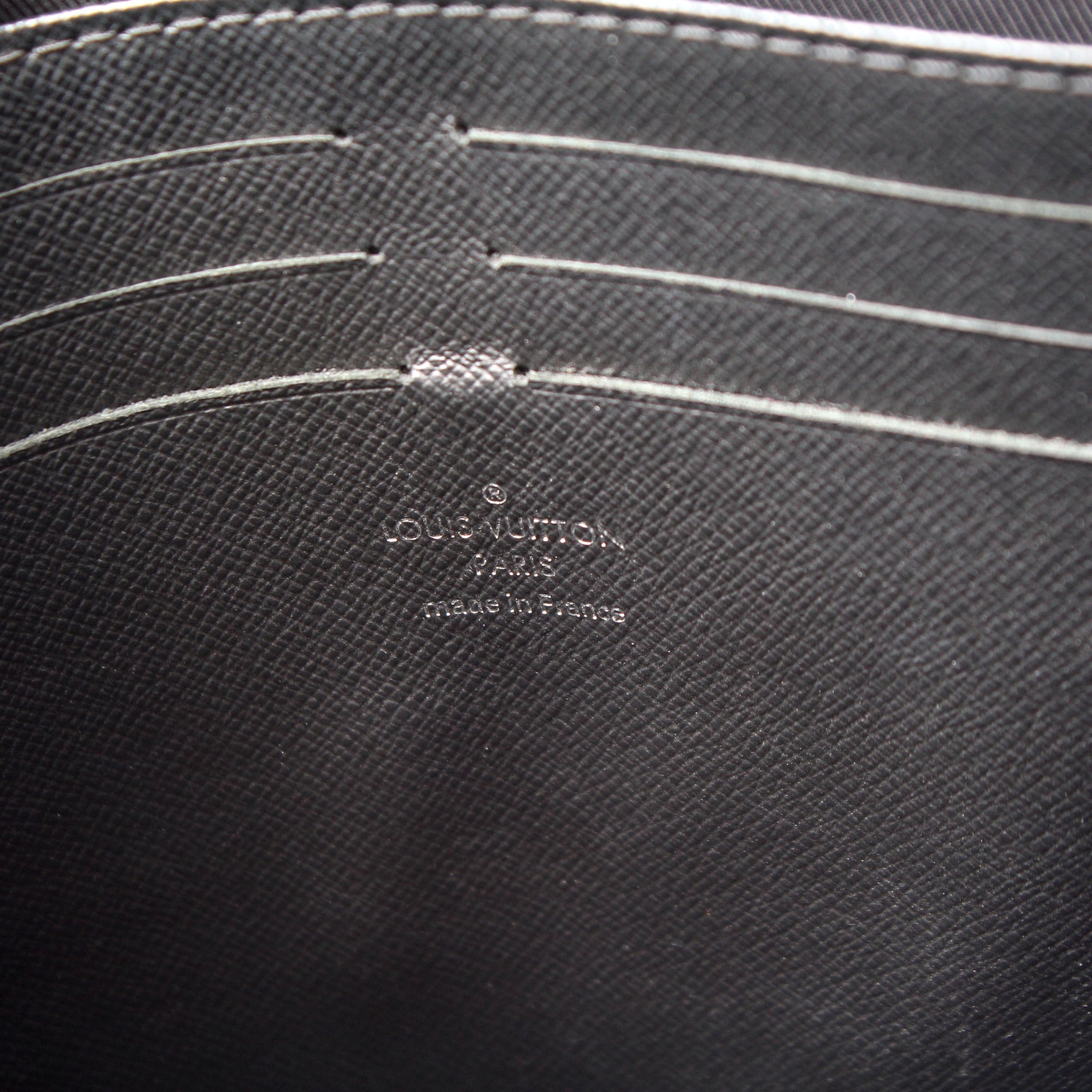 Interior: The interior is free of rips or tears. The interior has stains as show in the pictures. The interior features one open pocket, and six card slots.