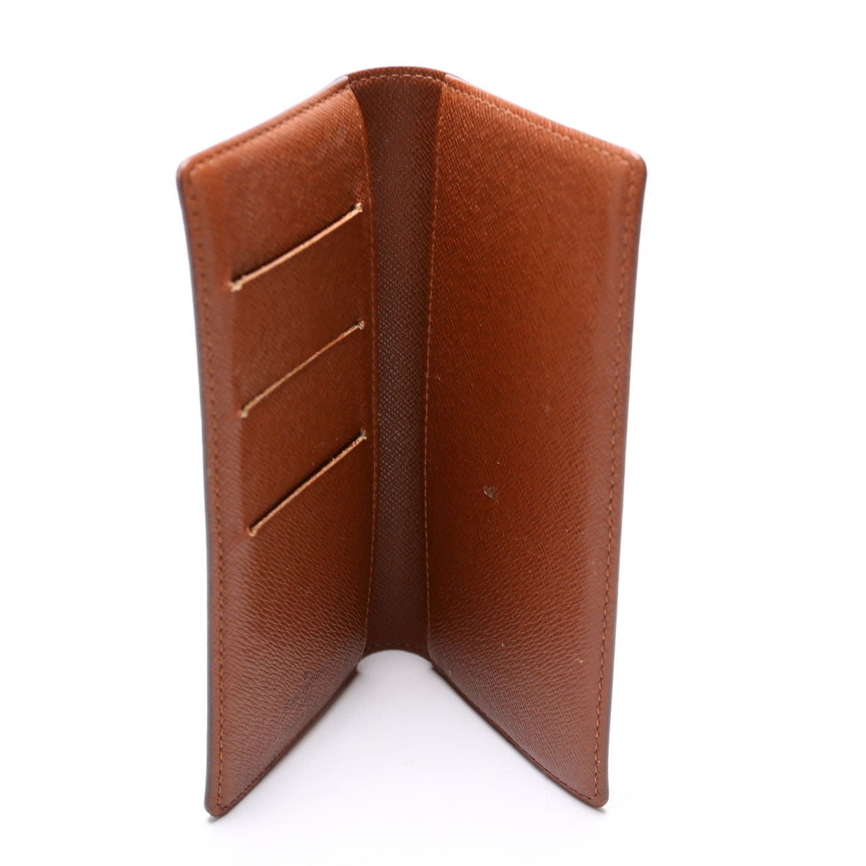 Interior: The interior shows light wear and rubbing. It features three card slots and two open pockets.