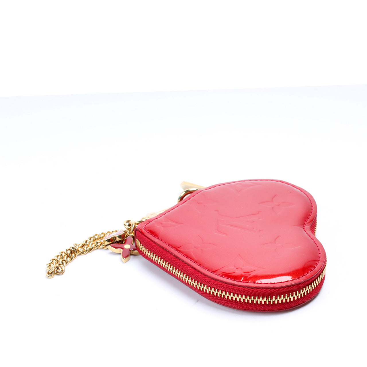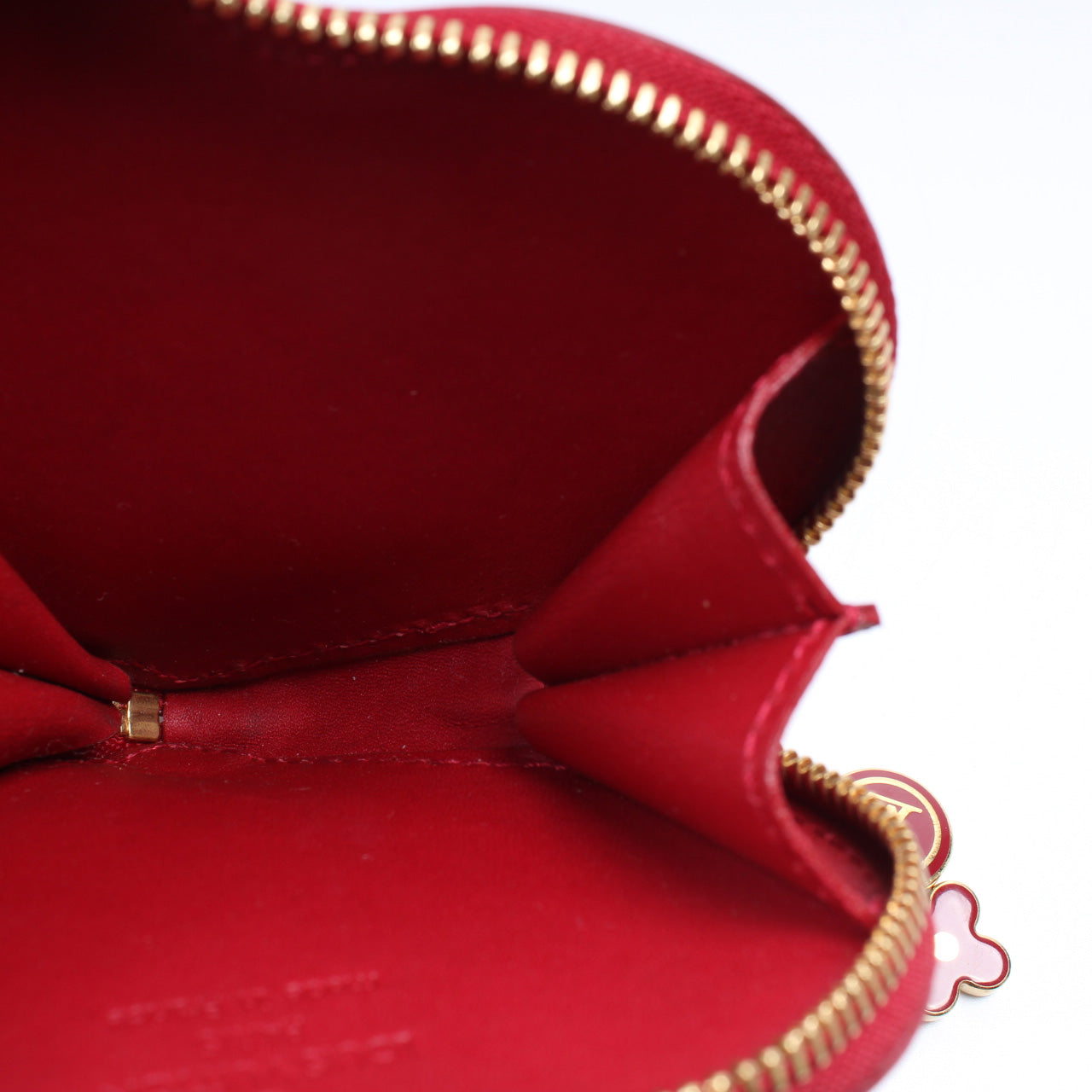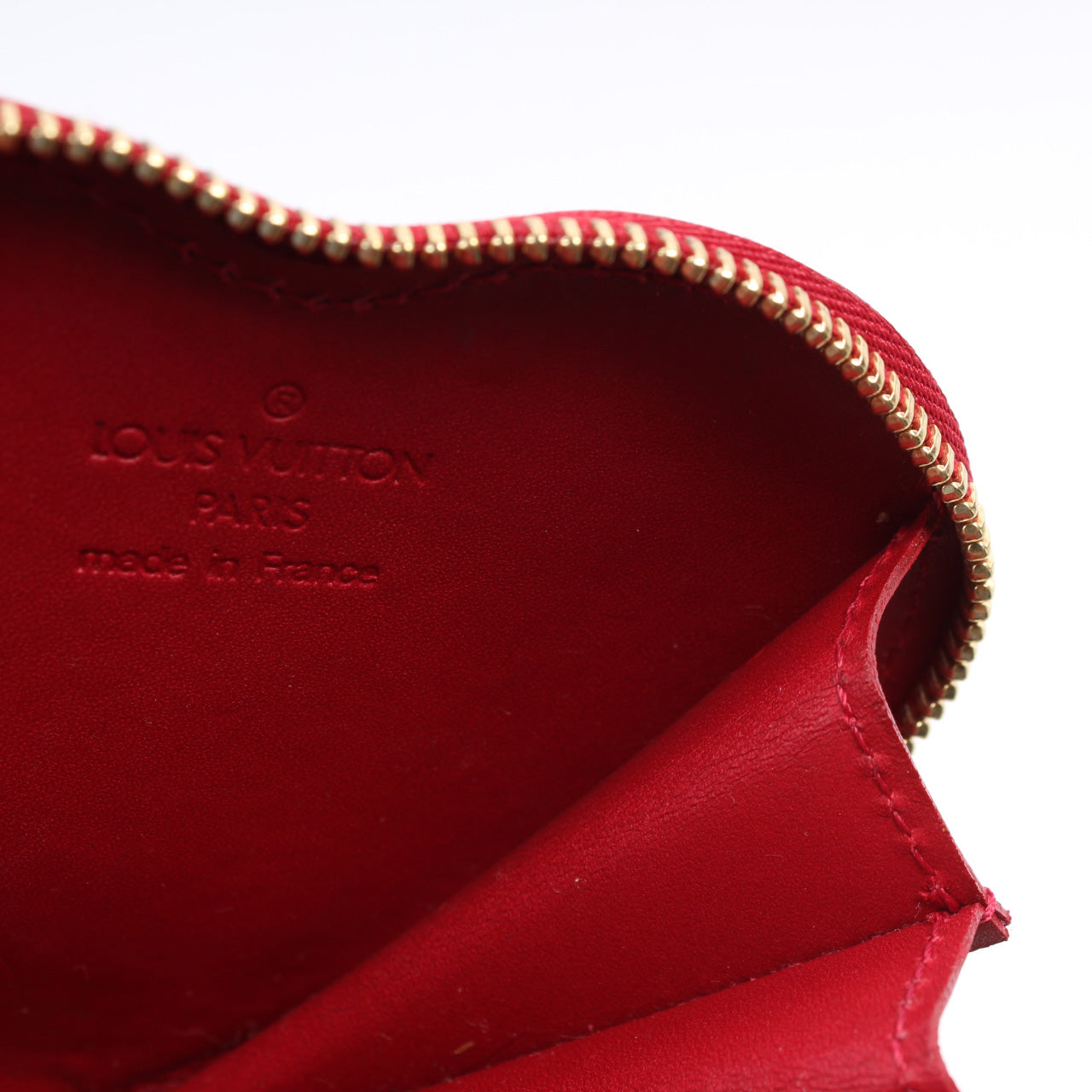 This pre-owned Louis Vuitton Pomme D'Amour Heart Coin Purse is guaranteed 100% authentic. The exterior is in the classic Vernis leather.