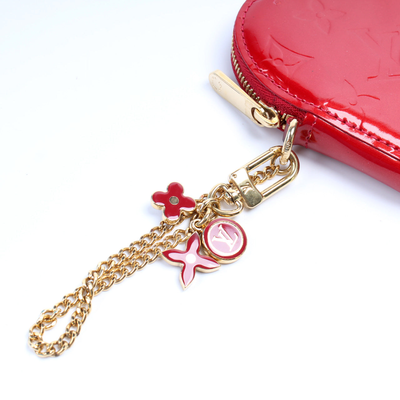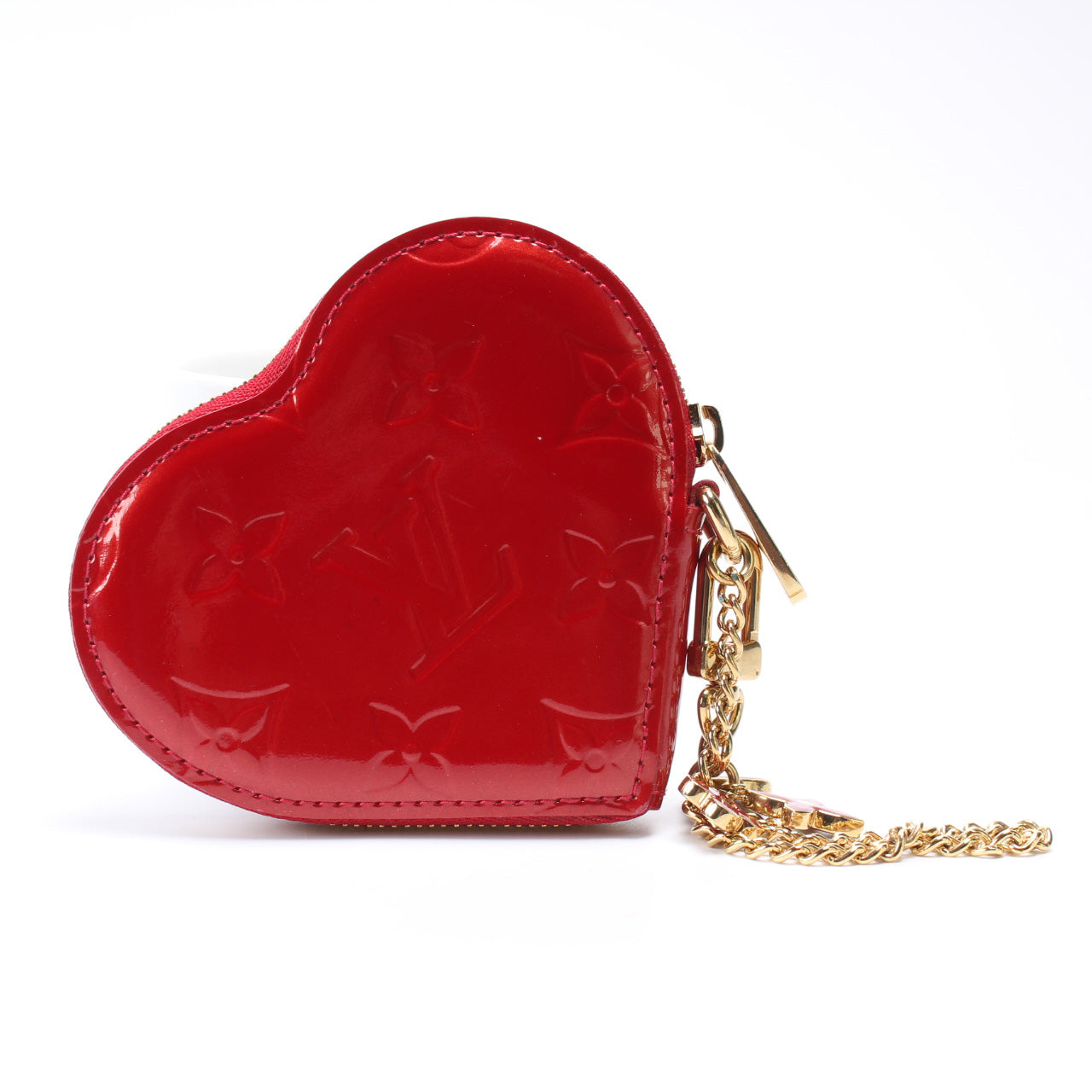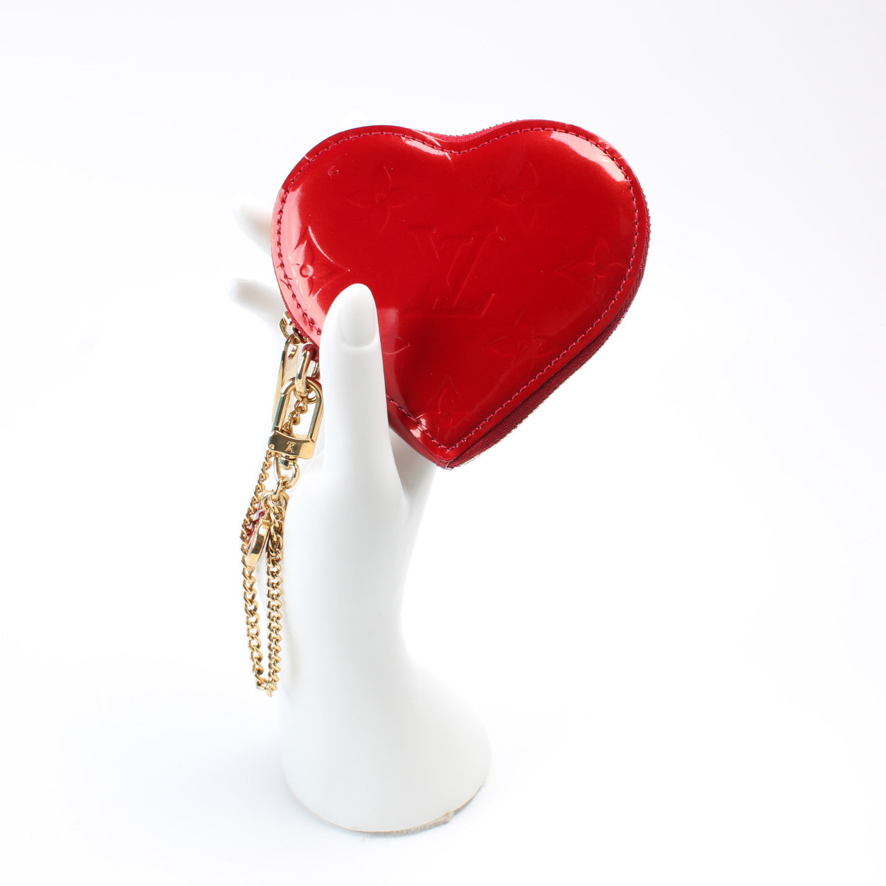 This pre-owned Louis Vuitton Pomme D'Amour Heart Coin Purse is guaranteed 100% authentic. The exterior is in the classic Vernis leather.