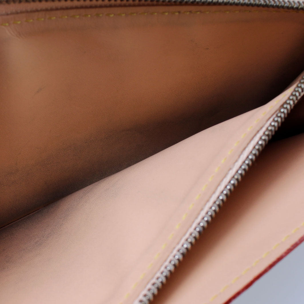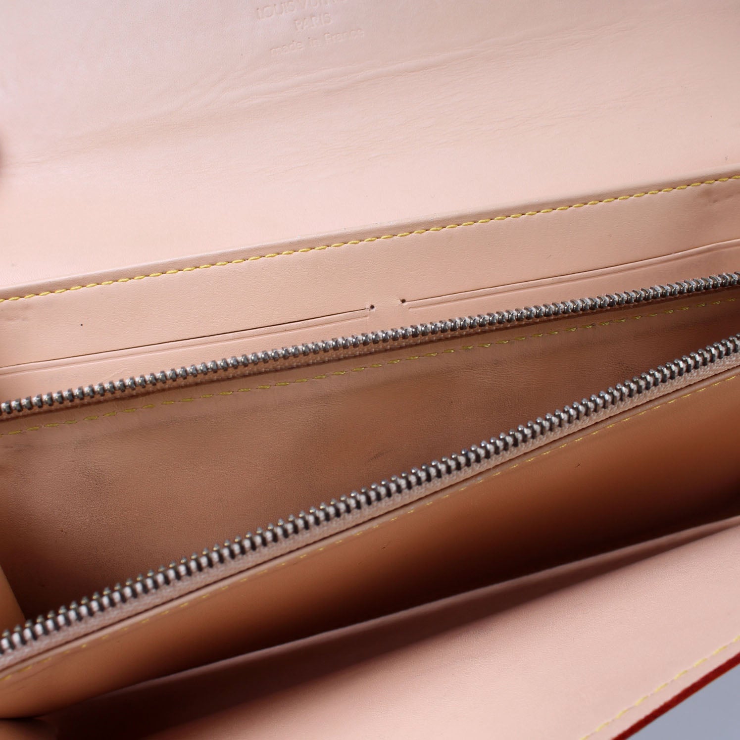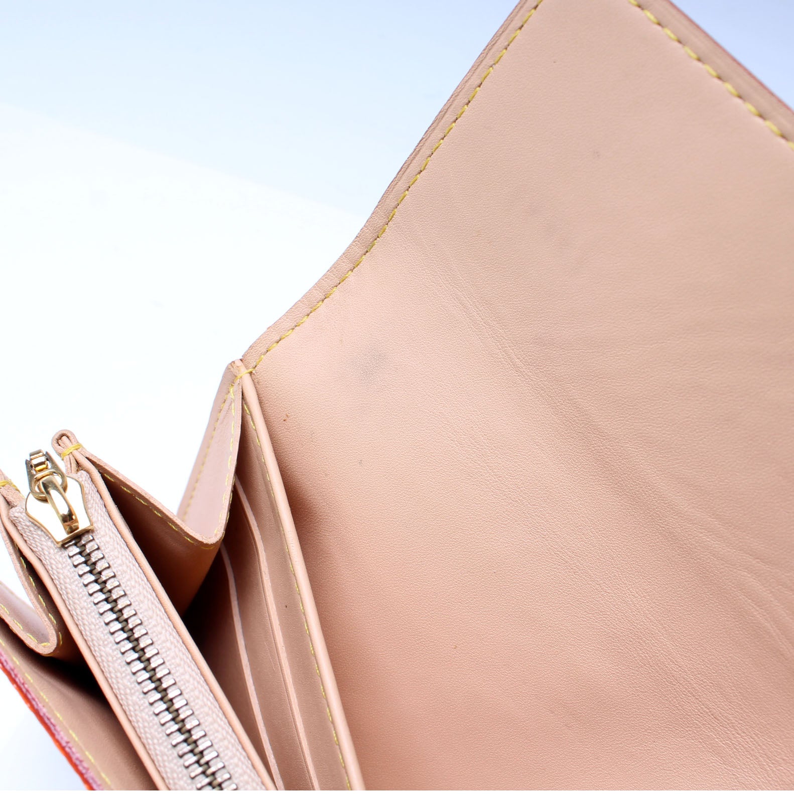 Interior: The interior shows some light marks, discoloration to the interior zipper coin pouch, and impressions where the flap folds. The interior features two open slots and one zip closure pocket.