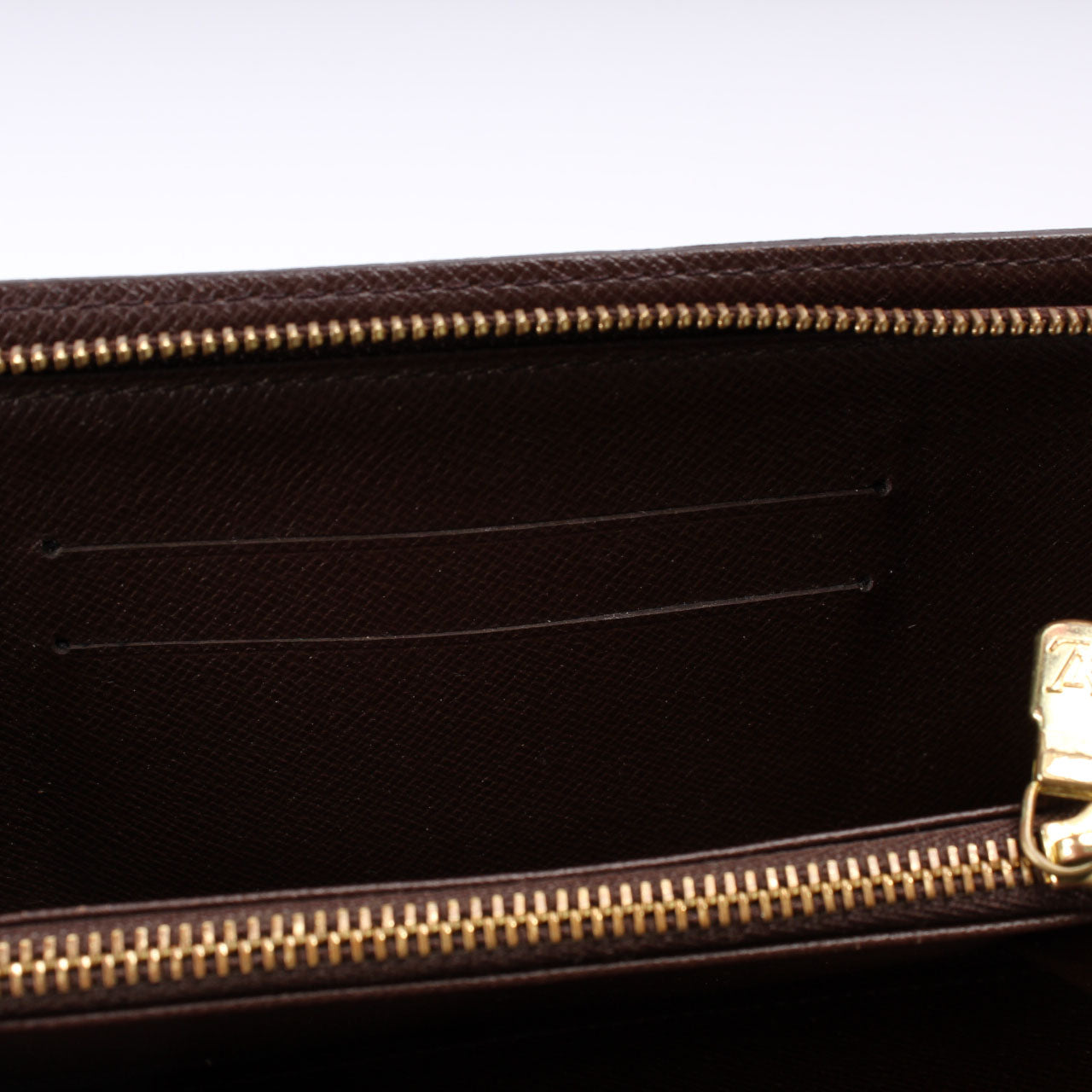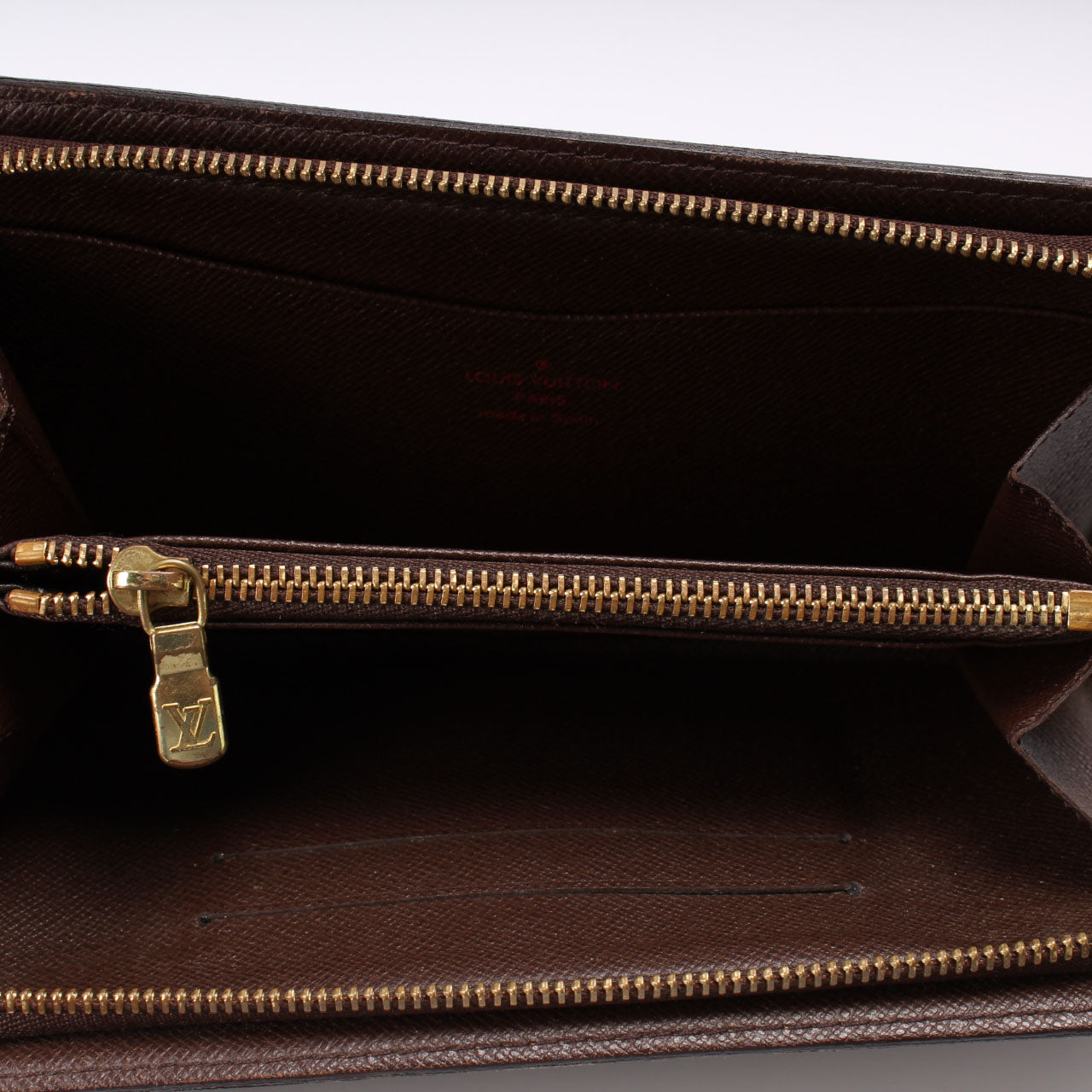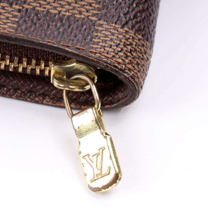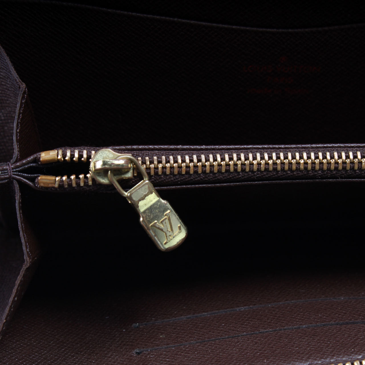 This pre-owned Louis Vuitton Porte Monnaie Zippy is guaranteed 100% authentic. The exterior is in the classic Louis Vuitton Damier Ebene coated canvas.
