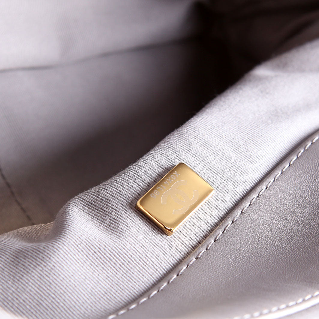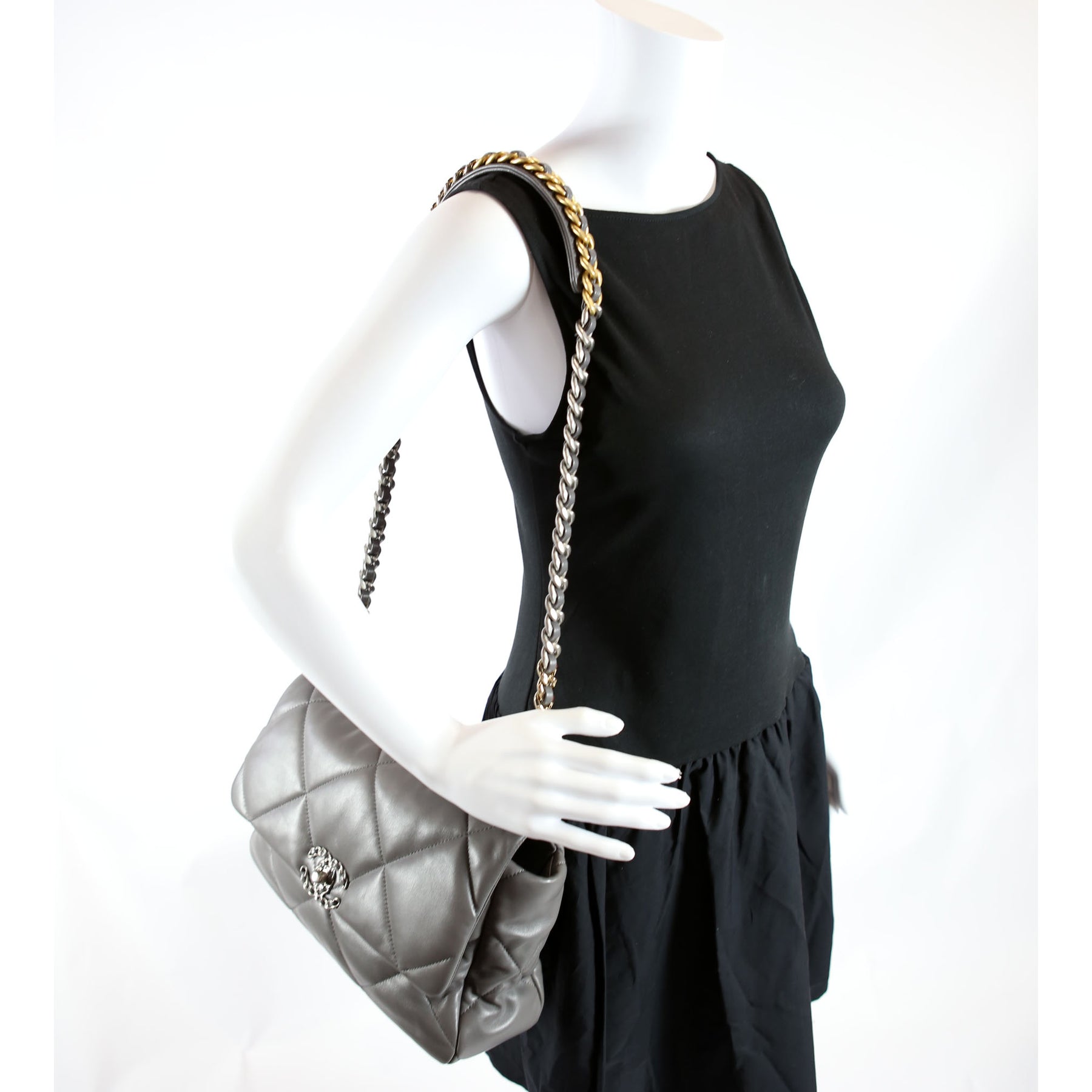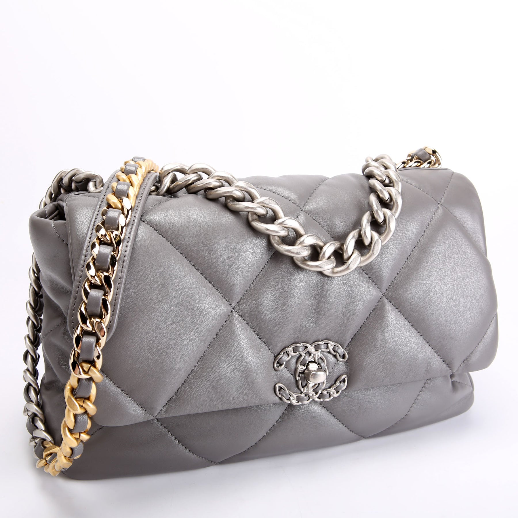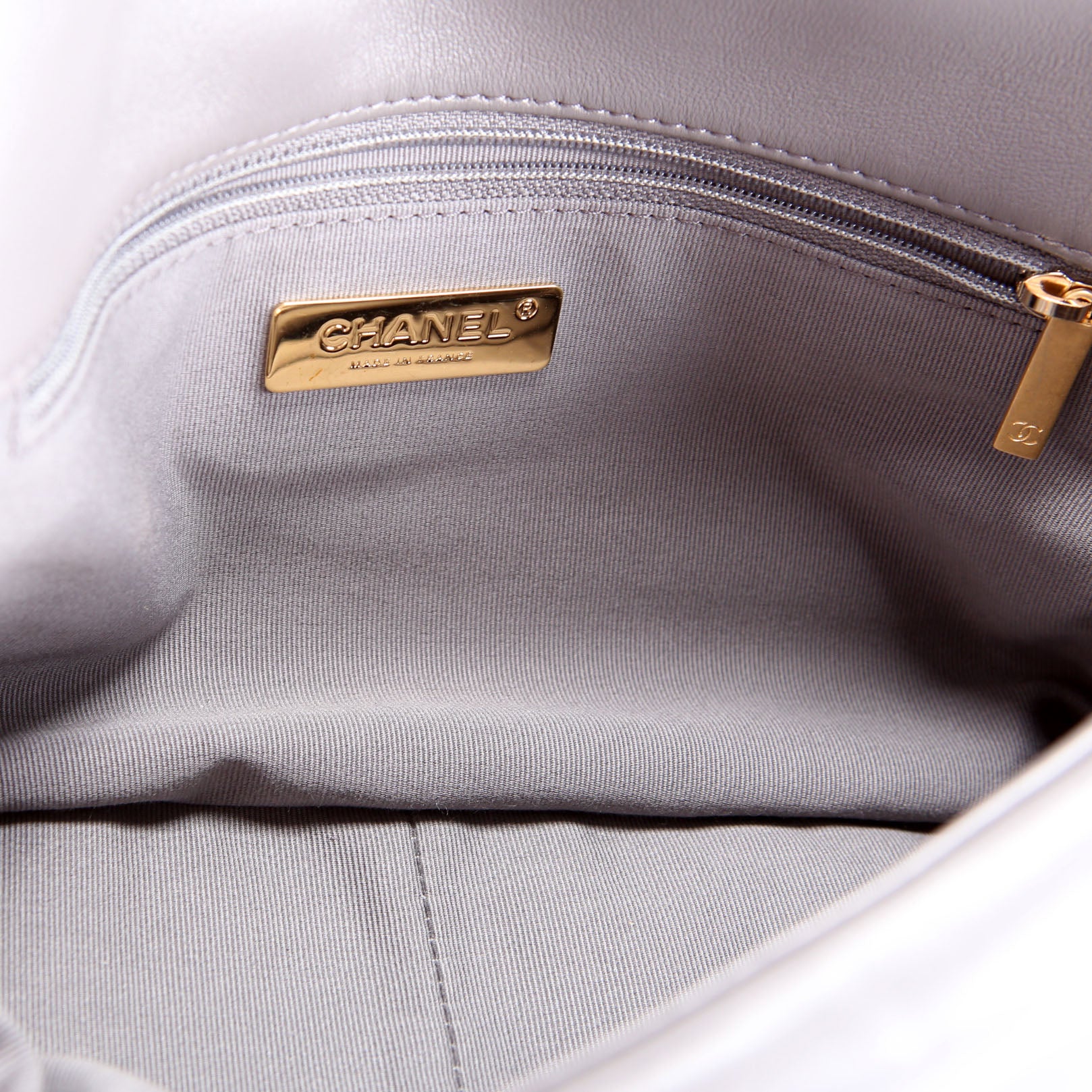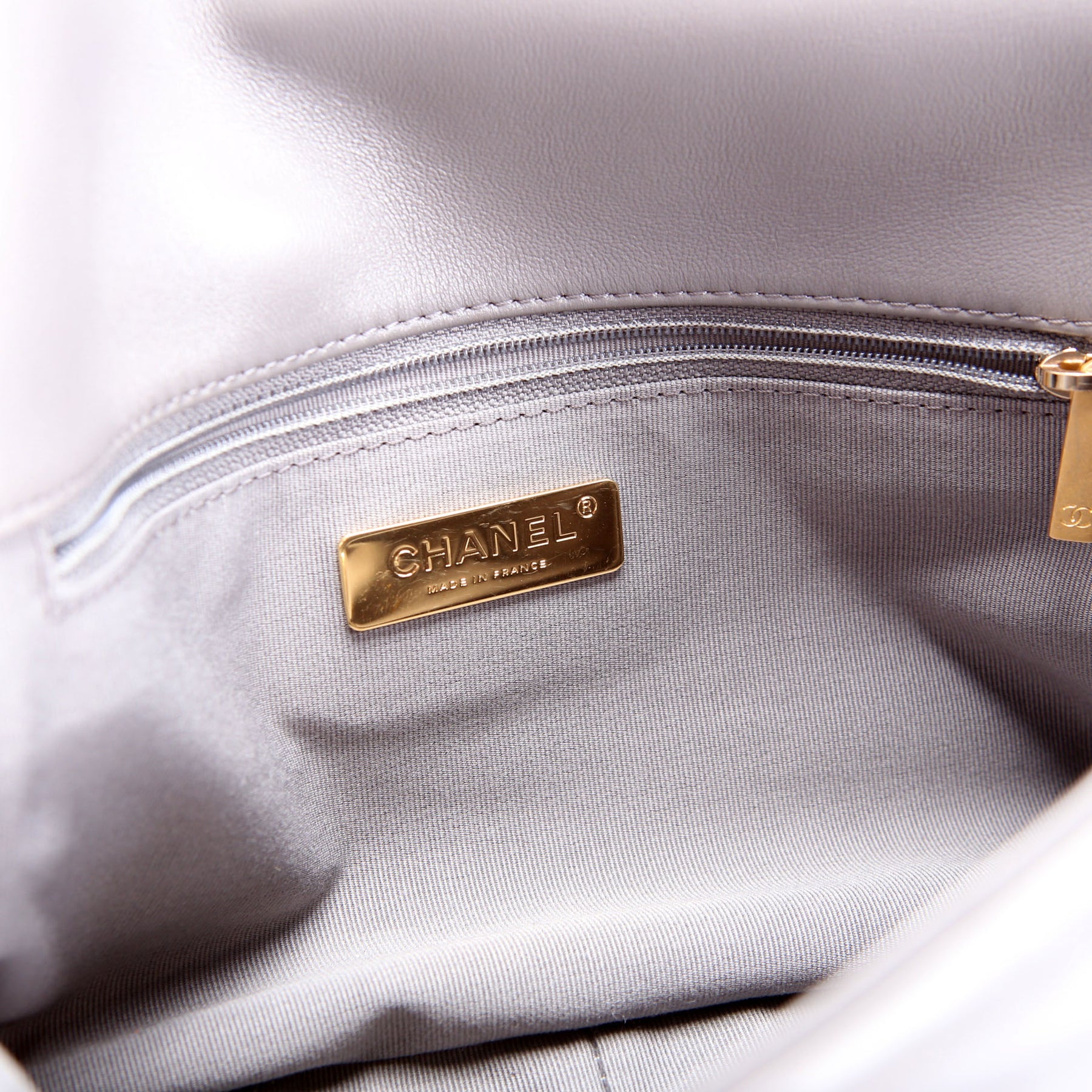 This pre-owned Chanel Quilted Goatskin 19Medium Flap RFID is guaranteed 100% authentic. The exterior is in the classic Chanel Goatskin leather.
