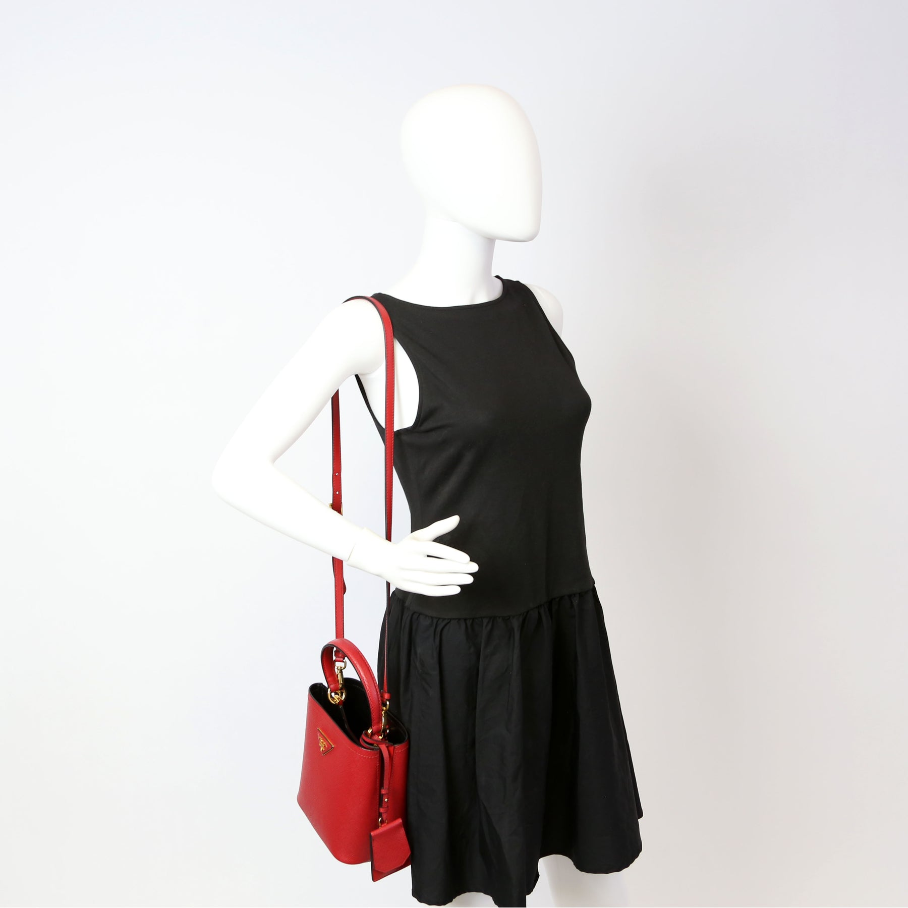 This pre-owned Prada Saffiano Cuir Small Panier Bag is guaranteed 100% authentic. The exterior is in the classic Prada Saffiano leather.