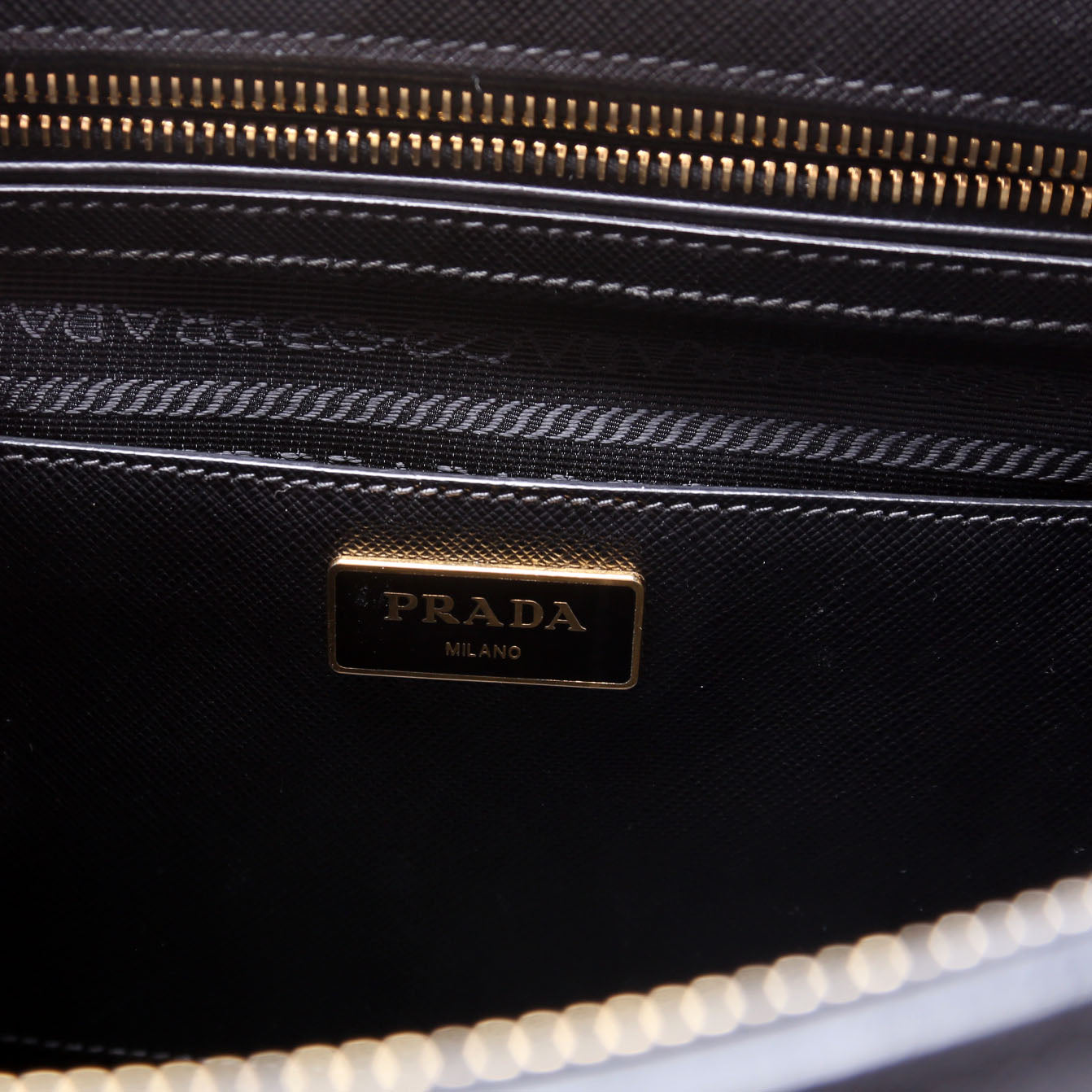 Interior: The interior is clean and free of rips or tears. The interior features three open pockets, one zip closure pocket, and two zip closure sections.