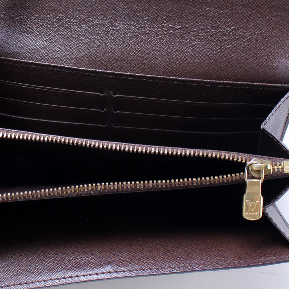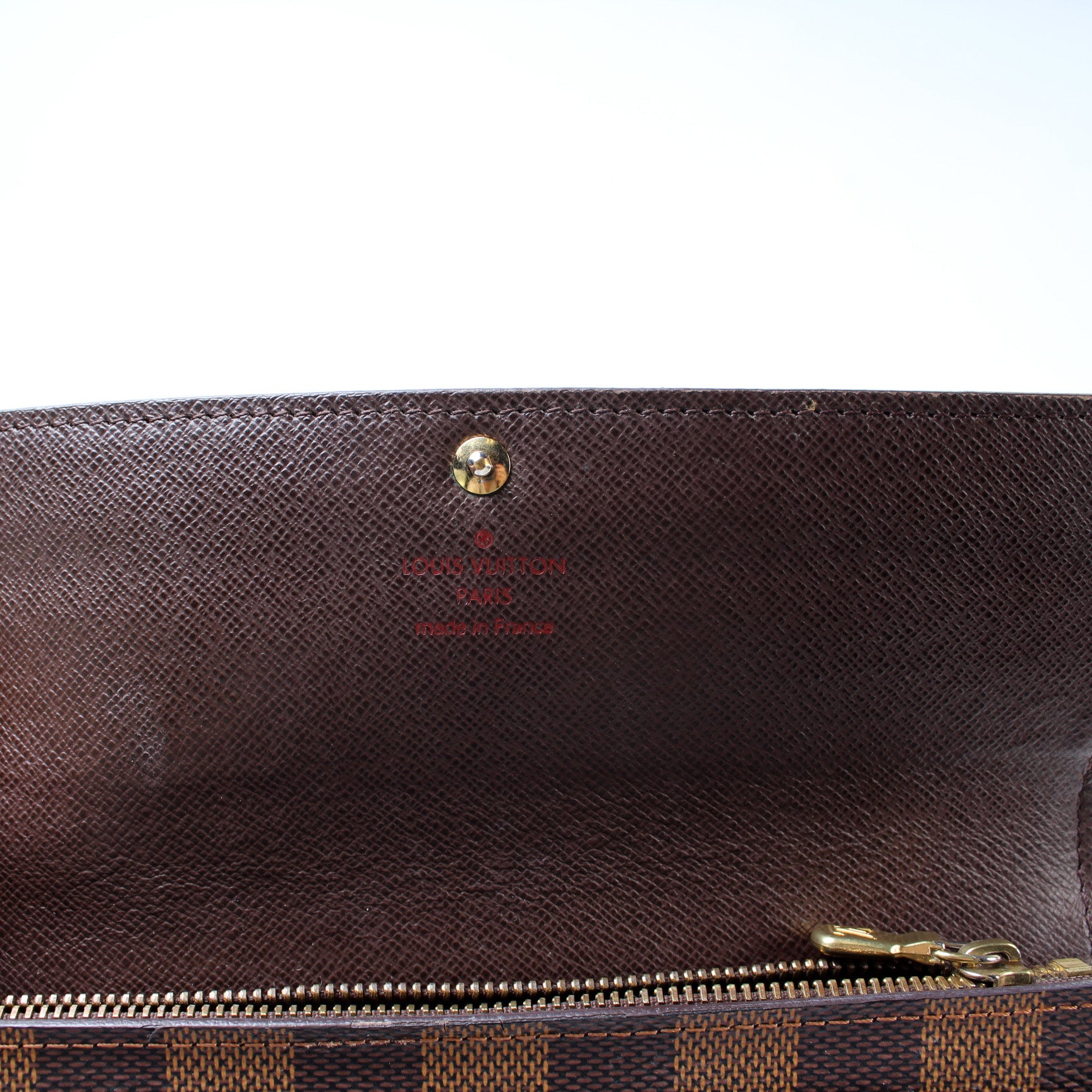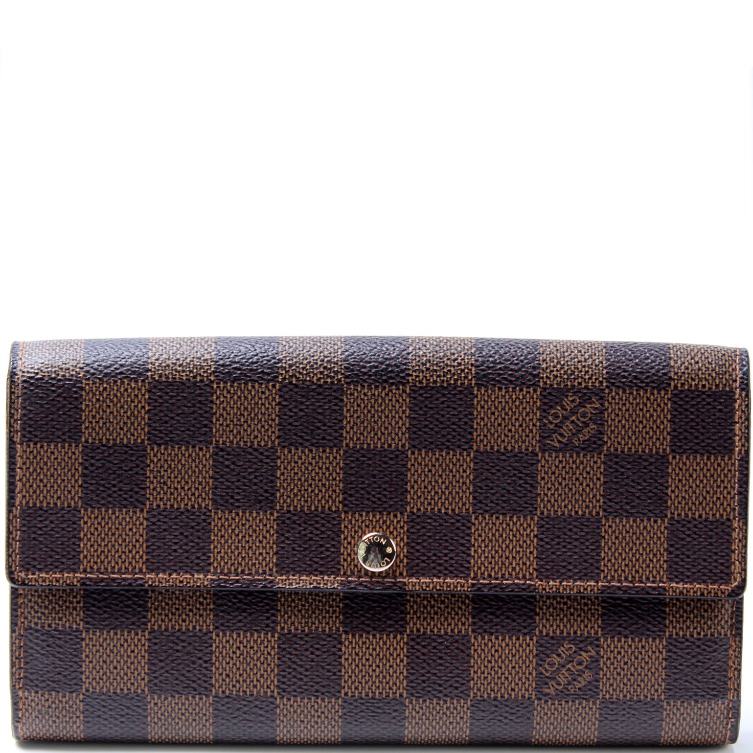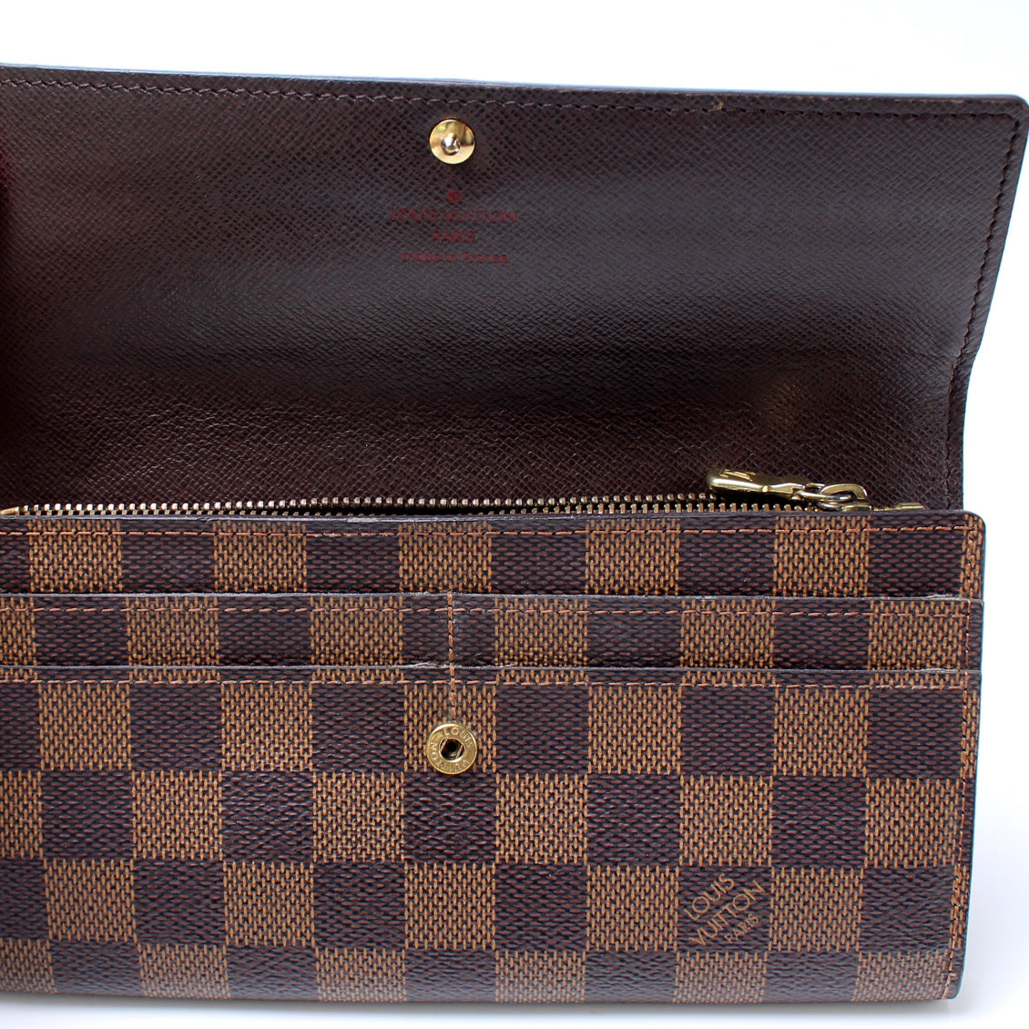 This Louis Vuitton Sarah Wallet is guaranteed 100% authentic. The exterior is in the classic Damier Ebene coated canvas.