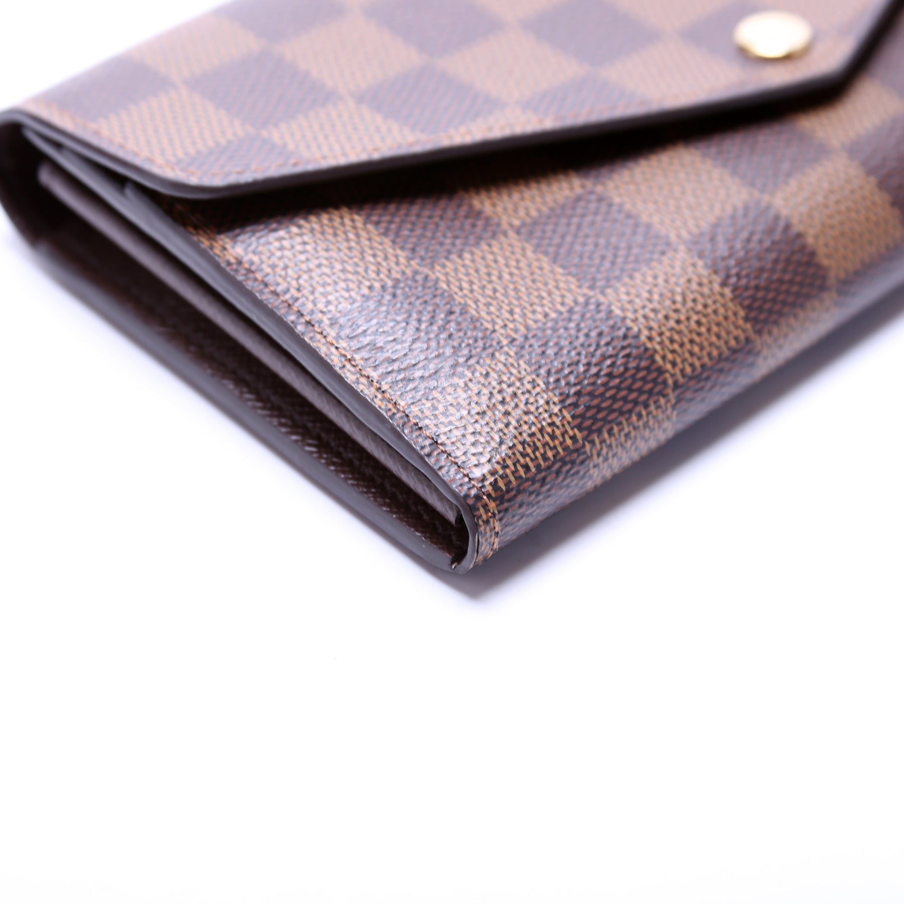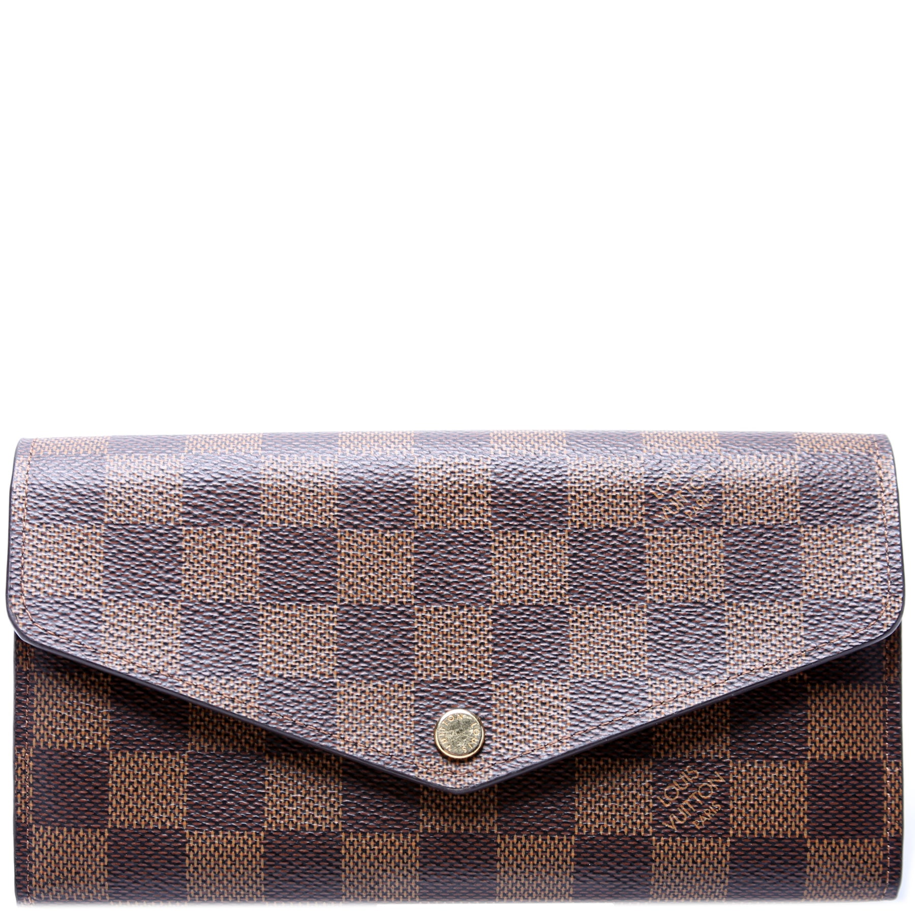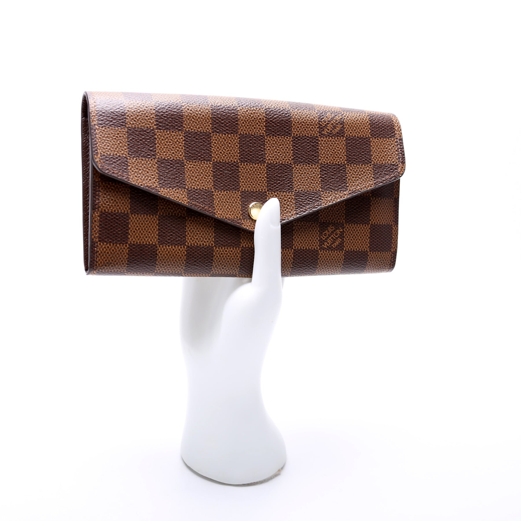 This pre-owned Louis Vuitton Sarah Wallet is guaranteed 100% authentic. The exterior is in the classic Louis Vuitton Damier Ebene coated canvas.