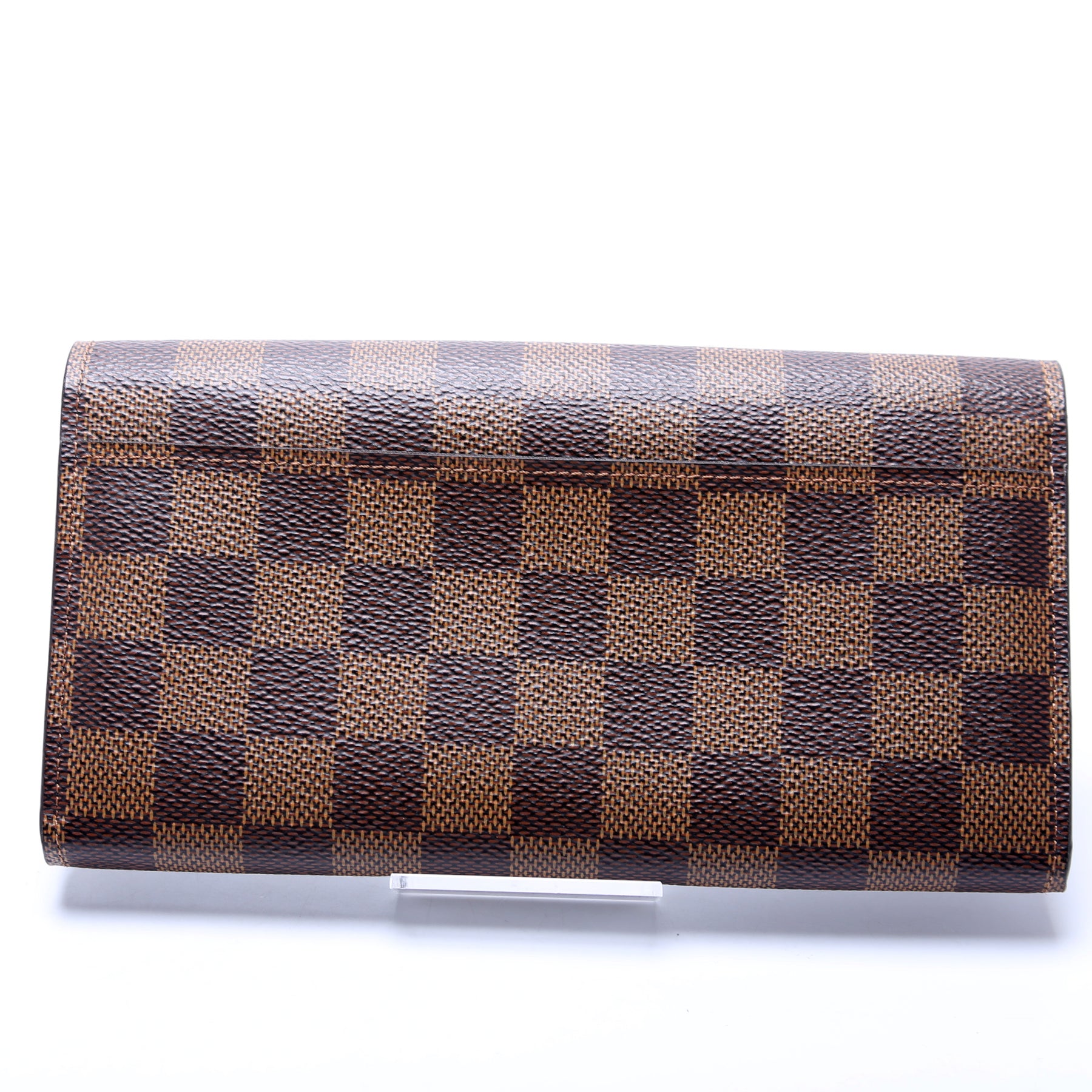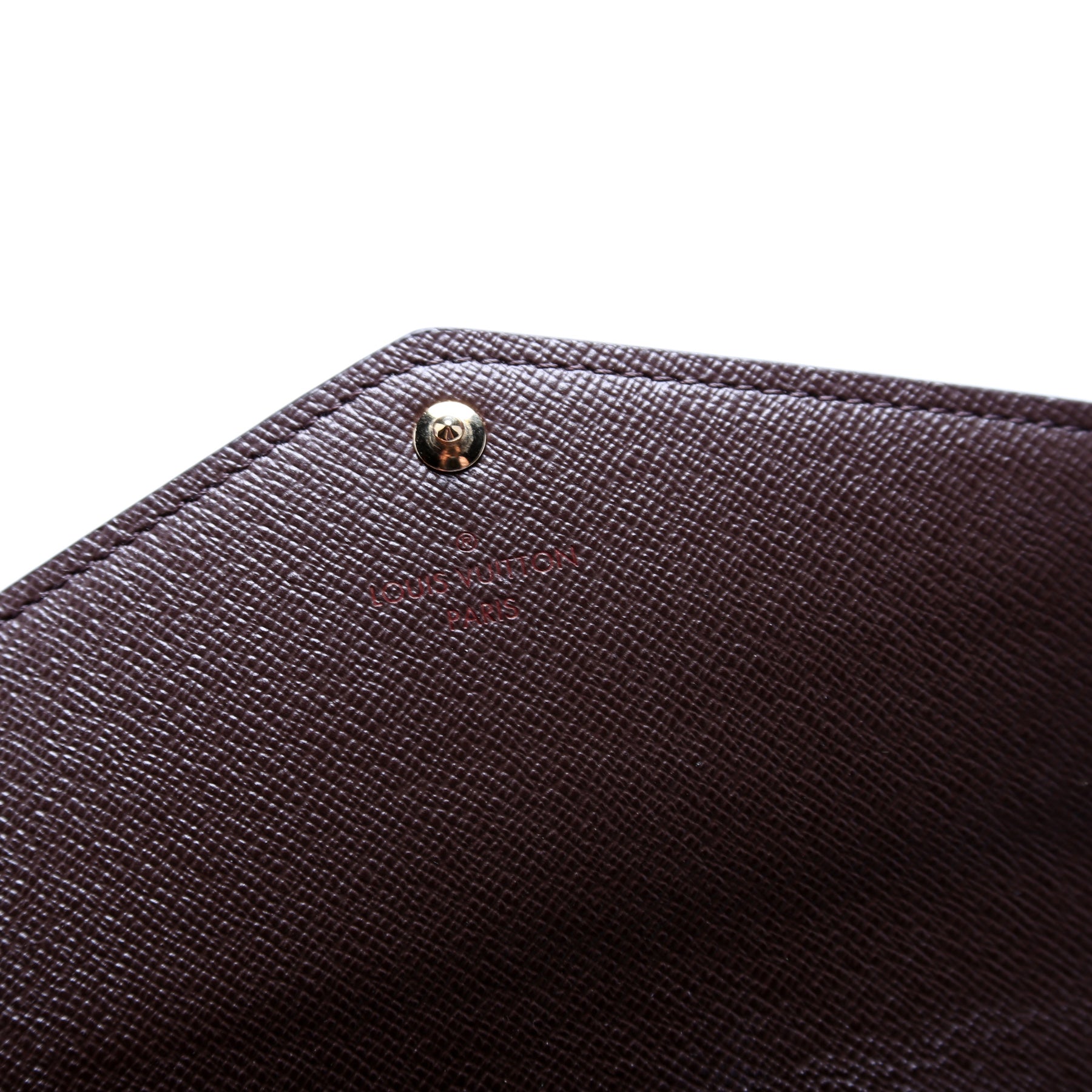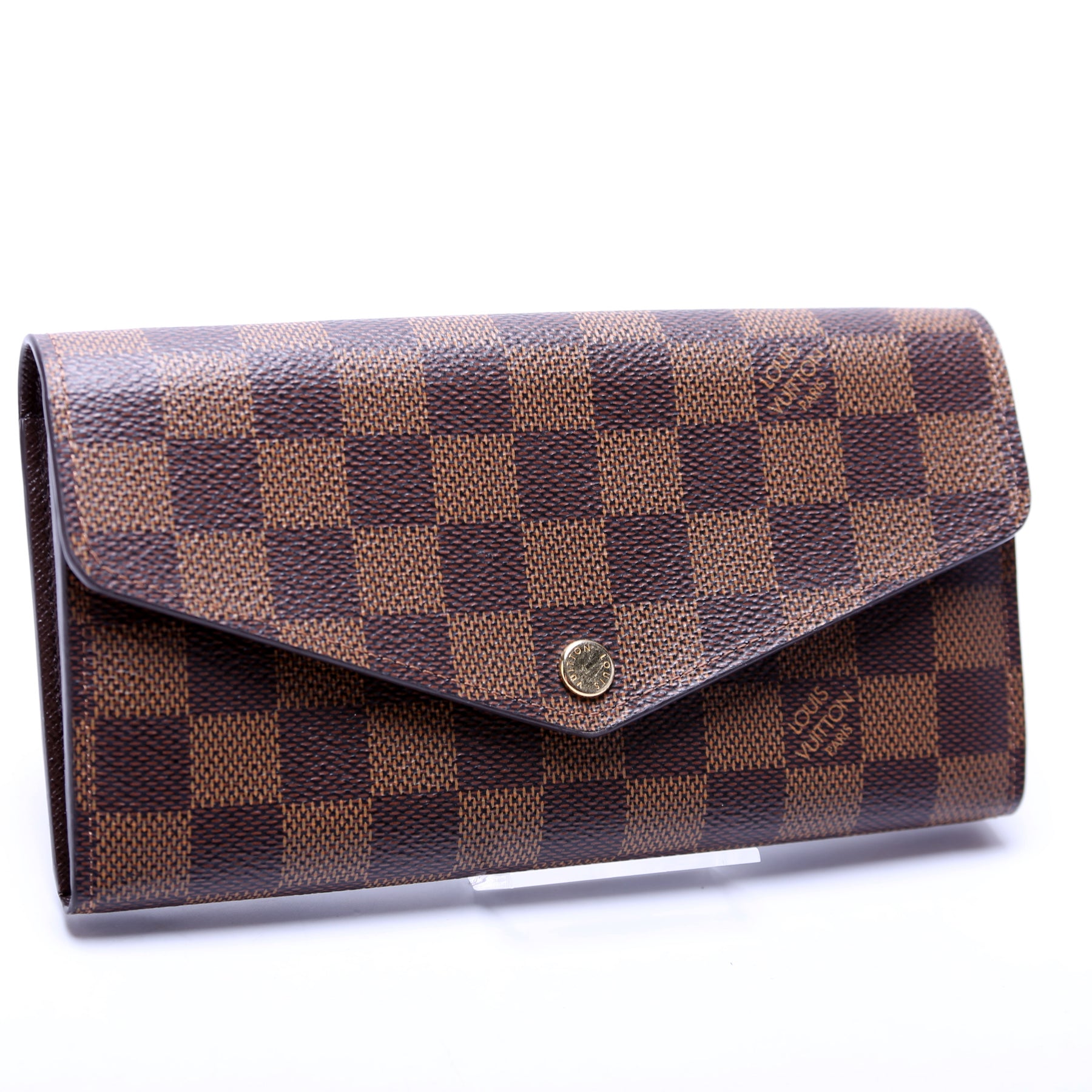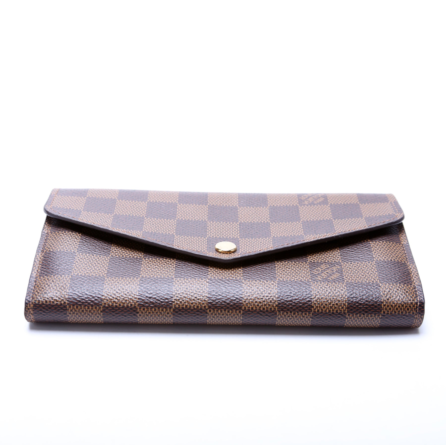 This pre-owned Louis Vuitton Sarah Wallet is guaranteed 100% authentic. The exterior is in the classic Louis Vuitton Damier Ebene coated canvas.