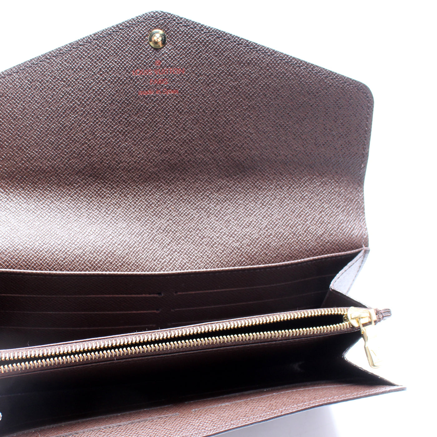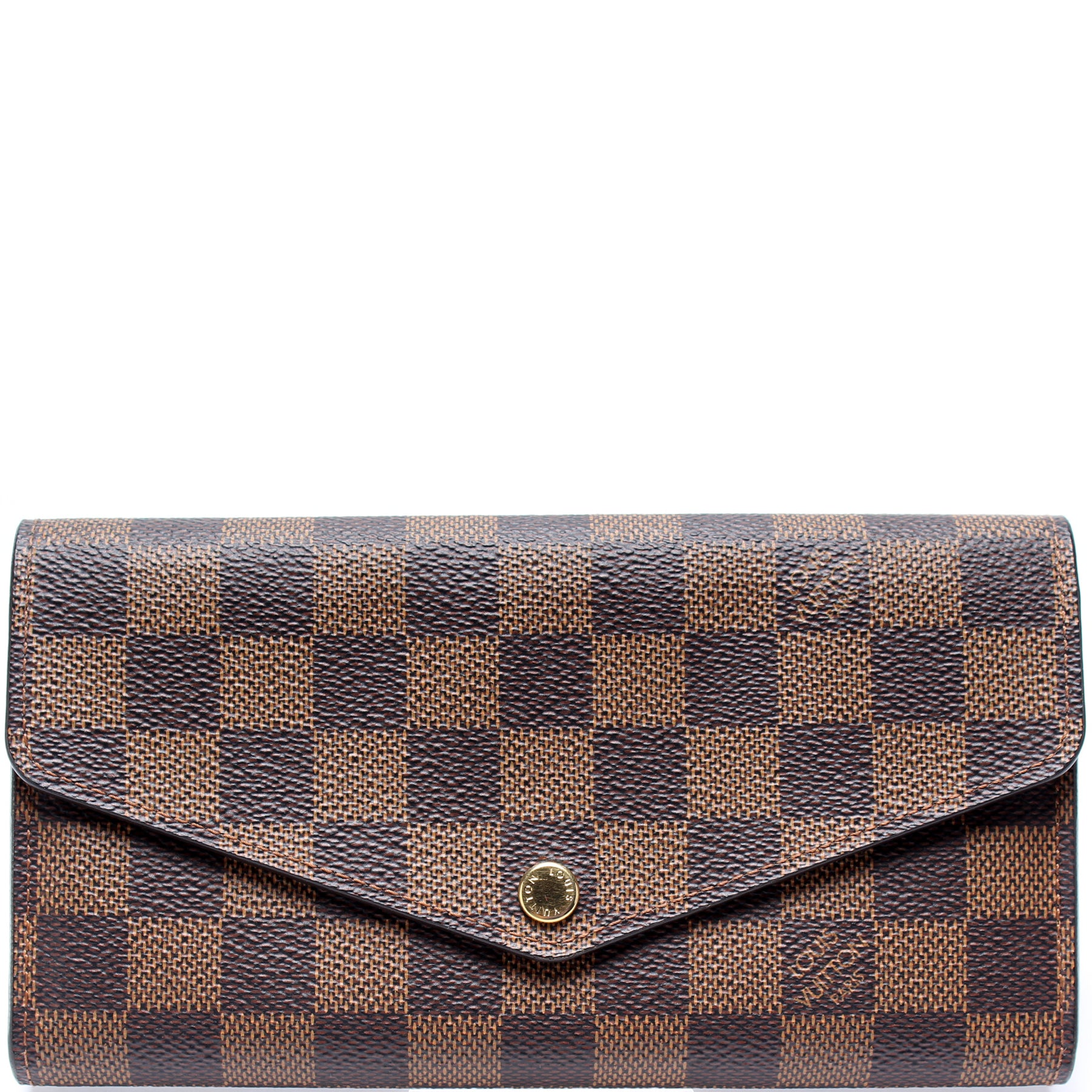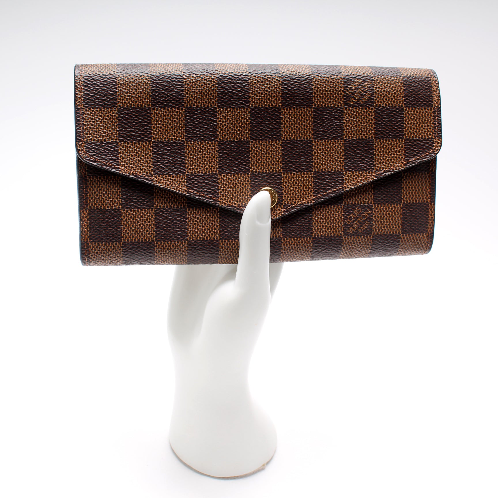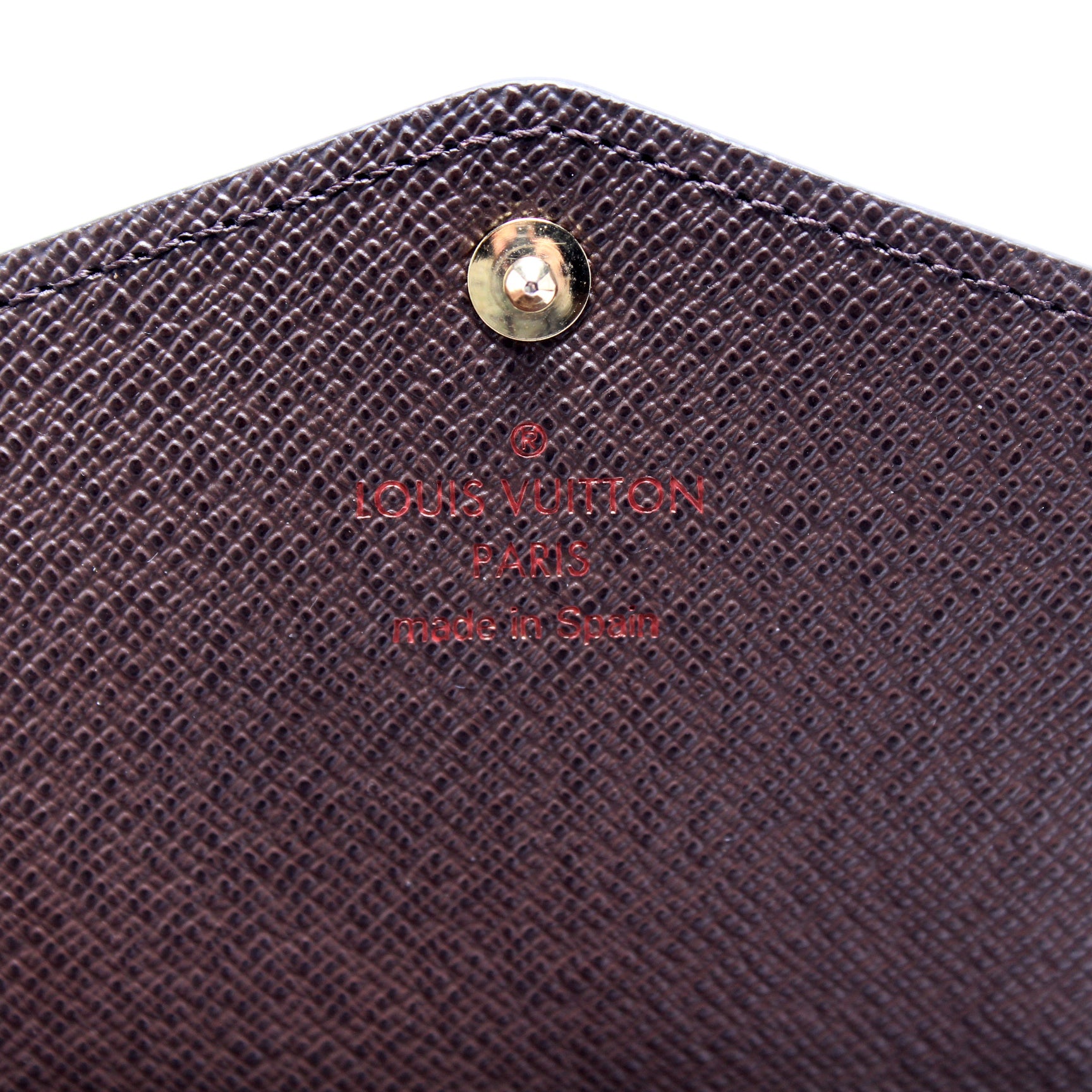 This pre-owned Louis Vuitton Sarah Wallet is guaranteed 100% authentic. The exterior is in the classic Louis Vuitton Damier Ebene coated canvas.