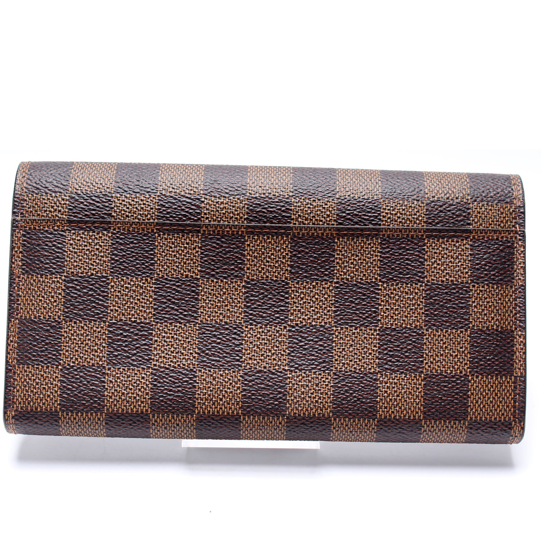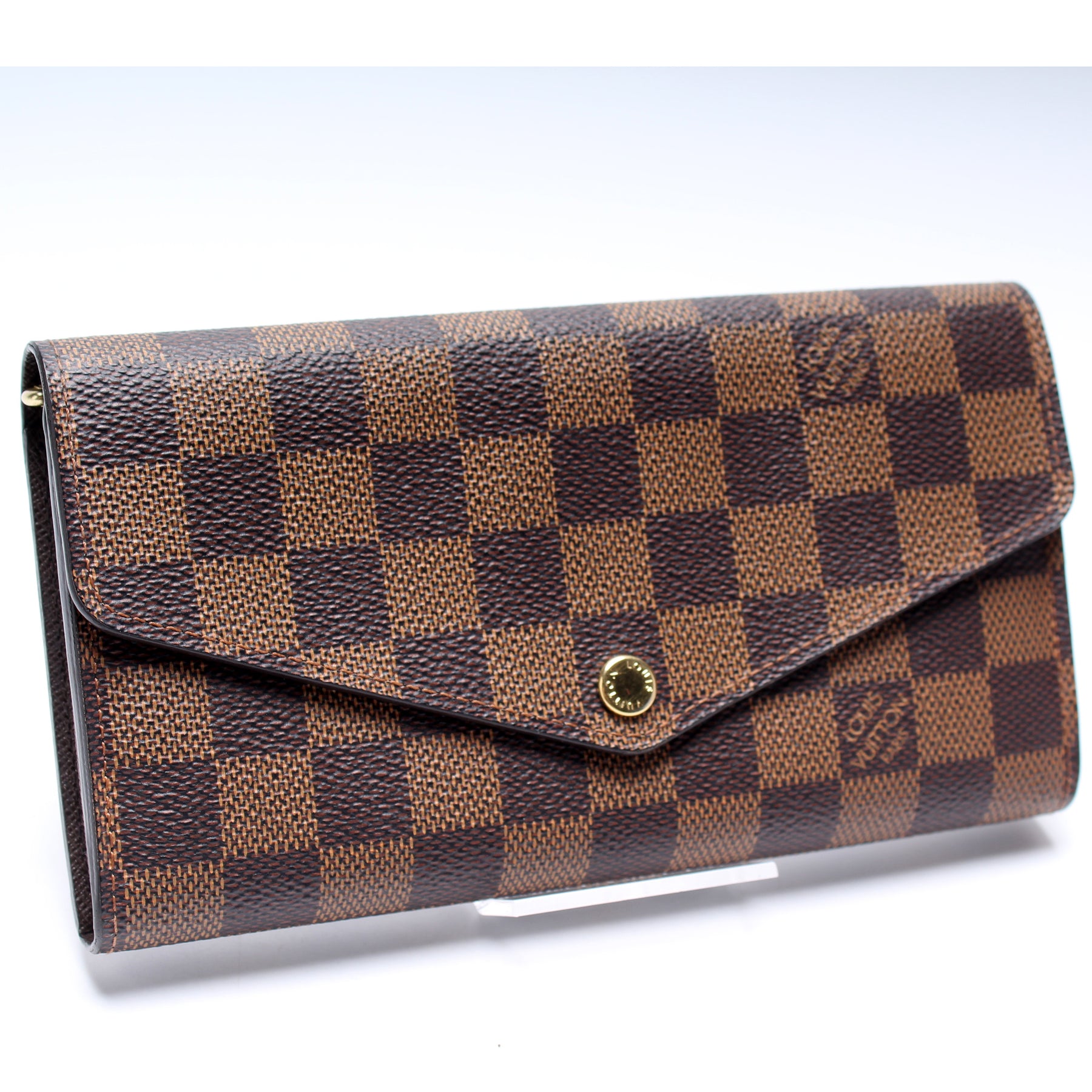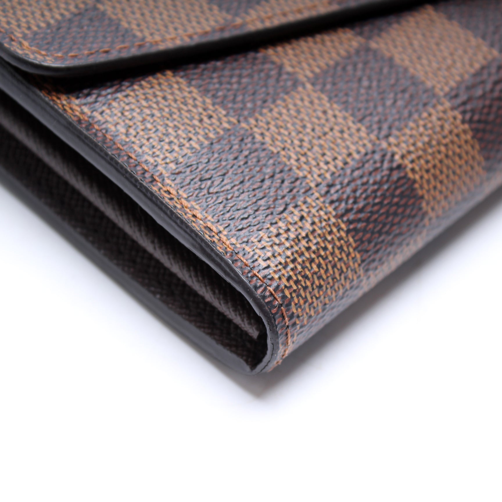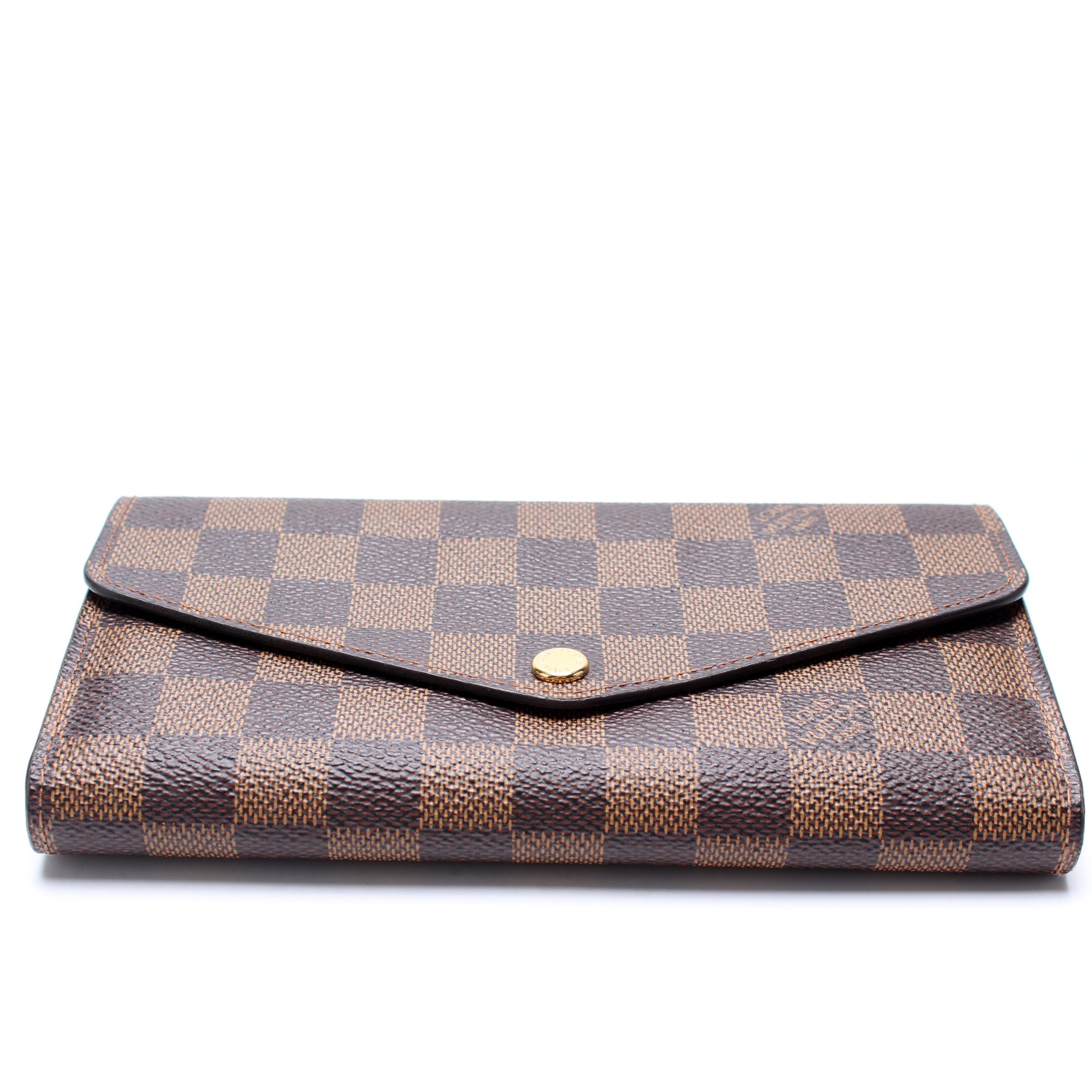 This pre-owned Louis Vuitton Sarah Wallet is guaranteed 100% authentic. The exterior is in the classic Louis Vuitton Damier Ebene coated canvas.