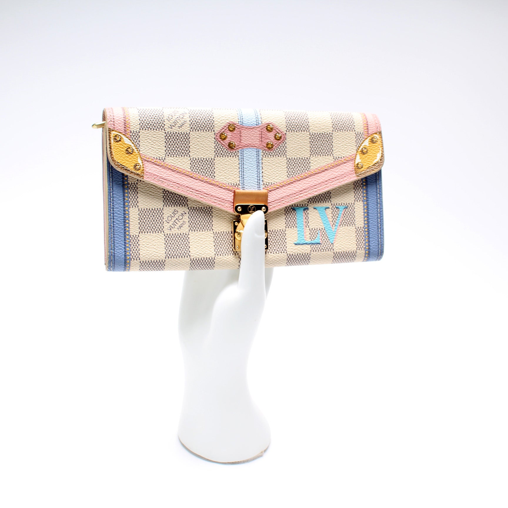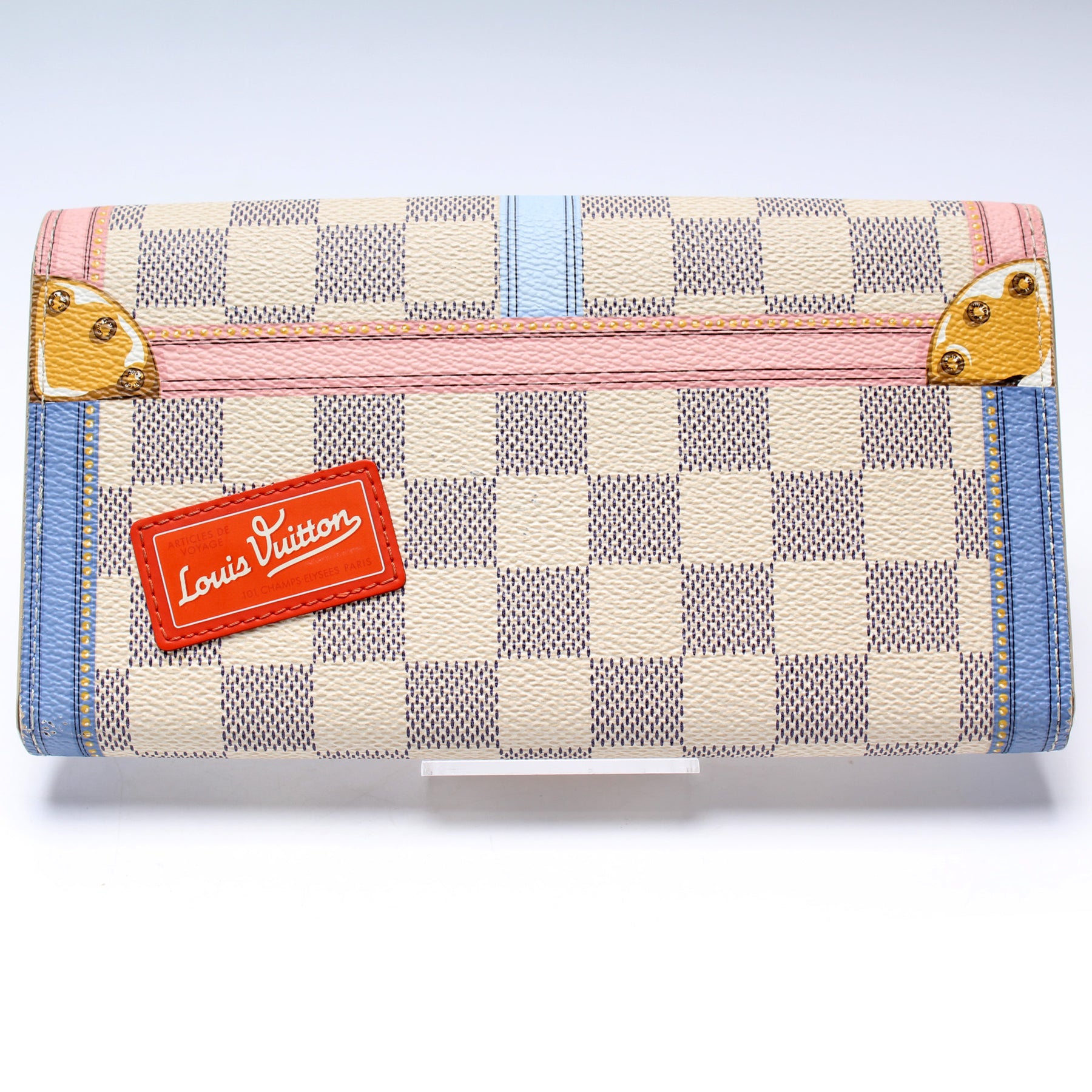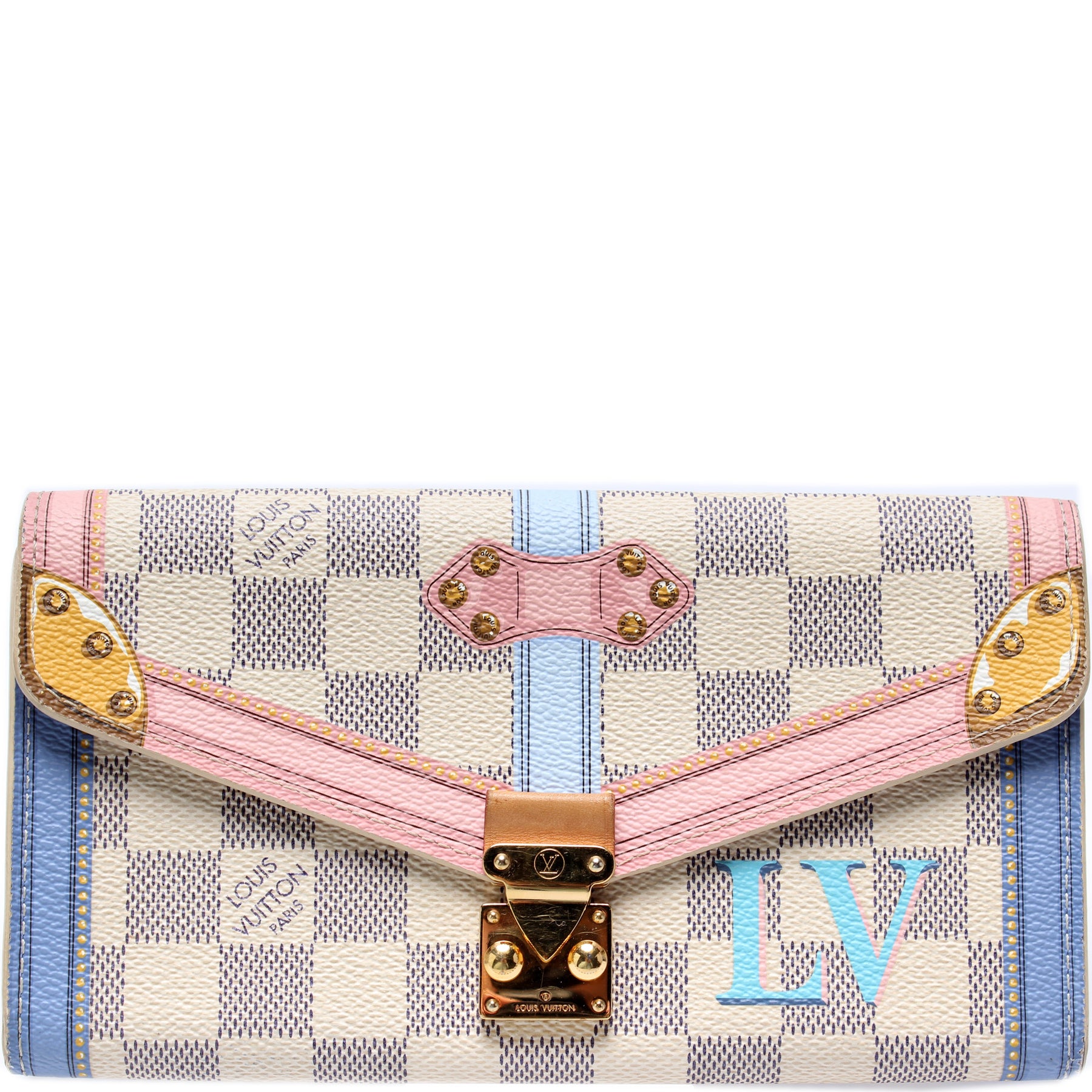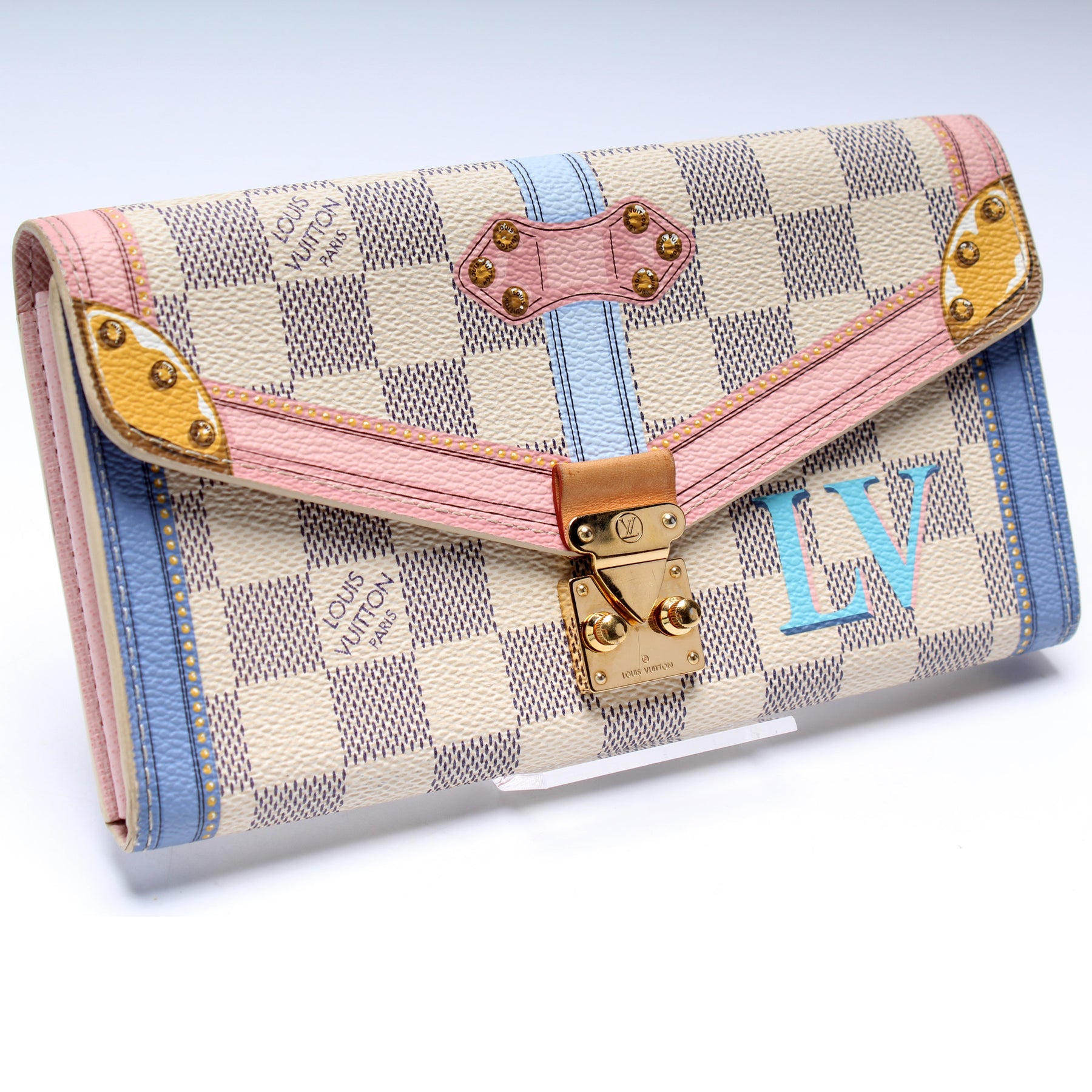 This pre-owned Louis Vuitton Sarah Wallet is guaranteed 100% authentic. The exterior is in the classic Louis Vuitton Summer Trunks/Damier Azur coated canvas.