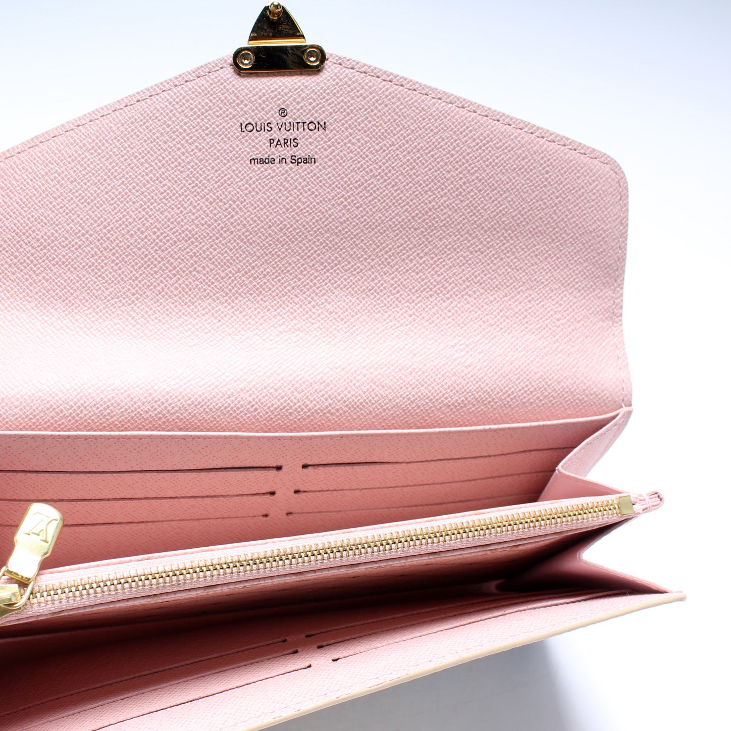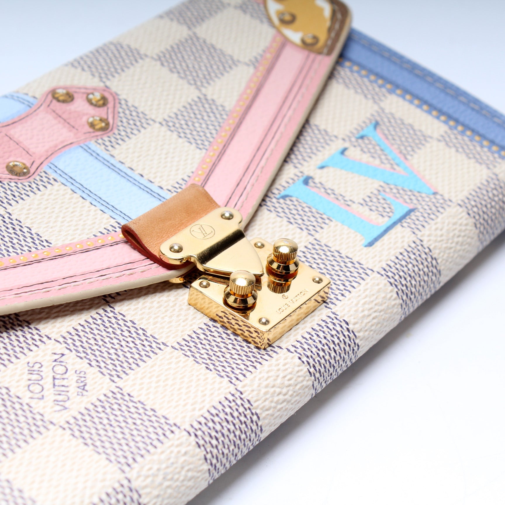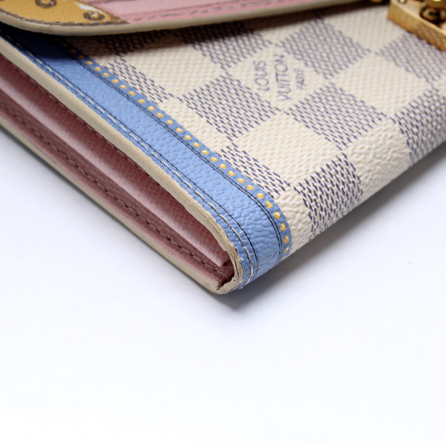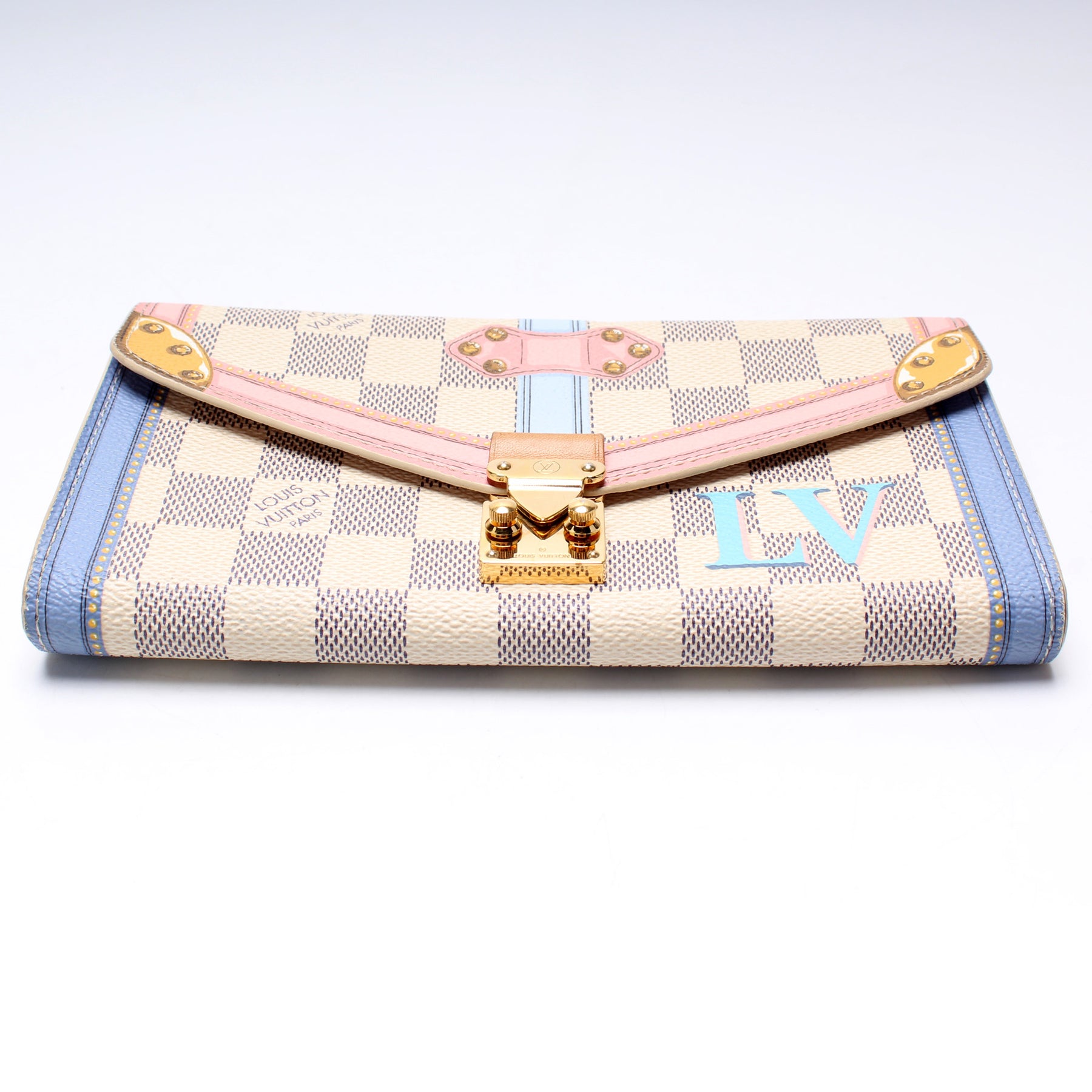 This pre-owned Louis Vuitton Sarah Wallet is guaranteed 100% authentic. The exterior is in the classic Louis Vuitton Summer Trunks/Damier Azur coated canvas.