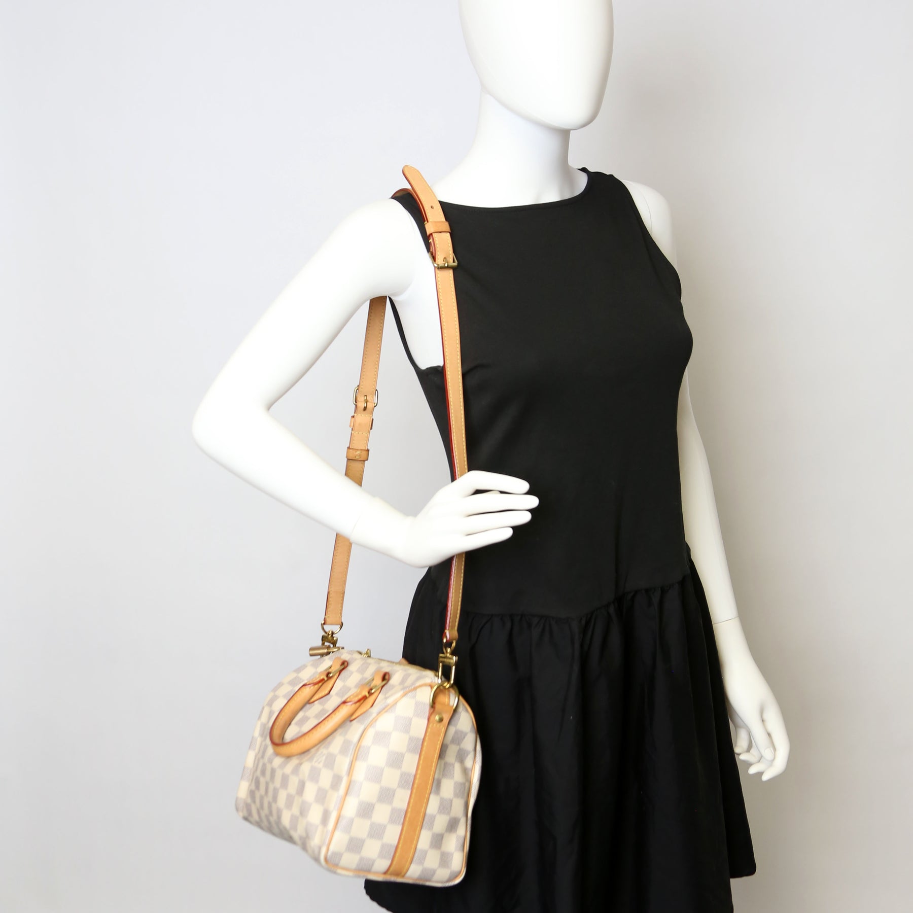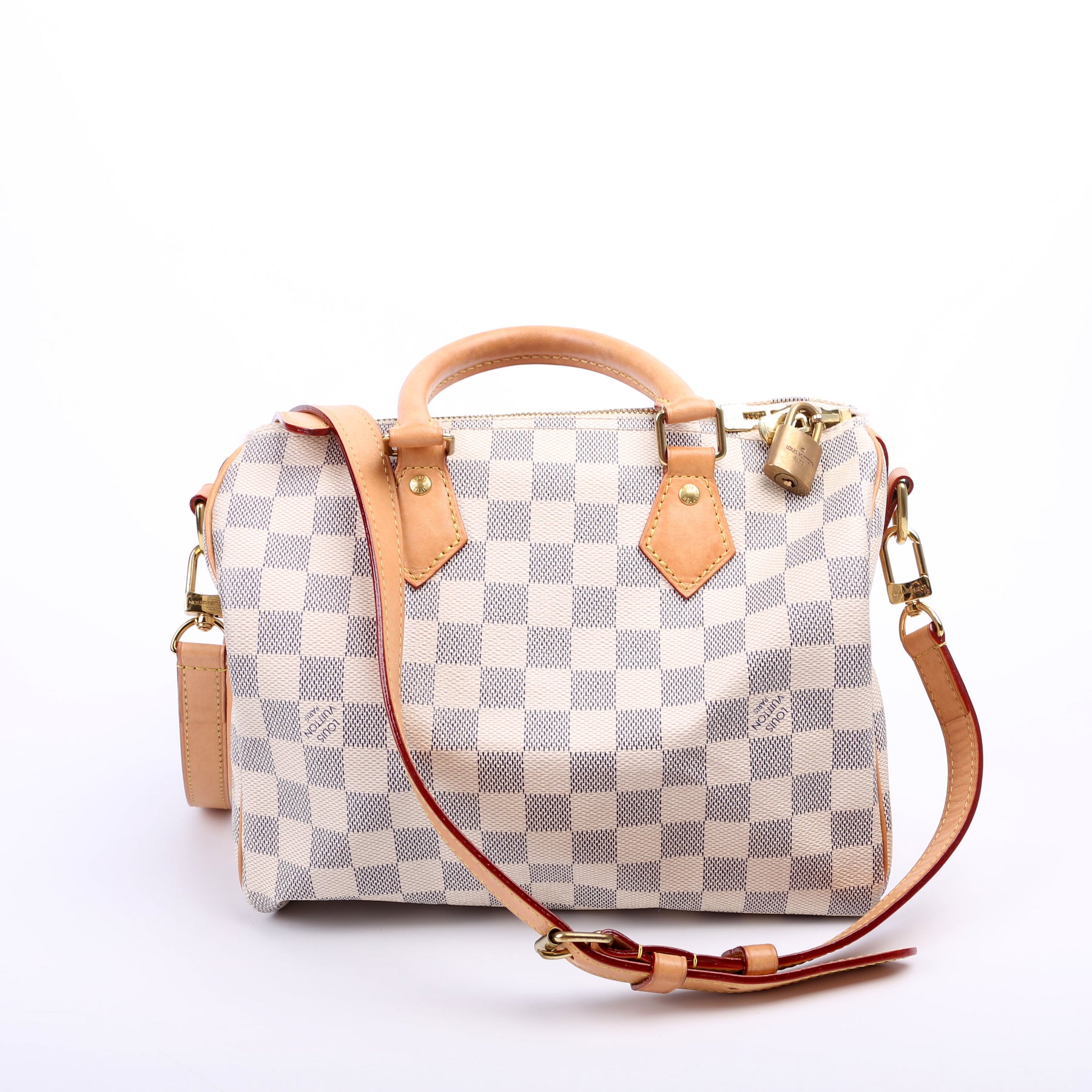 This pre-owned Louis Vuitton Speedy 25 Bandouliere is guaranteed 100% authentic. The exterior is in the classic Louis Vuitton Damier Azur coated canvas.