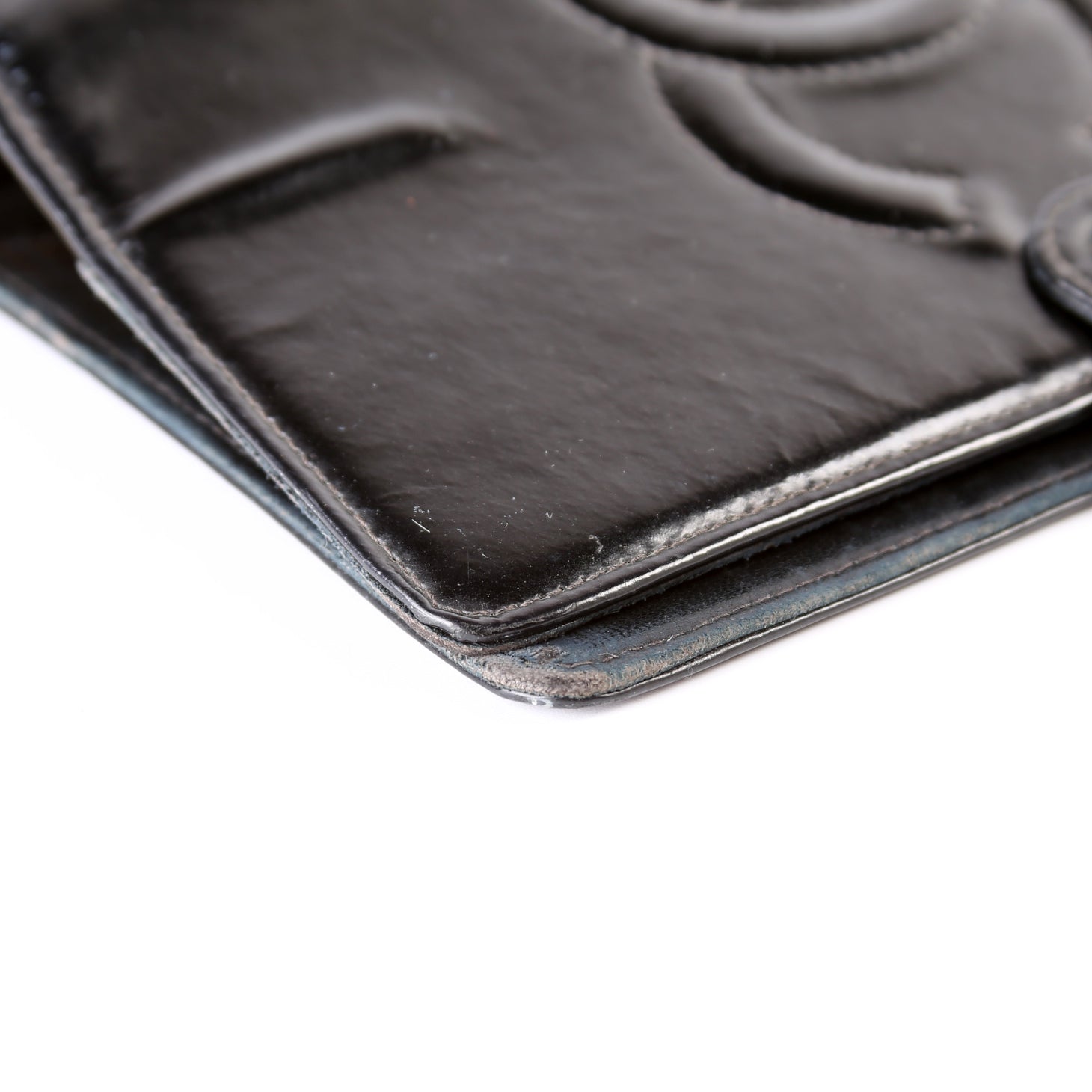 Exterior: The exterior leather has wear throughout. There is scuffing on the button and along the patent leather throughout. The back shows white scuffing as pictured.