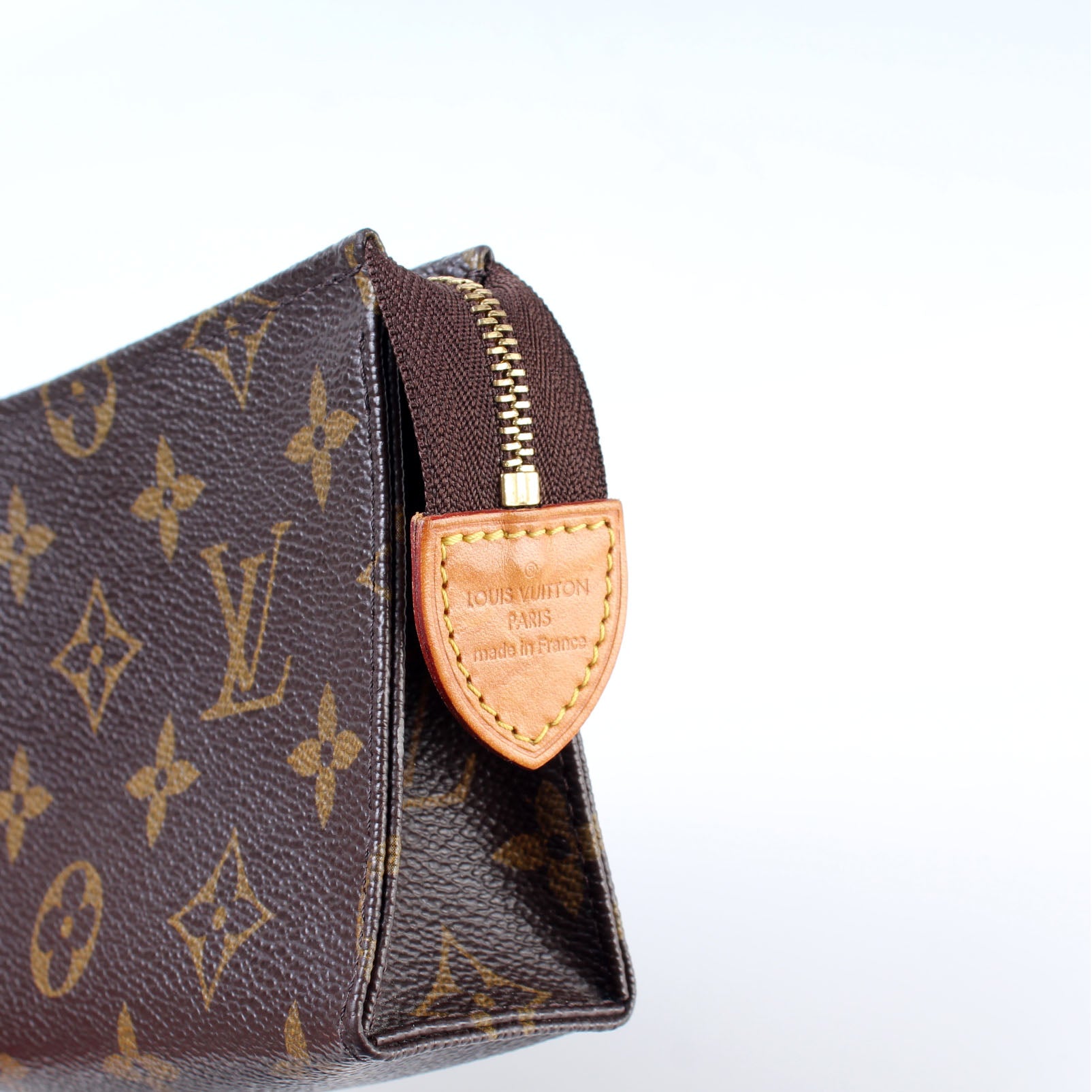This pre-owned Louis Vuitton Toiletry Pouch 15 is guaranteed 100% authentic. The exterior is in the classic Louis Vuitton Monogram coated canvas.