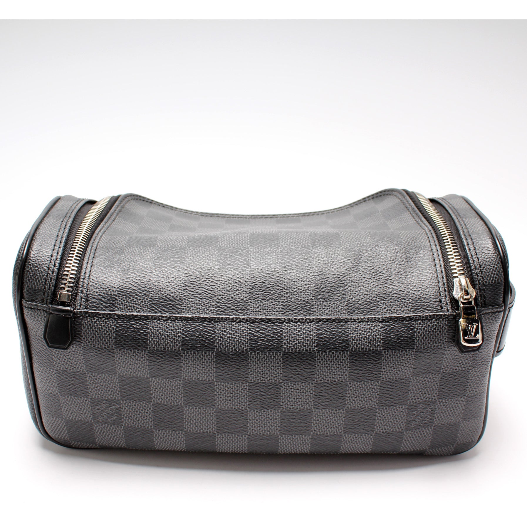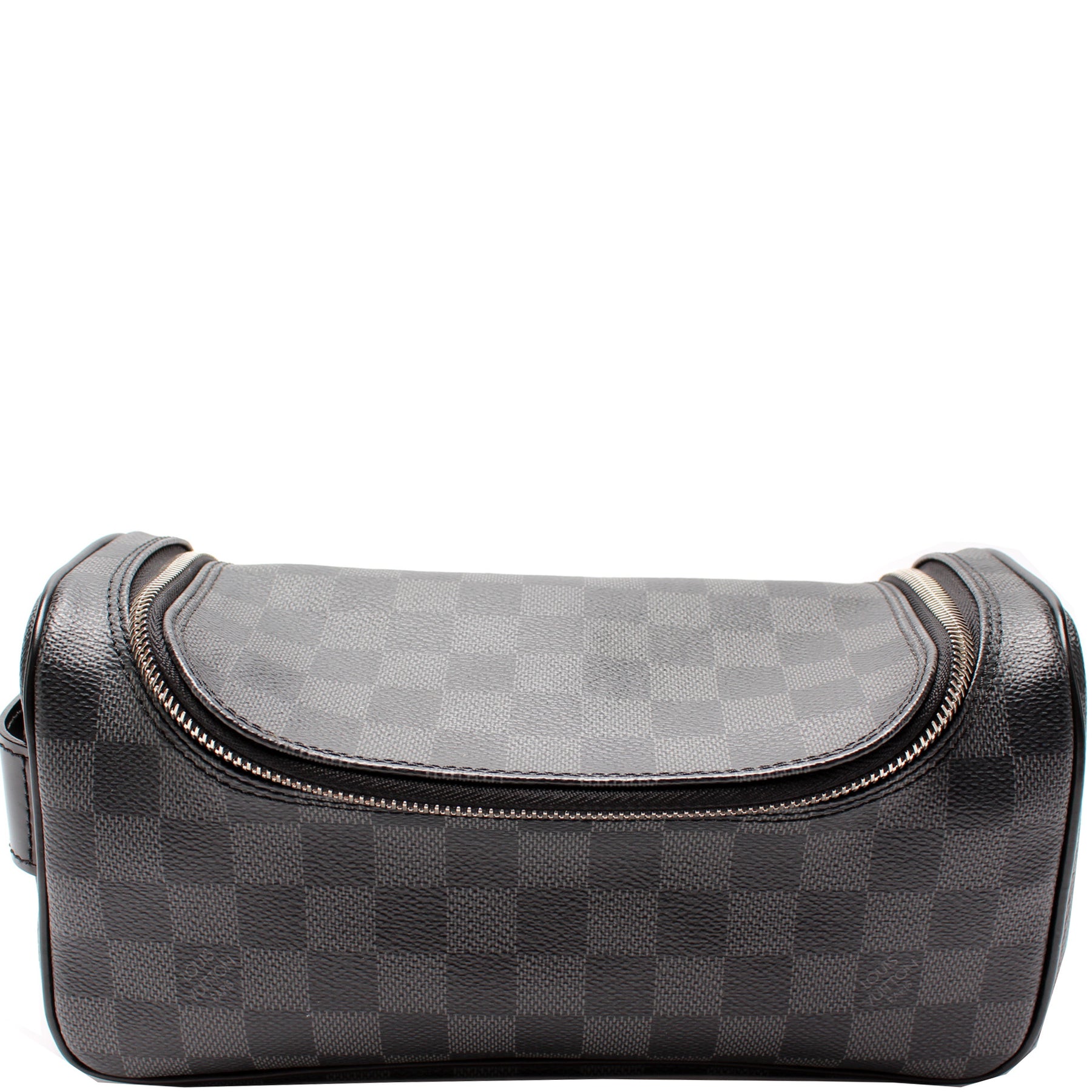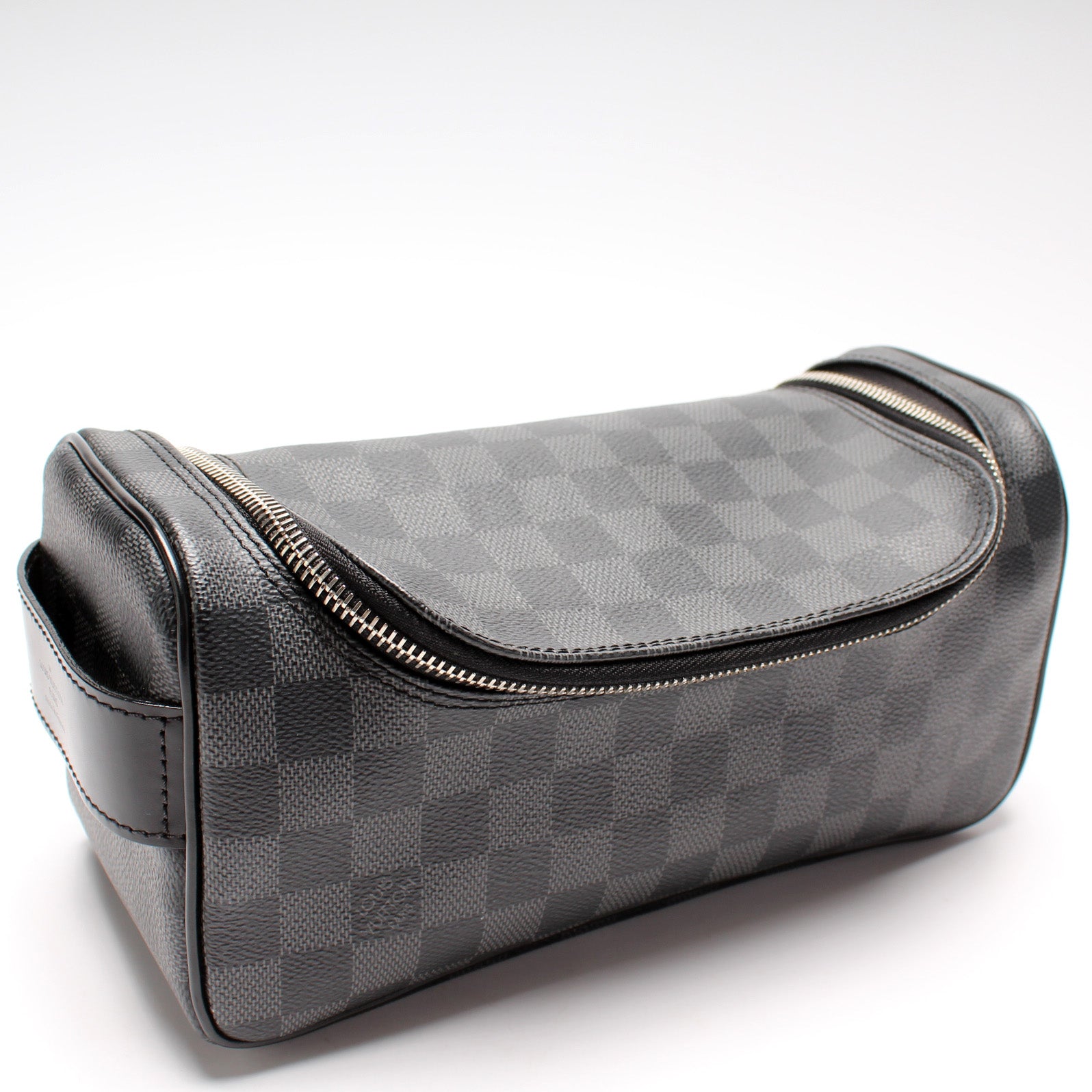 This pre-owned Louis Vuitton Toiletry Pouch is guaranteed 100% authentic. The exterior is in the classic Louis Vuitton Damier Graphite coated canvas.