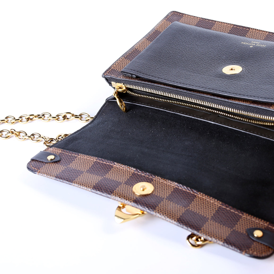 This pre-owned Louis Vuitton Vavin Chain Wallet is guaranteed 100% authentic. The exterior is in the classic Louis Vuitton Damier Ebene coated canvas.