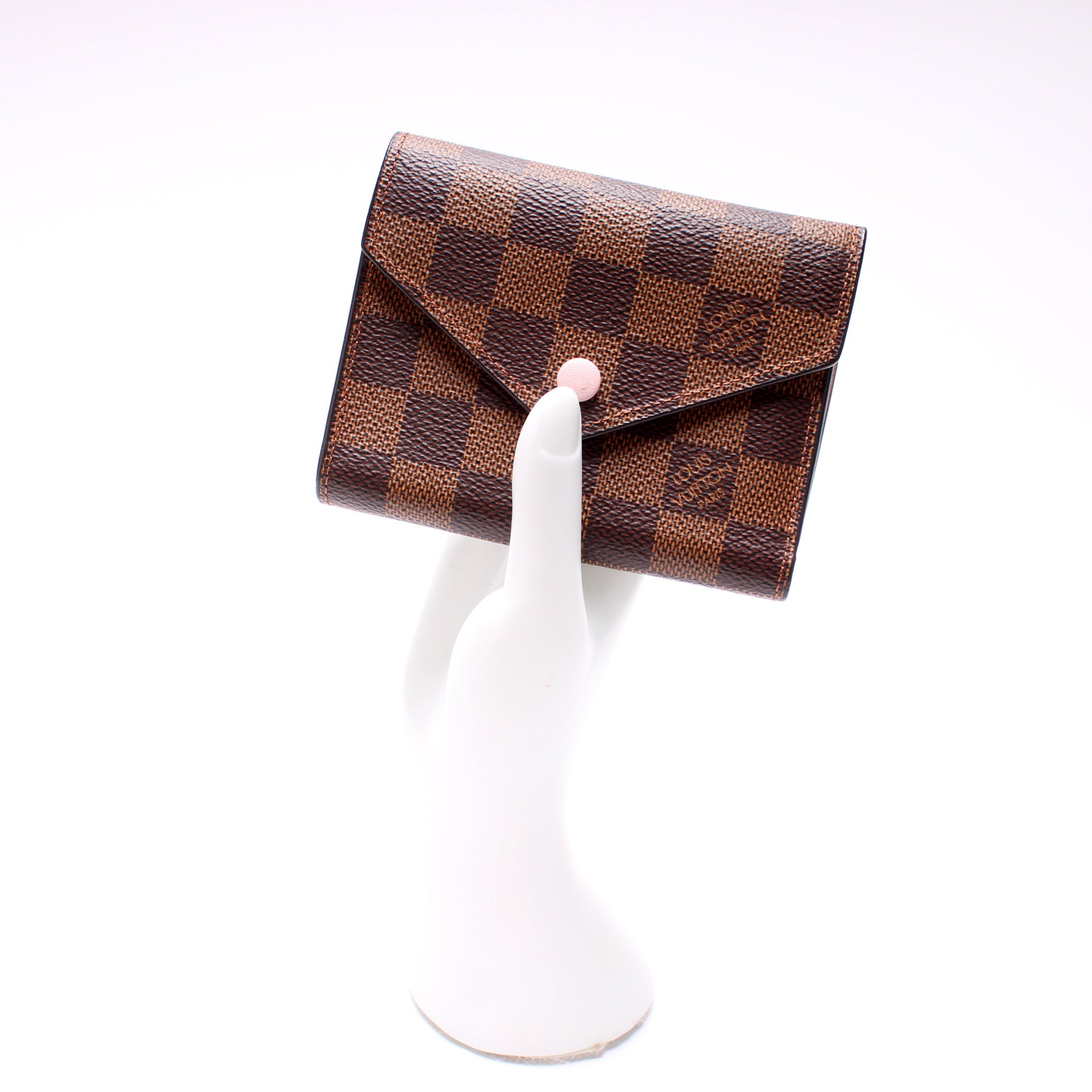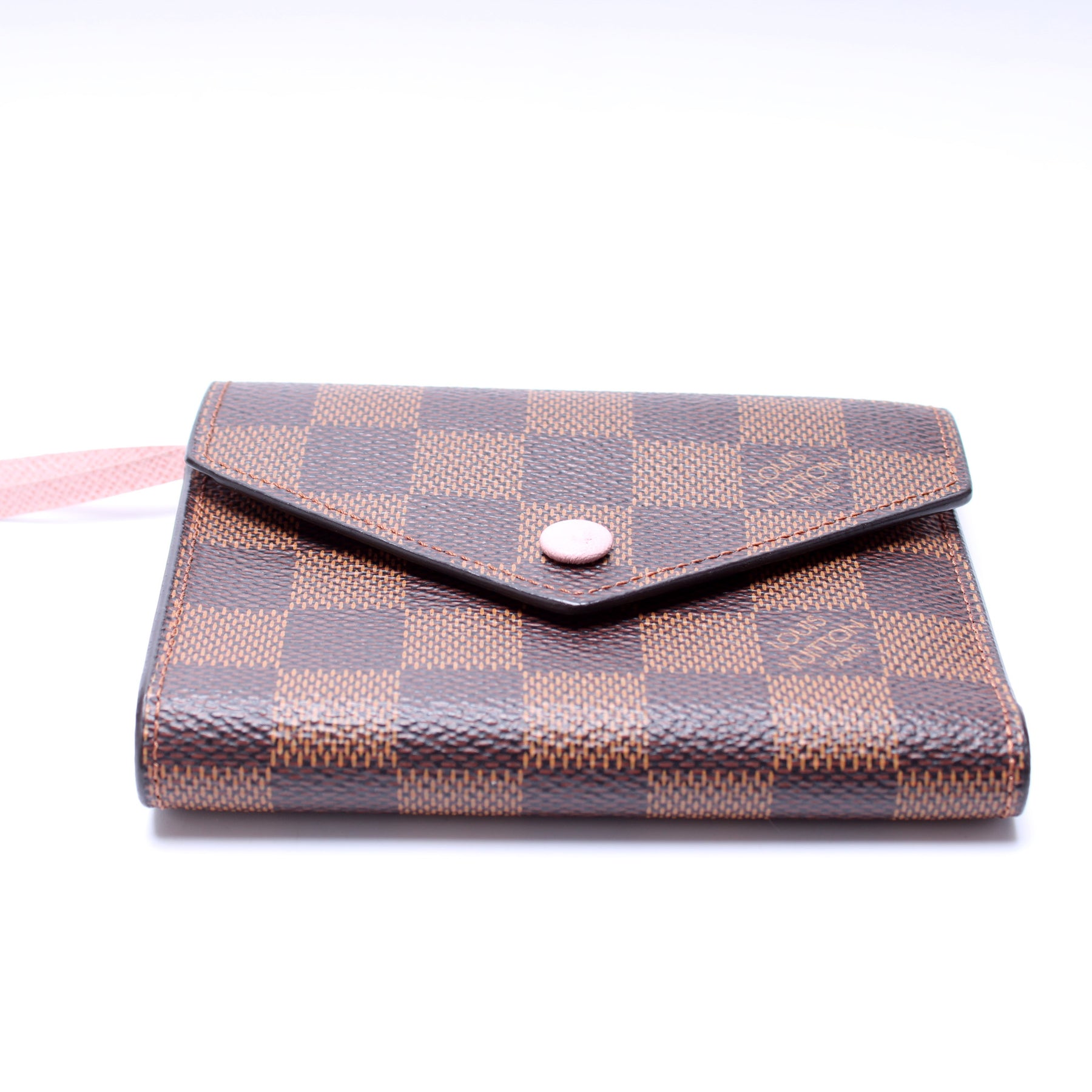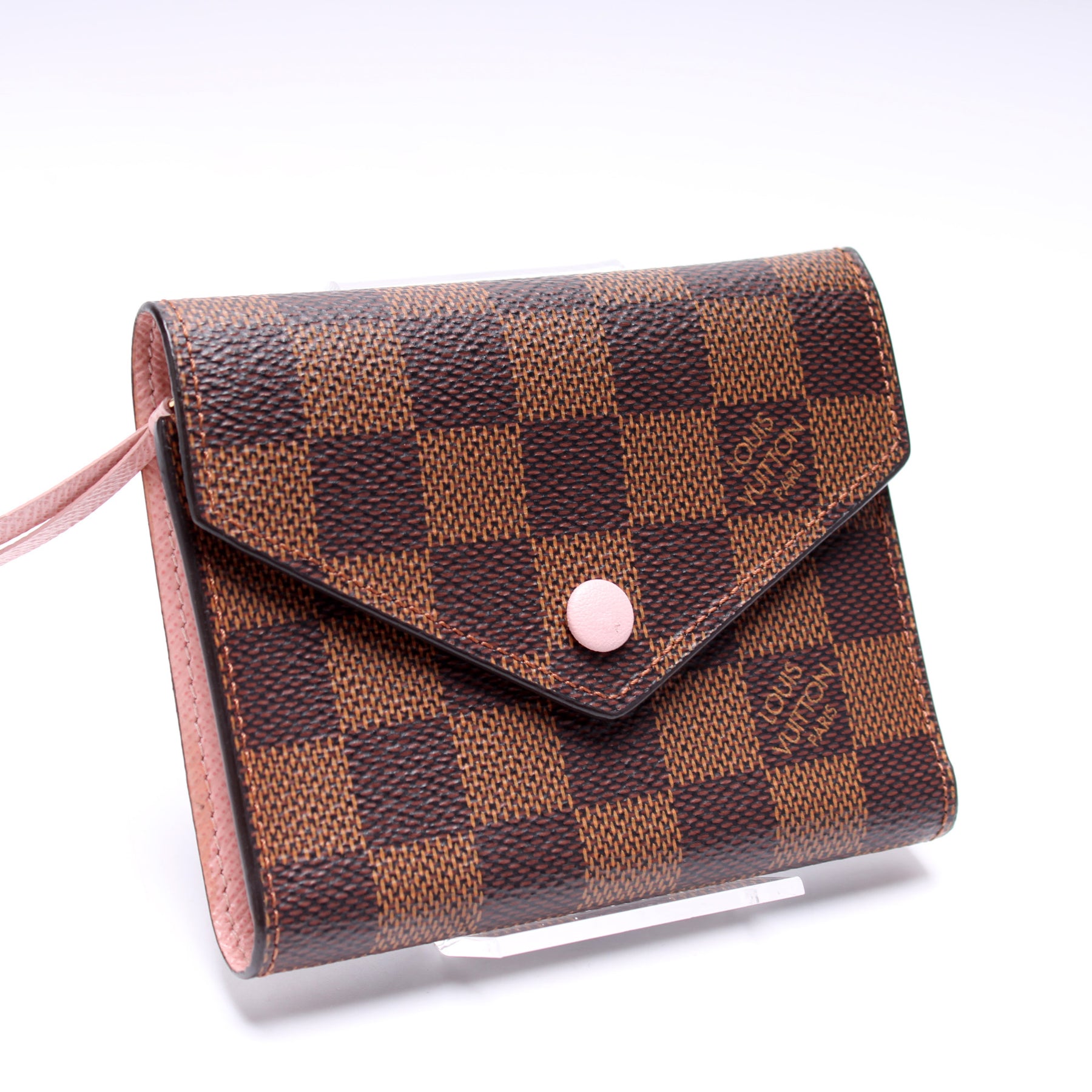 This pre-owned Louis Vuitton Victorine Wallet is guaranteed 100% authentic. The exterior is in the classic Louis Vuitton Damier Ebene coated canvas.