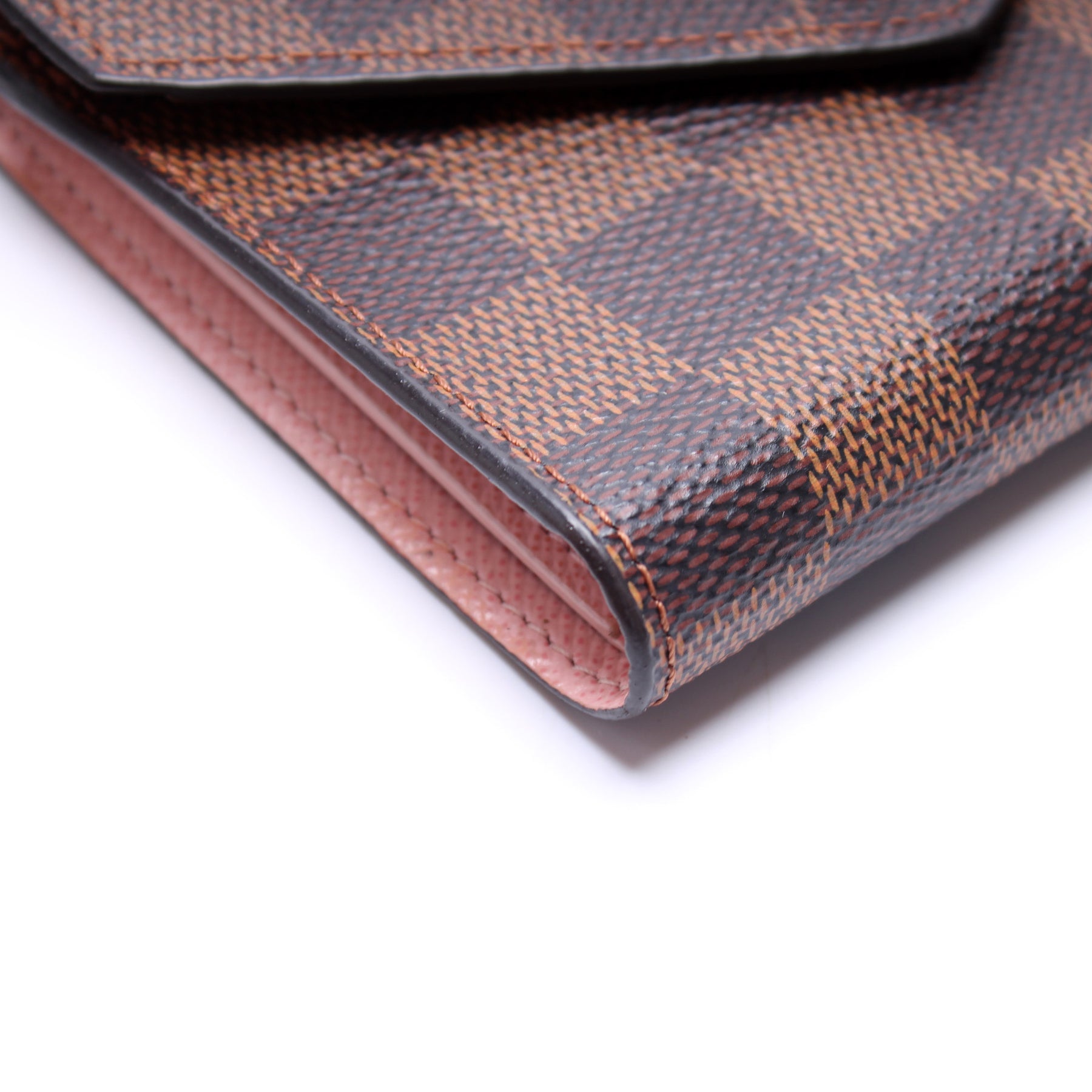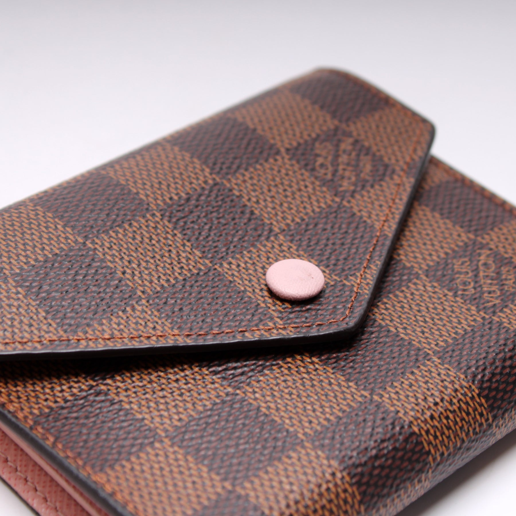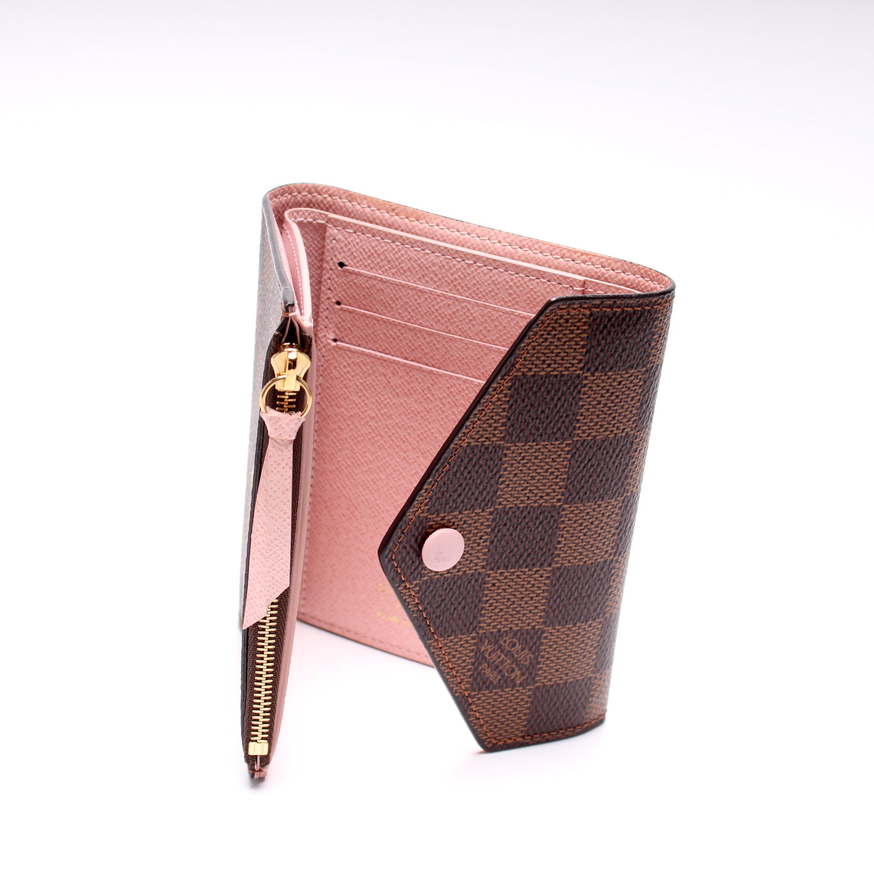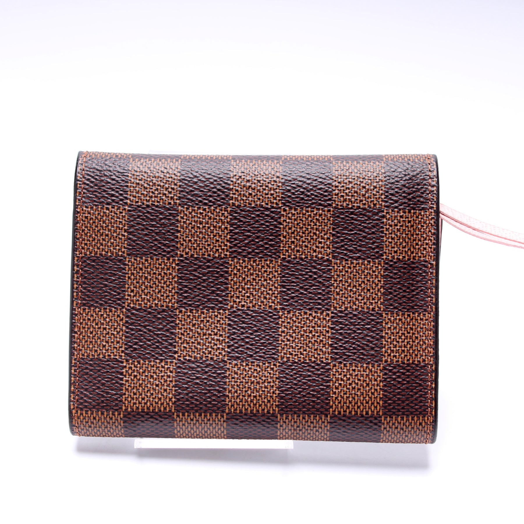 This pre-owned Louis Vuitton Victorine Wallet is guaranteed 100% authentic. The exterior is in the classic Louis Vuitton Damier Ebene coated canvas.