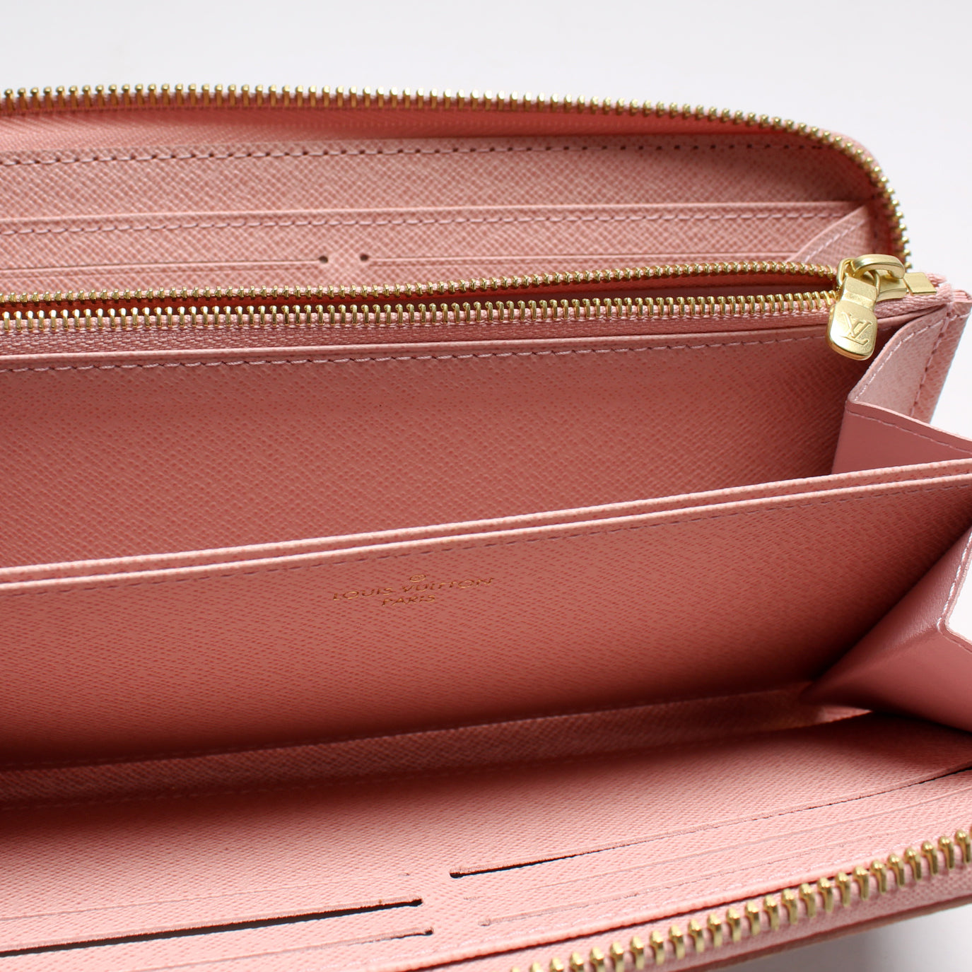 Interior: The interior shows light wear throughout. The interior features one zip closure coin pouch, six bill slots, and twelve card slots. There is minor discoloration to the zipper pocket interior.