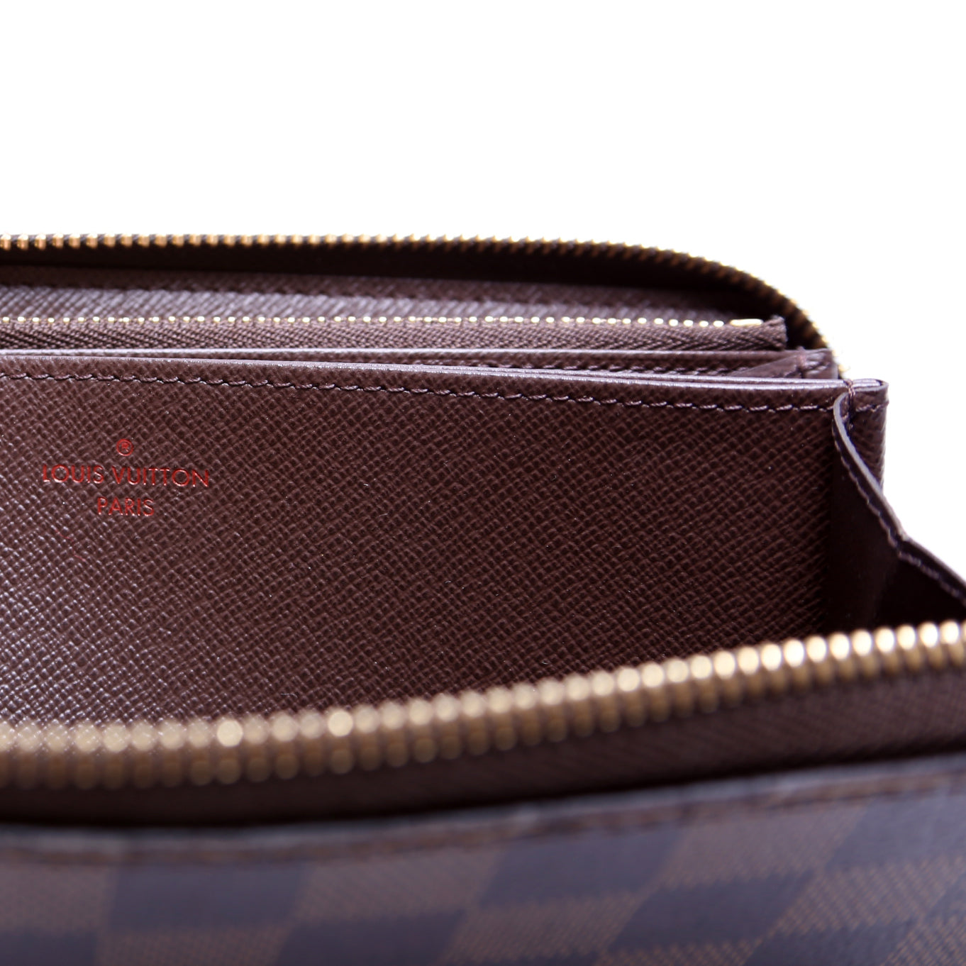 This pre-owned Louis Vuitton Zippy Wallet is guaranteed 100% authentic. The exterior is in the classic Louis Vuitton Damier Ebene coated canvas.