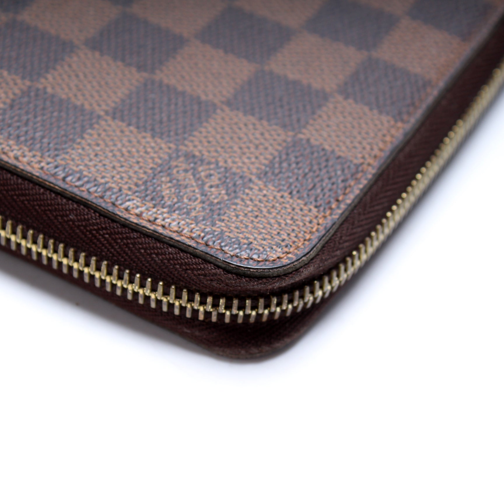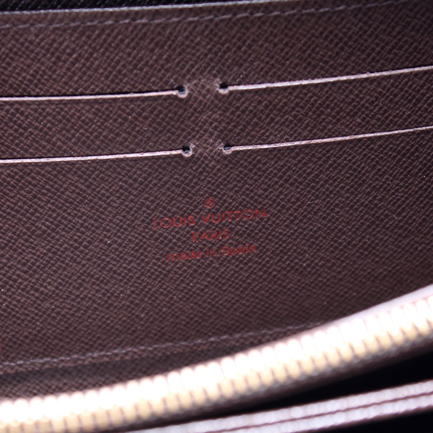 This pre-owned Louis Vuitton Zippy Wallet is guaranteed 100% authentic. The exterior is in the classic Louis Vuitton Damier Ebene coated canvas.