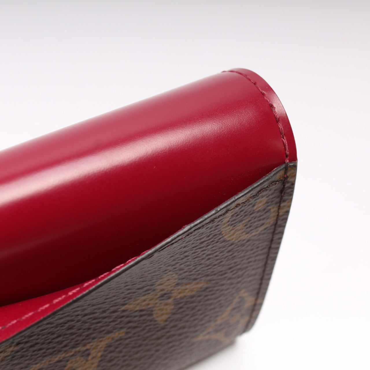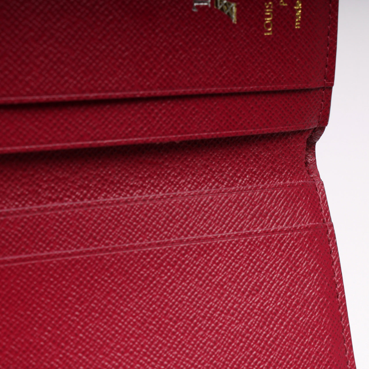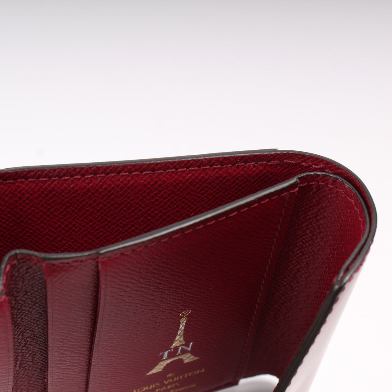 Interior: The interior is clean and free of rips or tears. The interior features four card slots, one bill slot, and one zippered coin pocket. There is a monogrammed heat stamp 'TN' on the interior as pictured.